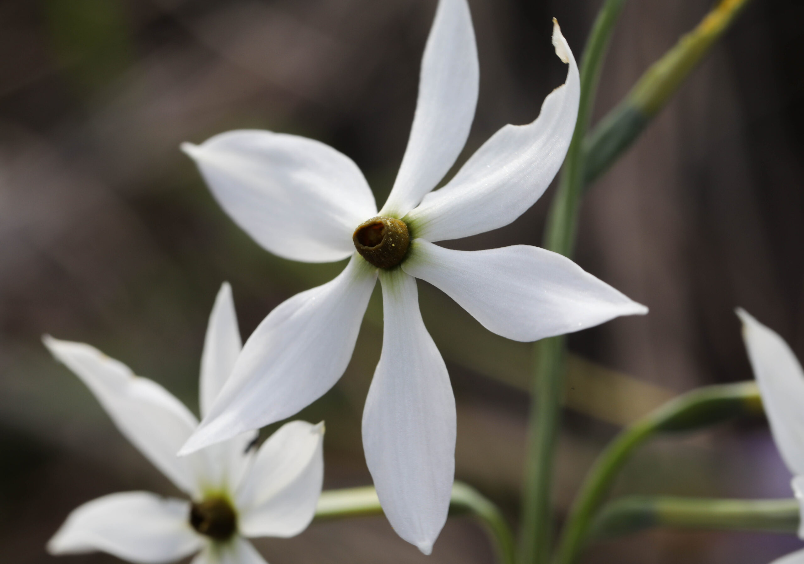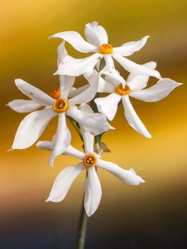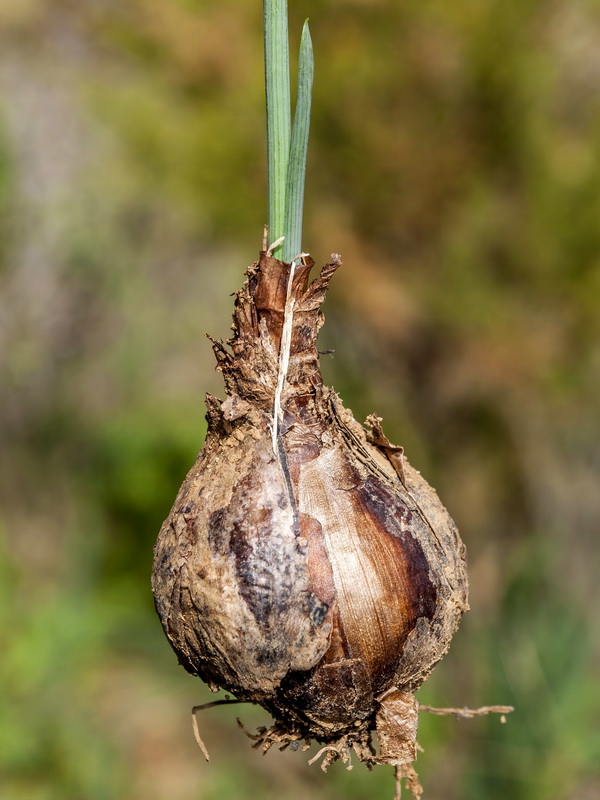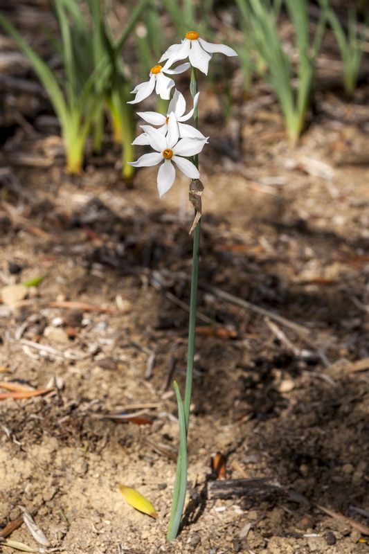 Narcissus obsoletus (Haw.) Spach / Heterotypic Synonyms: Narcissus elegans (Haw.) Spach, it is a perennial herb – geophyte. The ovoid bulb is 1-2.5 cm in diameter and is covered with a hard, dark brown scale. The leaves grow from the bulb, they are 2, linear, about 2 mm wide. The stems are 10-30 cm high, usually bear single flowers (exceptionally 2), growing from the axils of a 2 cm long membranous quiver; flowers are 6-merous; perianth forms a 1-2 cm long tube, its tips are lanceolate, 1-2 cm long and 4-8 mm wide, pointed, white, the circular panicle is yellow-orange, 1-1.5 mm wide; sticks are 6; the testicle is lower. The fruit is a spherical capsule.