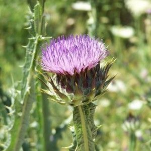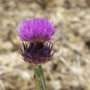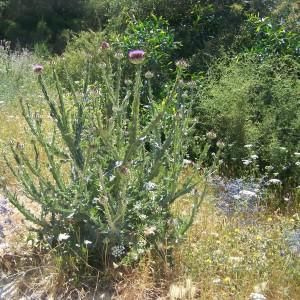Onopordum platylepis (Murb.) Murb. / Homotypic Synonyms: Onopordum confusum Pamp., it is a biennial plant, robust, spiny with a very tomentose, erect stem, sparsely branched with broad, spiny wings, reaching 50 to 150 cm in height. Leaves are lanceolate, the lower ones very large, pinnately lobed with broad, triangular, toothed, and spiny lobes; the upper leaves clasp the stem. The terminal flower head is very large, hemispherical, 5 to 6 cm across, pinkish-purple or violet, sometimes accompanied by smaller flower heads in the axils of the upper leaves. The involucral bracts are lanceolate, up to 10 mm wide, leathery, gradually tapering into a long, reddish, spreading spine that gives the flower head a bristly appearance. Obovate, sub tetragonal achene, transversely wrinkled, brown in color, surmounted by a deciduous pappus of ciliate bristles, 2 to 3 times longer than the achene itself.