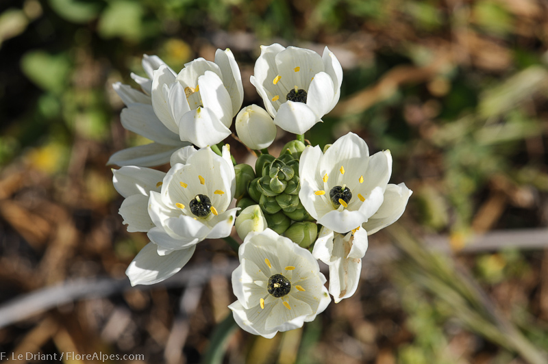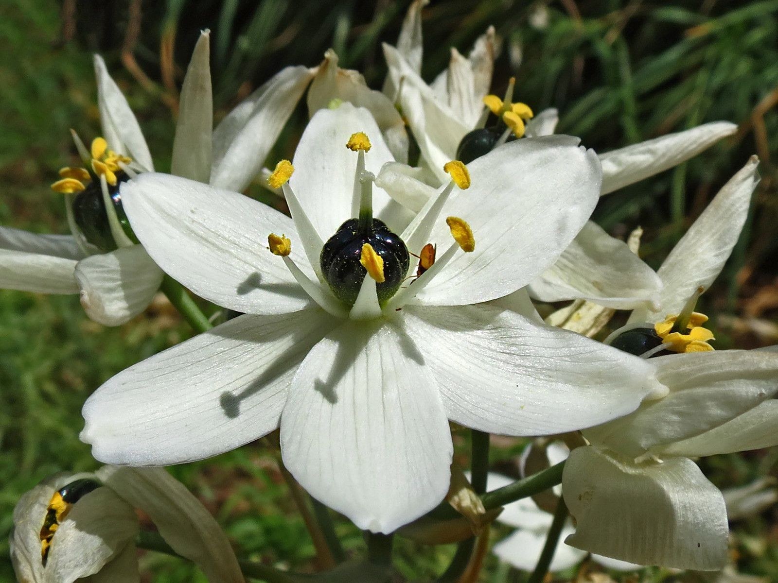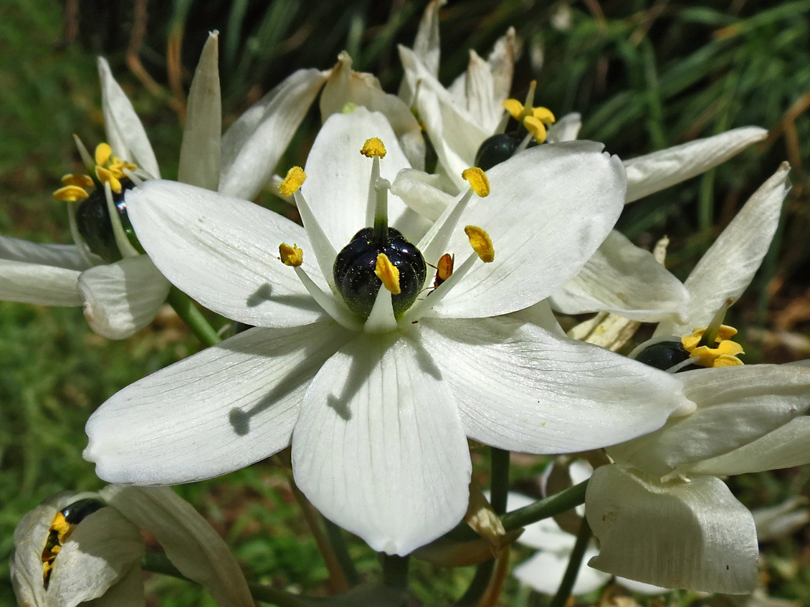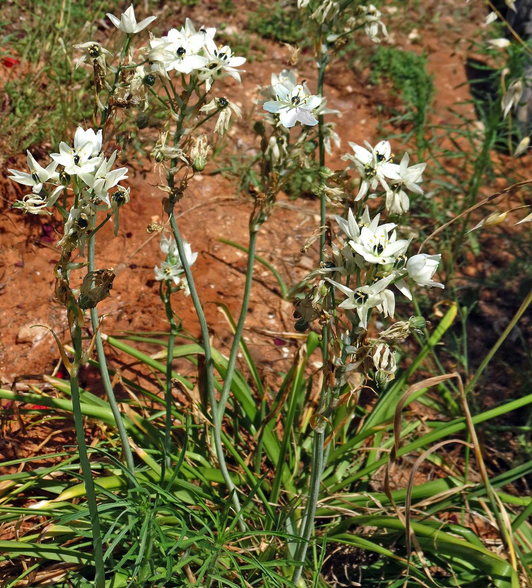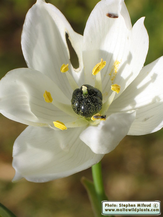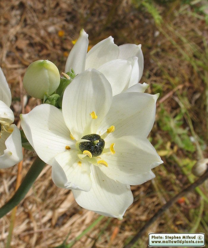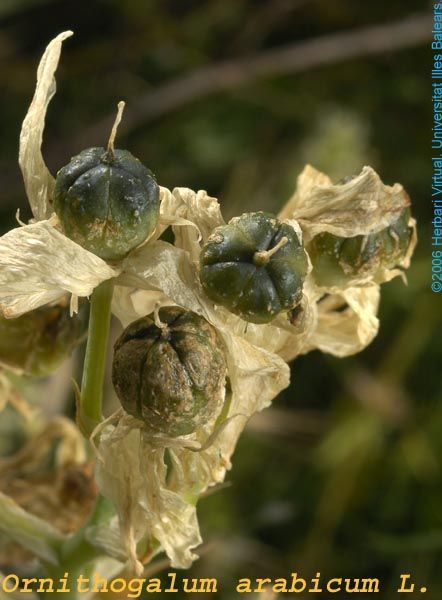 Ornithogalum arabicum L. it is a bulbous geophyte, Bulb ovoid 2-4 cm in diameter, tunics membranous, grayish in colour. Leaves linear, ± canaliculate, acute, 20-40 x 3 cm. Scapes 30-80 cm long, 8-20-flowercd; pedicels 3-5 cm long; bracts triangular-lanceolate, membranous, 2-5 cm long, straw coloured at top. Perianth stellate. Tepals elliptical, 1,5-2.5 x 0.6-1.3 cm, white inside, white-greenish outside; inner tepals usually papillose at lips. Stamens shorter than tepals, 0.7-1 cm long; filaments white ± deltate, narrowing towards the tip. Anthers oblong, c, 2 mm long, versatile, yellowish. Ovary dark-greenish at top, half green at bottom, obovoid, with 6 clear lobes and short style, 2-4 mm long, greenish at base, stigma capitate. Capsule ± ovoid-trilobed, c. 1.1-1.2 cm long; seeds black.