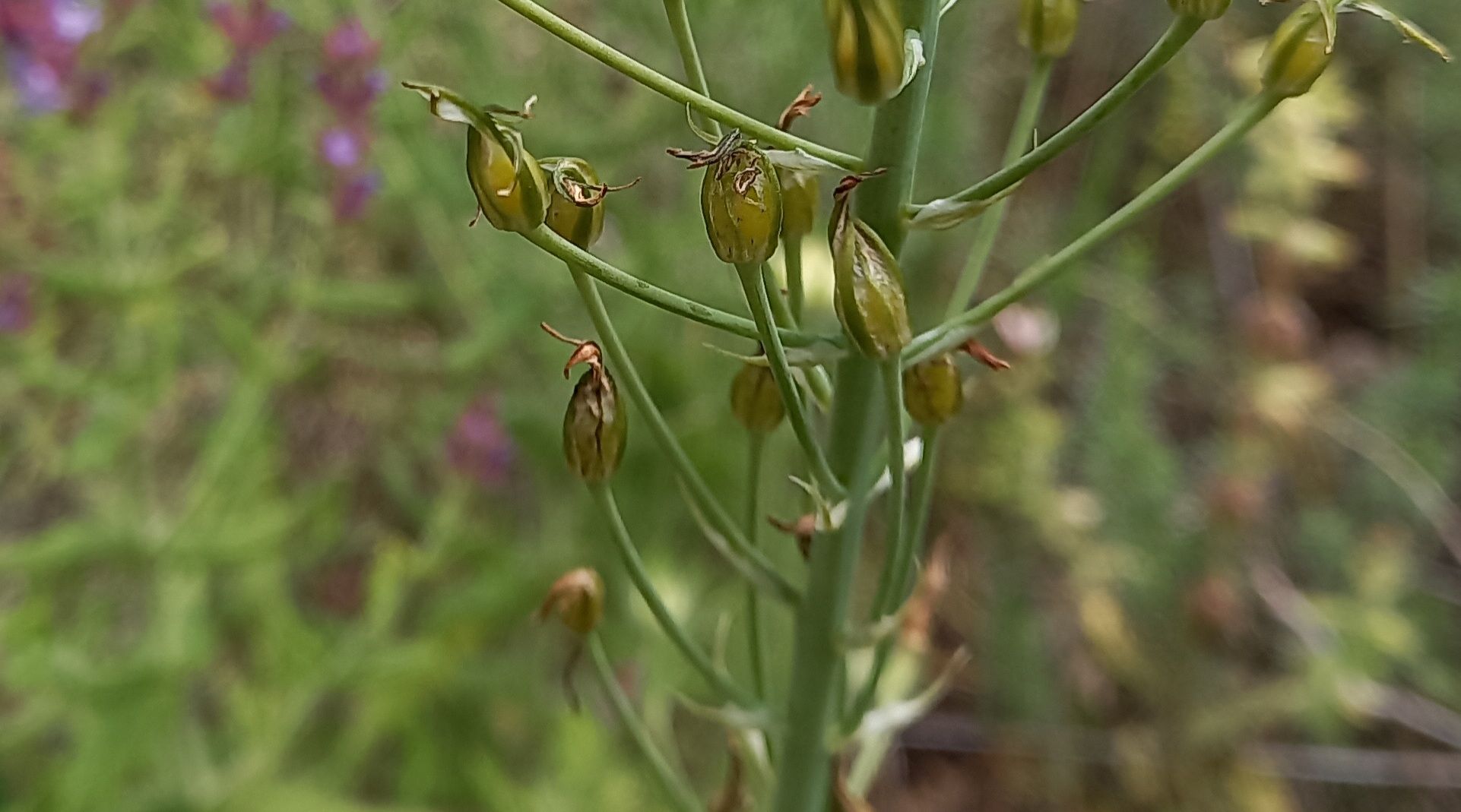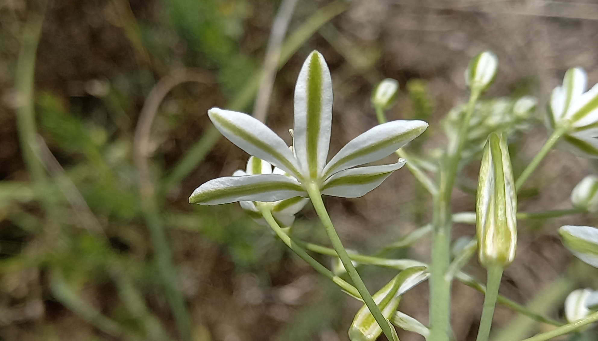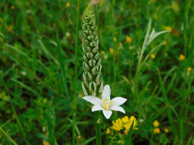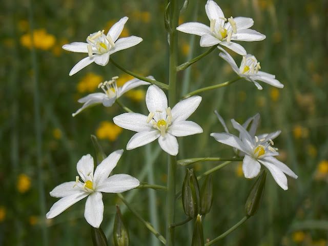 Ornithogalum pyramidale L. / Heterotypic Synonyms: Loncomelos brevistylum (Wolfner) Dostál, it is a bulbous geophyte, glabrous, bulbose herb. Bulb ovoid e. 3 cm in diameter, tunics membranous, brownish in colour. Leaves 4-6 per plant, usually before flowers, linear, canaliculated c. 30 x 1.1 cm. Scape 30-80 cm long. Inflorescence elongated-pyramidal, with 20-30 flowers; pedicels bracteates, c. 3 cm long in fruit, bracts lanceolate, acuminate, shorter than to as long as pedicels at flowering, l-2 cm long. Perianth whitish. Tepals lanceolate, obtuse, c. 1.2 x 0.3 cm. Stamens 6-8 mm long; filaments whitish lanceolate, attenuating towards the lip. Anthers yellow. Ovary oblong-ovoid with short style. 1-2 (-3) mm. Capsule ± oblong-ovoid, slightly constricted in the middle. Seeds ± ovoid, black, 3-4 mm long.