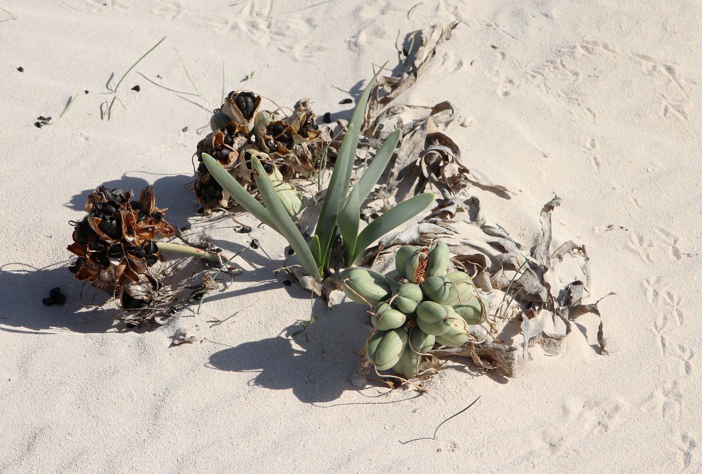 Pancratium arabicum Sickenb, it is a glabrous herbaceous perennial, 60-90 cm high; bulbs solitary or gregarious, usually deeply buried, globose or sub globose to elongated ovoid, 7-12 cm long, 5-10 cm diameter, narrowed above into a long cylindrical neck; neck 10-40(-60) cm long; tunic dark or blackish-brown. Leaves 5-10(-13), developing after the flowers, glaucous, broadly linear to oblong-lanceolate or lorate, 30-80 cm long, 1-2-3 cm diameter, broadest at middle or slightly above, erect, straight to arched or often twisted near the apex, abruptly narrowed above into obtuse to subacute apex, glabrous near the base; base truncate, with long membranous sheath. Aerial scape solitary, solid, compressed, glaucous, 17-24 cm long, dilated at the tip (1.0-3.0 cm diameter), glabrous. Spathe 2-valved, unequal, imbricate, lanceolate or ovate lanceolate, (5-) 6-9 cm long, 2-3 cm diameter, gradually or abrubtly tapering above into a long acuminate apex. Flowers 5-14, medium-sized, 13-18 cm long, 1.5-2 times as long as the spathe, fragrant, pedicelled; pedicel stout, 1-2 cm long, commonly shorter than the ovary or rarely equal, perianth white, 11-16 cm long; perianth-tube (7-)8-12 cm long, 1.5-2 times as long as the perianth-segments; perianth-segments white, with a broad green mid-stripe outside (4-6 mm diameter), patent, 5-7 cm long, 5-10 mm diameter; outer narrowly spathulate to lanceolate-oblong or linear-oblong, obtuse to subacute at the mucronate or shortly cuspidate apex; inner slightly shorter and narrower, lanceolate or oblong-lanceolate, acute or subacute, Capsule oblong-ovoid or broadly ellipsoid to broadly cylindrical, (2.5-)3-4 (-5) cm long, (2-)2.5-3.5 cm diameter, commonly with a peg-like projection; seeds irregularly angular and compressed or cone-shaped, 10-14 mm long, 8-10 mm diameter; testa black, sublustrous