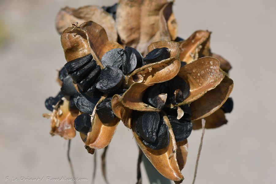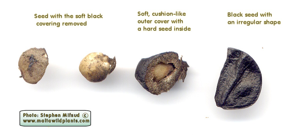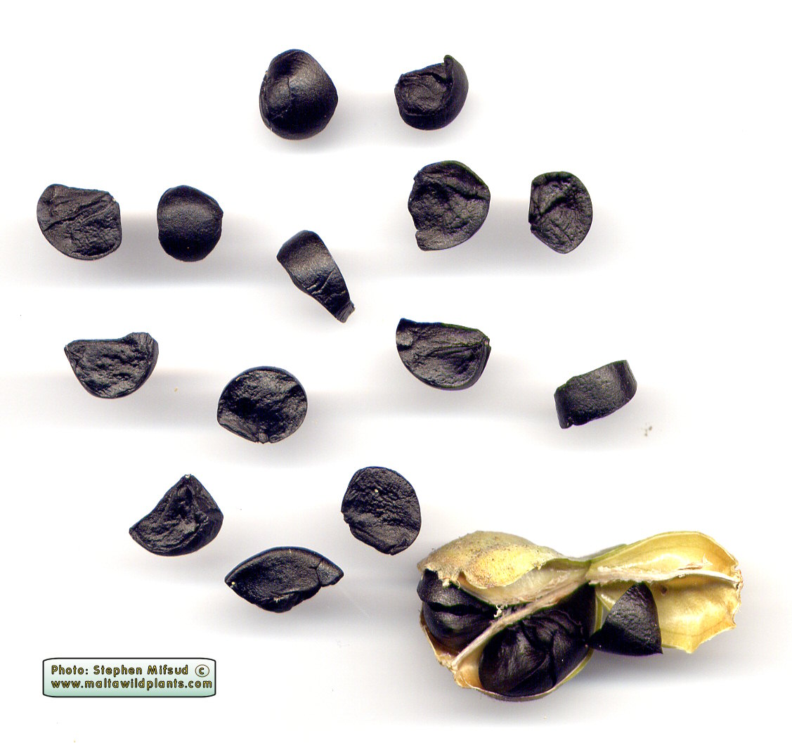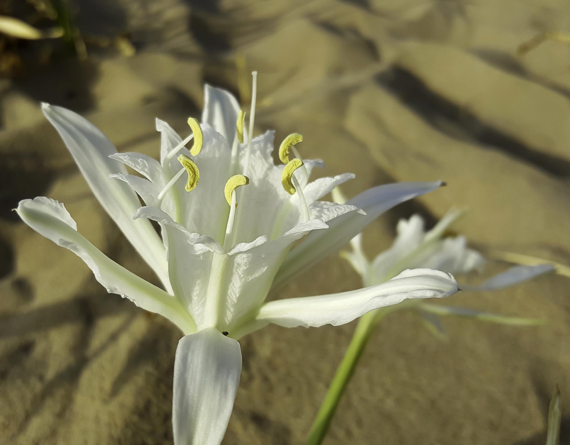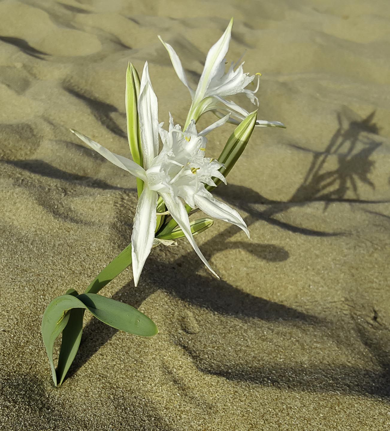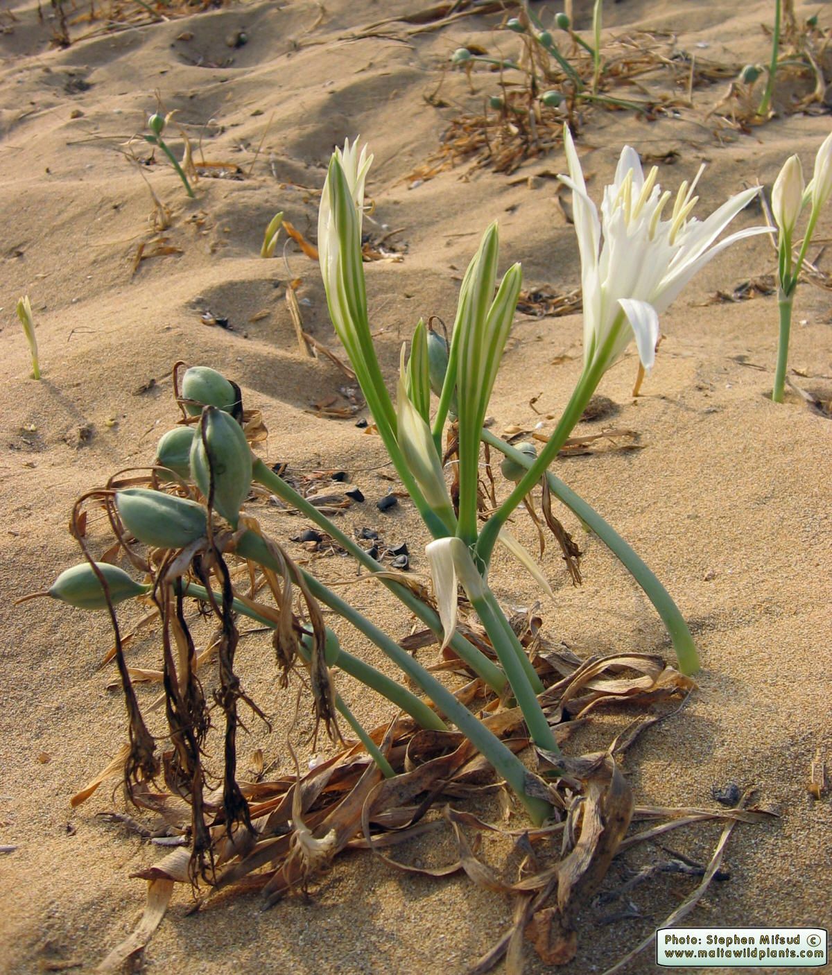 Pancratium maritimum L., it is a bulbous geophyte, perennial plant 30-60 cm, glabrous, with a very large oval bulb, c, 7 cm in diameter, outer tunics membranous, dark-brown in colour. Leaves, 8-20 mm wide, glaucous, protruding from the sturdy compressed stem; white flowers, very large, fragrant, 3-15 in umbel; spathe large, with valves much shorter than the floral tube; linear bracteoles; perianth 10-15 cm long, with a narrow tube, dilated in its upper quarter, much longer than the blade with lanceolate-linear divisions; crown large, funnel-shaped, fused to the perianth in its lower third and equal to 2 thirds of its divisions, with 12 triangular-acute teeth placed 2 by 2 between each stamen with a short free filament. Capsule subglobular-elongatcd c. 2.5 cm in cross section. Seeds black, triangular or angular,1-1.3 cm diameter, compressed seeds.