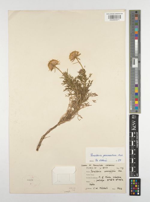 Perralderia garamantum Asch., it is a robust. suffrutcscent perennial, up to 25-50 (-80) cm tall; stems much branched at the base, lower parts thinly and upper parts densely hairy and interpressed with glandular hairs, striate, darkish-yellow or greenish in colour. Leaves 2-4 (-5) cm long, hairy glandular. Lower and mid cauline leaves 2-pinnatisect. Upper cauline leaves 1 pinnatisect; all lobes linear or ± terete, obtuse. Capitula 15-25 mm in diameter (exclude. involucre), showy, yellow, heterogamous, radiate, solitary terminal. Peduncles 1-3 (4) cm long, slender, densely villous, glandular. Involucre broadly campanulate, 30-40 mm in diam., villous. Involucral bracts 4-rowed. Outermost involucral bracts 17-20 x 0.25-0.5 mm, sub terete, herbaceo-foliaceous, acute, covered with soft. dense hairs and sub sessile glands, erecto-patent. Innermost involucral bracts up to 9 mm long. flat. coriaceous with narrow, scarious margins, acuminate, hairy. Peripheral florets ligulate, 1-rowed, female, not exceeding the involucre; corolla 13-15 mm long. (include, basal tube 4.5-5 mm), linear-oblong, erect, unequally 3-toothed. Disc florets corolla 7-R mm. obconical, 5-toothed; teeth narrowly ovate, acute, up to 1.25 mm long. Cypsela 2-2.5 (-3) mm long, cylindrical, 10 ribbed; base with a short, annular, oblique callus; apex sparsely hairy below the pappus. Pappus 2-rowed; outer row coronate, of short scales; scales c. 0.25 mm long, linear, acute, free up to the base; inner row of many setae; setae scabrid, fragile, unequal, up to 7 mm long.