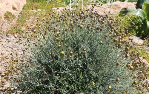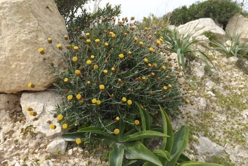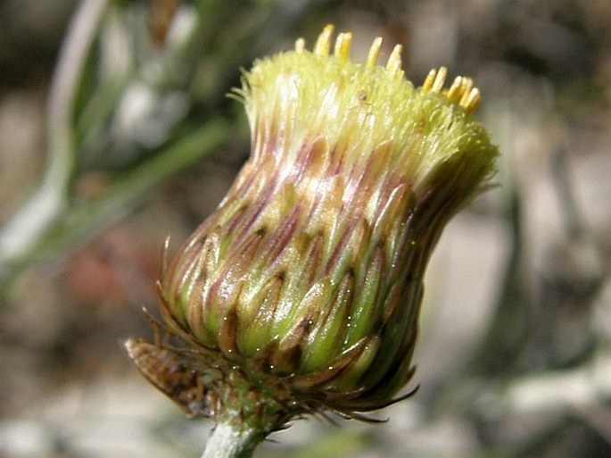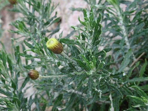 Phagnalon graecum Boiss.&Heldr, it is a perennial, up to (15-) 30-60 cm, erect or ascending, white lanate, branched, very leafy plants. Lower cauline leaves 25-32 x 5-5.5 mm, narrowly spathulate-obovate, tapering into a long, narrow petiole, narrowly obtuse-mucronate, margins weakly sinuate-erose to undulate and sparsely minute toothed, revolute, lanate to sub glabrous above, densely, white lanate beneath. Upper cauline leaves (35-) 40-60 x 4-6 mm. oblanceolate, acute, margins & surfaces as in the lower cauline leaves. Peduncles (60-) 100-120 mm. terminal or axillary, slender, erect to erecto patent, whitish tomentose to glabrescent. Involucral bracts 6-rowed, similar to the preceding species but acute. Outer florets female, corolla 6.25·7 mm. filiform-tubular, 5-lobed; lobes 0.25 mm; pappus setae 5-6, up to 7.5 mm long, distal half scabrid. Central florets hermaphrodite, corolla 6.75 mm, tubular-campanulate, 5-lobed; lobes 0.75 mm; pappus setae 5-6, up to 7.5 mm long. Cypsela 1 mm.