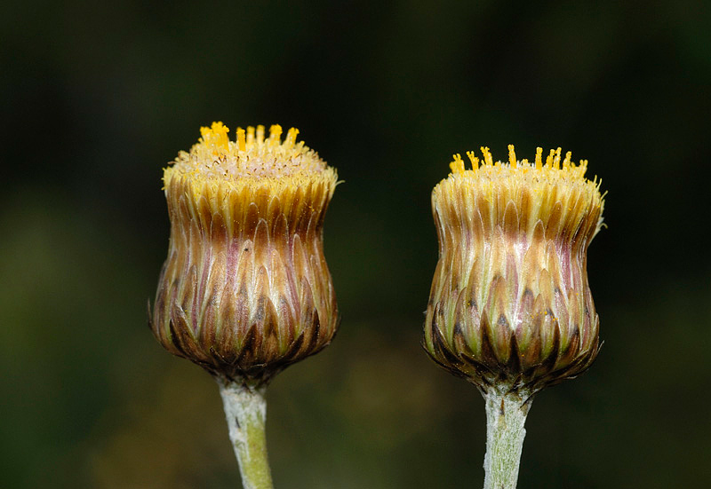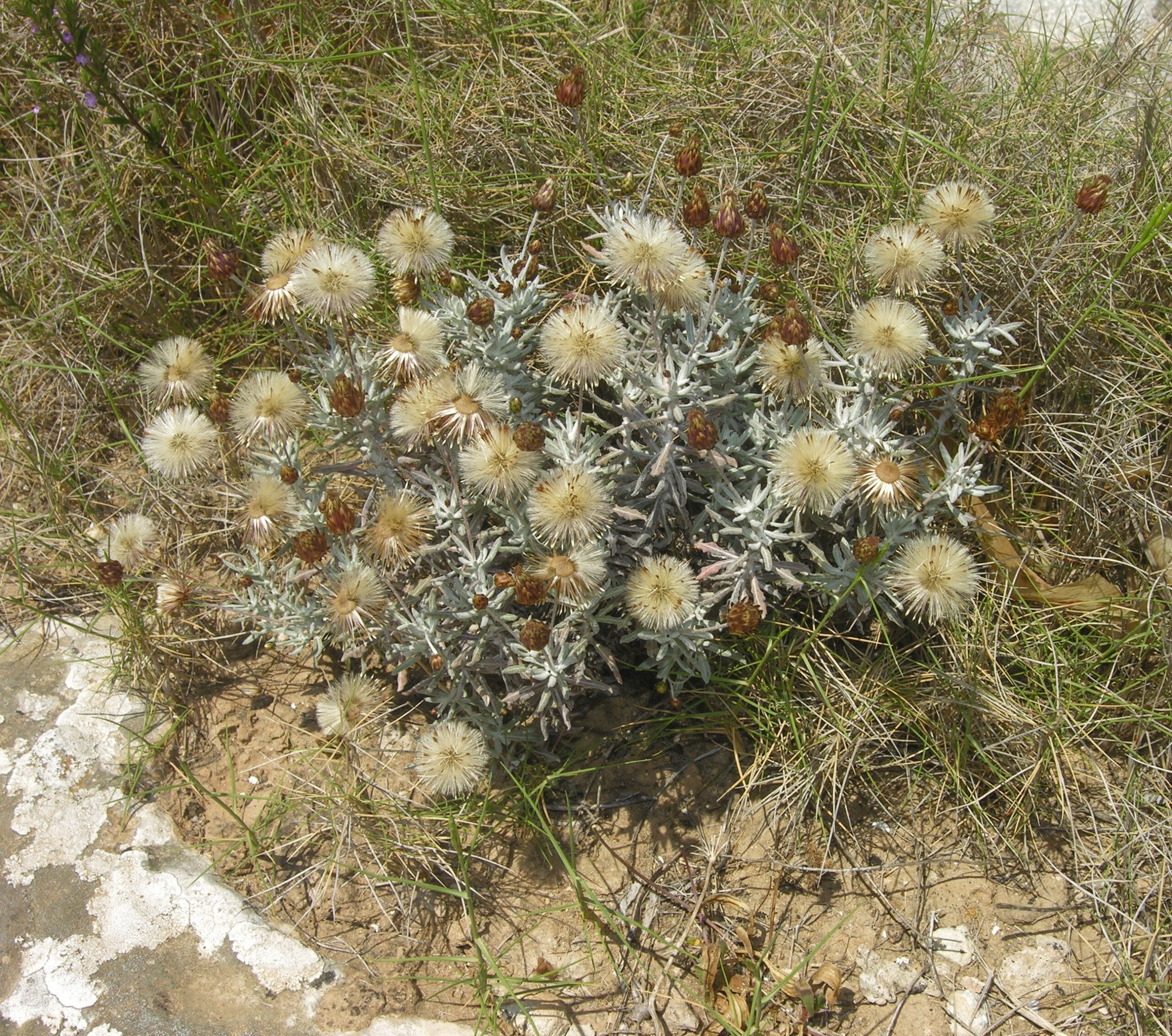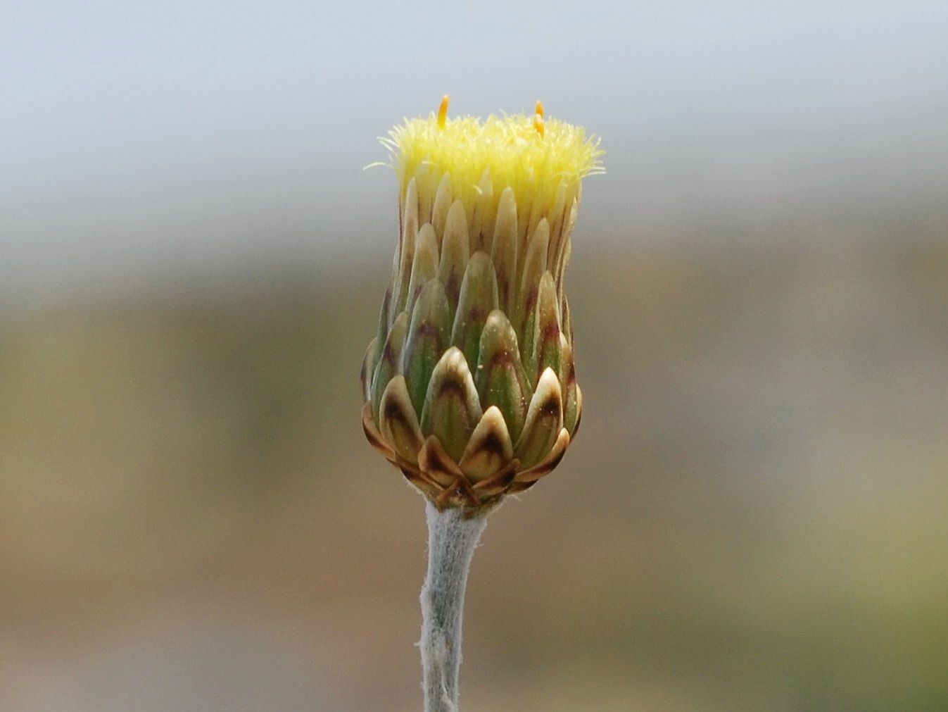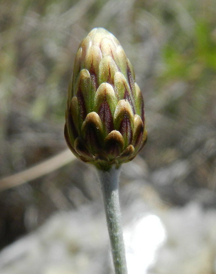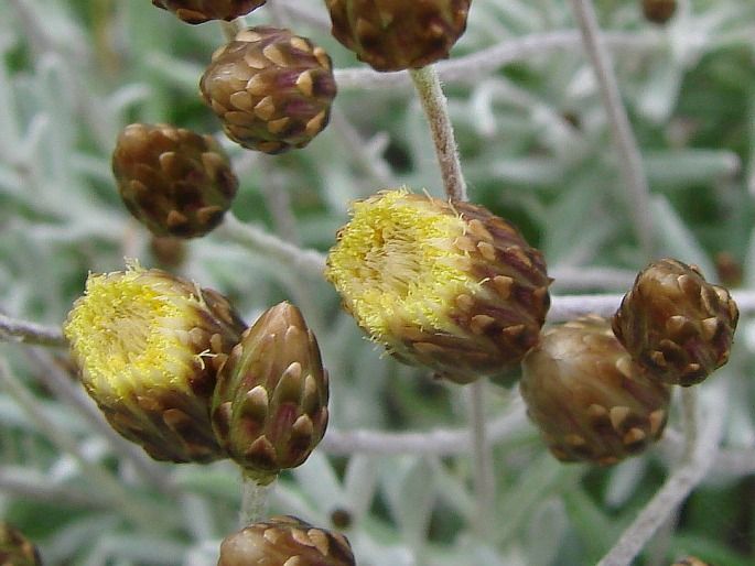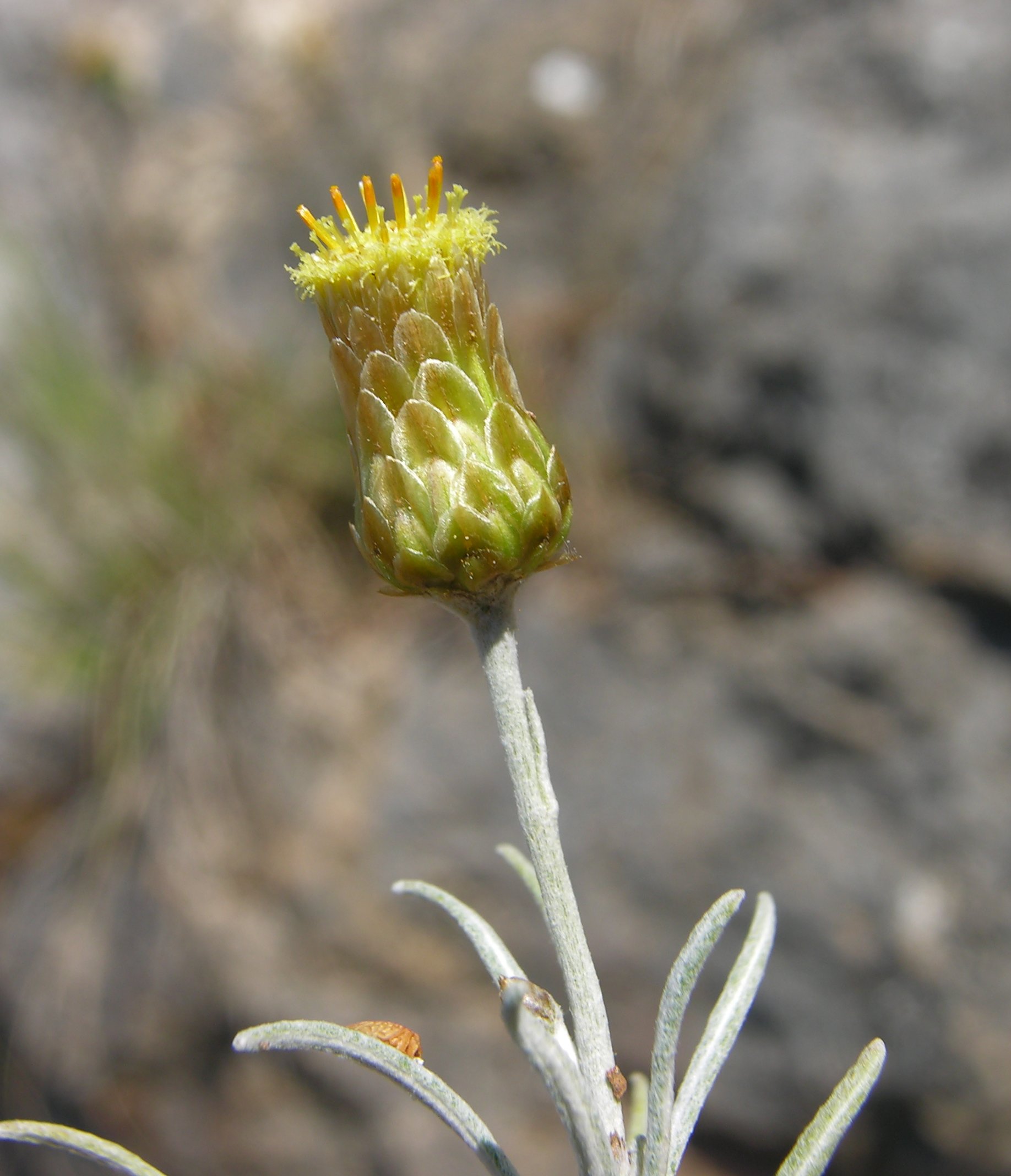 Phagnalon rupestre (L.) DC., it is a subshrub, stems up to15-30(-50) cm. erect or decumbent, branched, white or dirty white lanate, densely leafy. Leaves 10-35 (-40) x2-4 mm, oblanceolate or obovate, acute or acuminate, attenuate at base. glabrescent to greyish arachnoid above and white lanate below, sinuate, erose or sparsely minutely toothed, revolute. Peduncles terminal or axillary, (25-) 40-50 (-60) mm. whitish tomentose to glabrescent. Involucral bracts 7-8 rowed, erect, appressed glabrous. Involucral bracts of 1st. row (on peduncle) 1 x .75 mm. triangular, flat, acute, margin broadly scarious, irregularly toothed. Involucral bracts of 2nd row 1.25 x0.75 mm. oblong-ovate, flat, obtuse, margin broadly scarious and irregularly toothed. Involucral bracts of 3rd row 2 x 1 mm. oblong, weakly curved in, obtuse-mucronate, margins broadly scarious, toothed. Involucral bracts of 4th & 5tb row 3,5-5 x 1.25 mm, oblong, weakly curved in, acuto-mucronate to obtuse, margins, broadly scarious, toothed. Involucrar bracts of 6th, 7th & 8th row 5.25-9 x 1.5-1 mm, oblong to linear-oblong or linear lanceolate, acute-acuminate, margins broadly scarious, minutely serrulate near the apex. Peripheral florets female, corolla 6 mm, tubular-filiform, 4-5 lobed; lobe 0.5 mm, acute; pappus setae 8,6 mm long, scabrid. Central florets hermaphrodite; corolla 6-8 mm. tubular-campanulate, 5 lobed; lobes 1 mm. reflexed, acute; pappus setae 8, 6 mm long, scabrid. Cypscla 1 mm. pubescent.