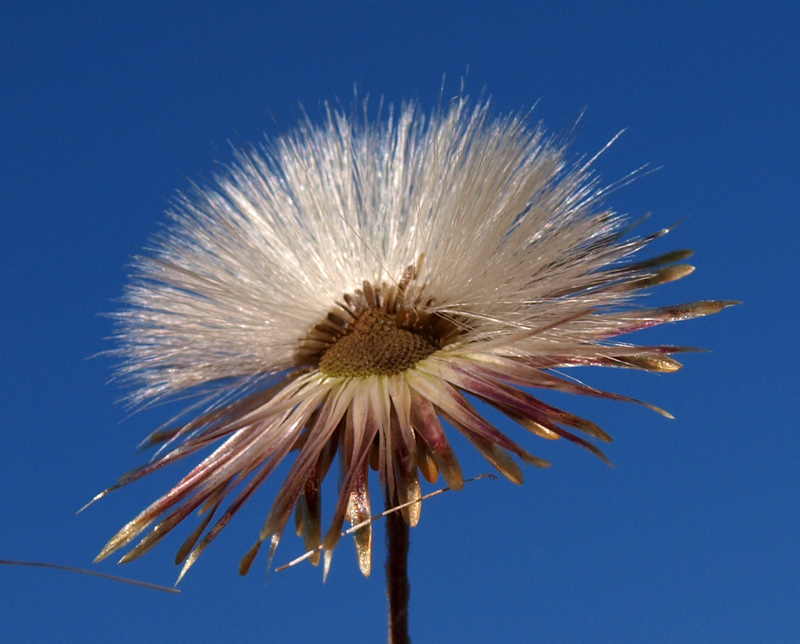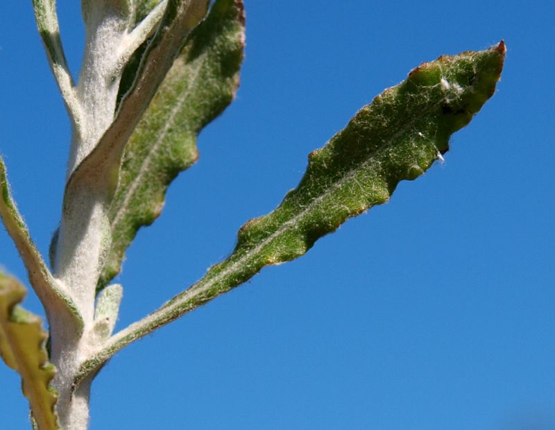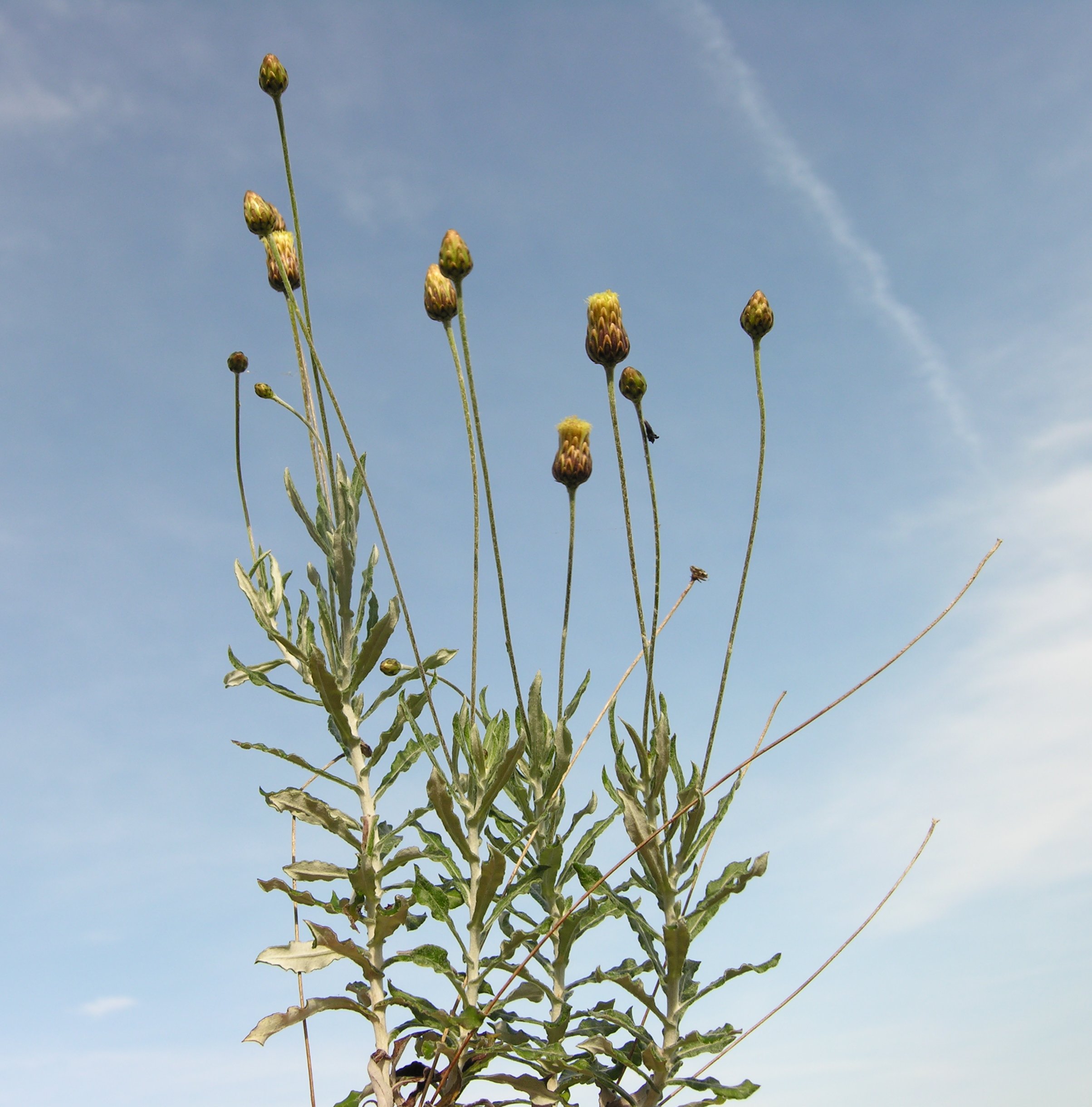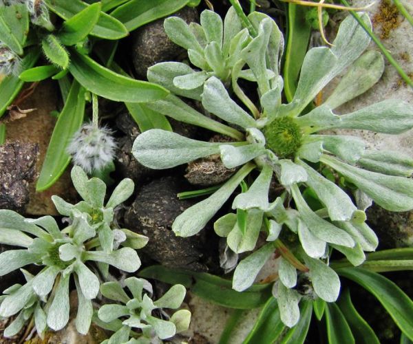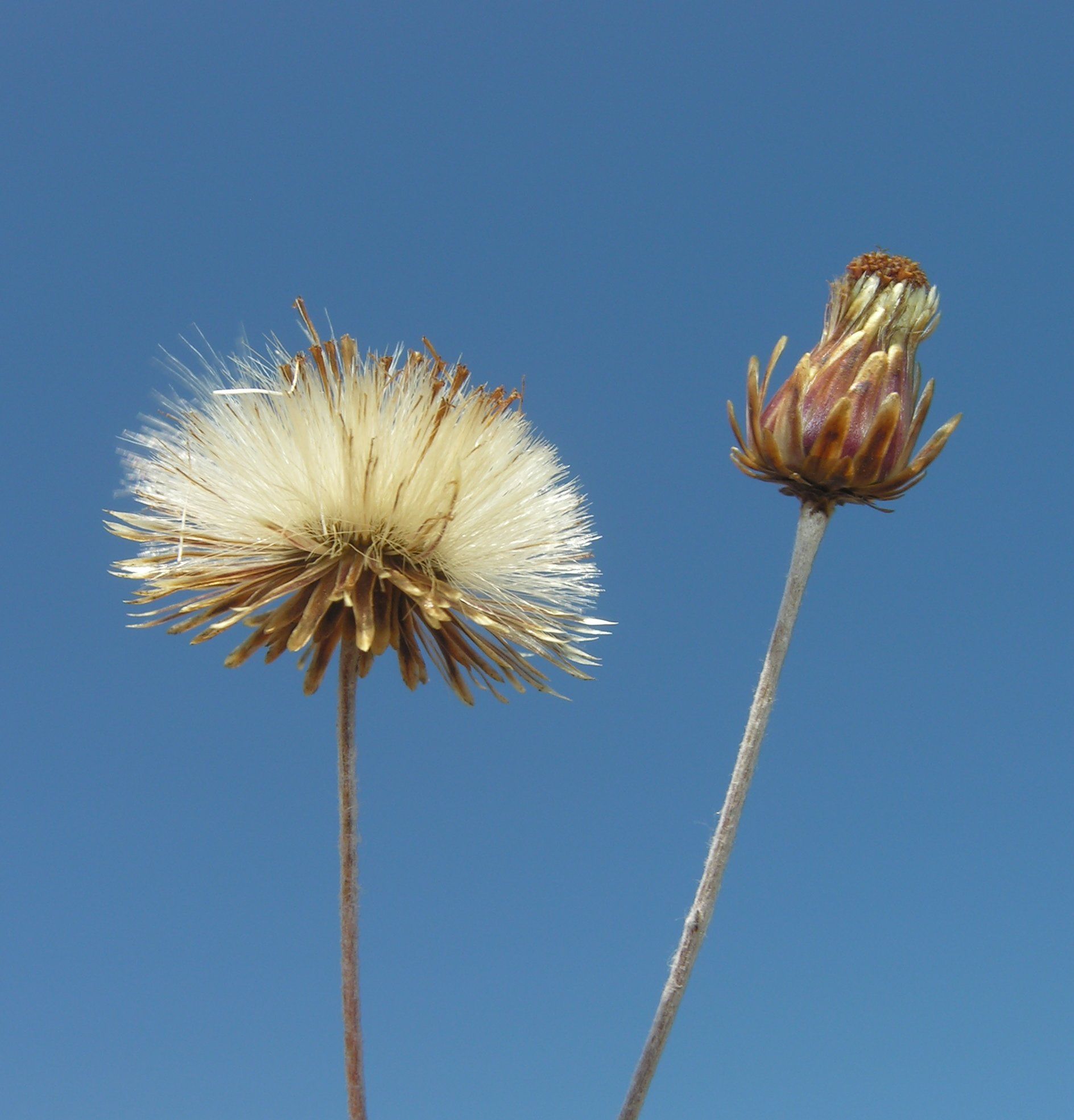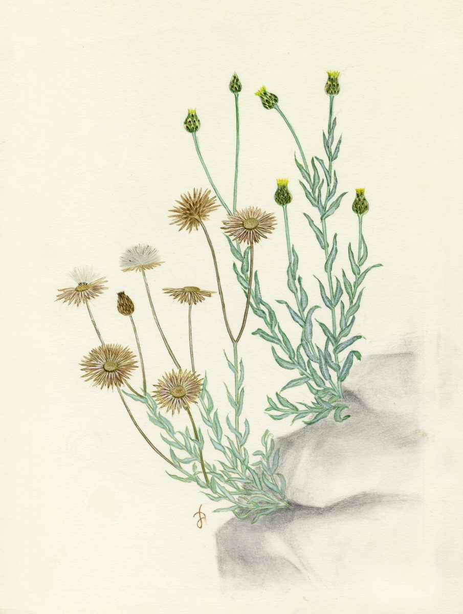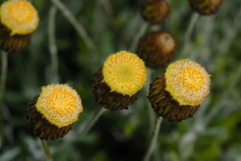Phagnalon rupestre (L.) DC., it is a subshrub, stems up to15-30(-50) cm. erect or decumbent, branched, white or dirty white lanate, densely leafy. Leaves 10-35 (-40) x2-4 mm, oblanceolate or obovate, acute or acuminate, attenuate at base. glabrescent to greyish arachnoid above and white lanate below, sinuate, erose or sparsely minutely toothed, revolute. Peduncles terminal or axillary, (25-) 40-50 (-60) mm. whitish tomentose to glabrescent. Involucral bracts 7-8 rowed, erect, appressed glabrous. Involucral bracts of 1st. row (on peduncle) 1 x .75 mm. triangular, flat, acute, margin broadly scarious, irregularly toothed. Involucral bracts of 2nd row 1.25 x0.75 mm. oblong-ovate, flat, obtuse, margin broadly scarious and irregularly toothed. Involucral bracts of 3rd row 2 x 1 mm. oblong, weakly curved in, obtuse-mucronate, margins broadly scarious, toothed. Involucral bracts of 4th & 5tb row 3,5-5 x 1.25 mm, oblong, weakly curved in, acuto-mucronate to obtuse, margins, broadly scarious, toothed. Involucrar bracts of 6th, 7th & 8th row 5.25-9 x 1.5-1 mm, oblong to linear-oblong or linear lanceolate, acute-acuminate, margins broadly scarious, minutely serrulate near the apex. Peripheral florets female, corolla 6 mm, tubular-filiform, 4-5 lobed; lobe 0.5 mm, acute; pappus setae 8,6 mm long, scabrid. Central florets hermaphrodite; corolla 6-8 mm. tubular-campanulate, 5 lobed; lobes 1 mm. reflexed, acute; pappus setae 8, 6 mm long, scabrid. Cypscla 1 mm. pubescent.
