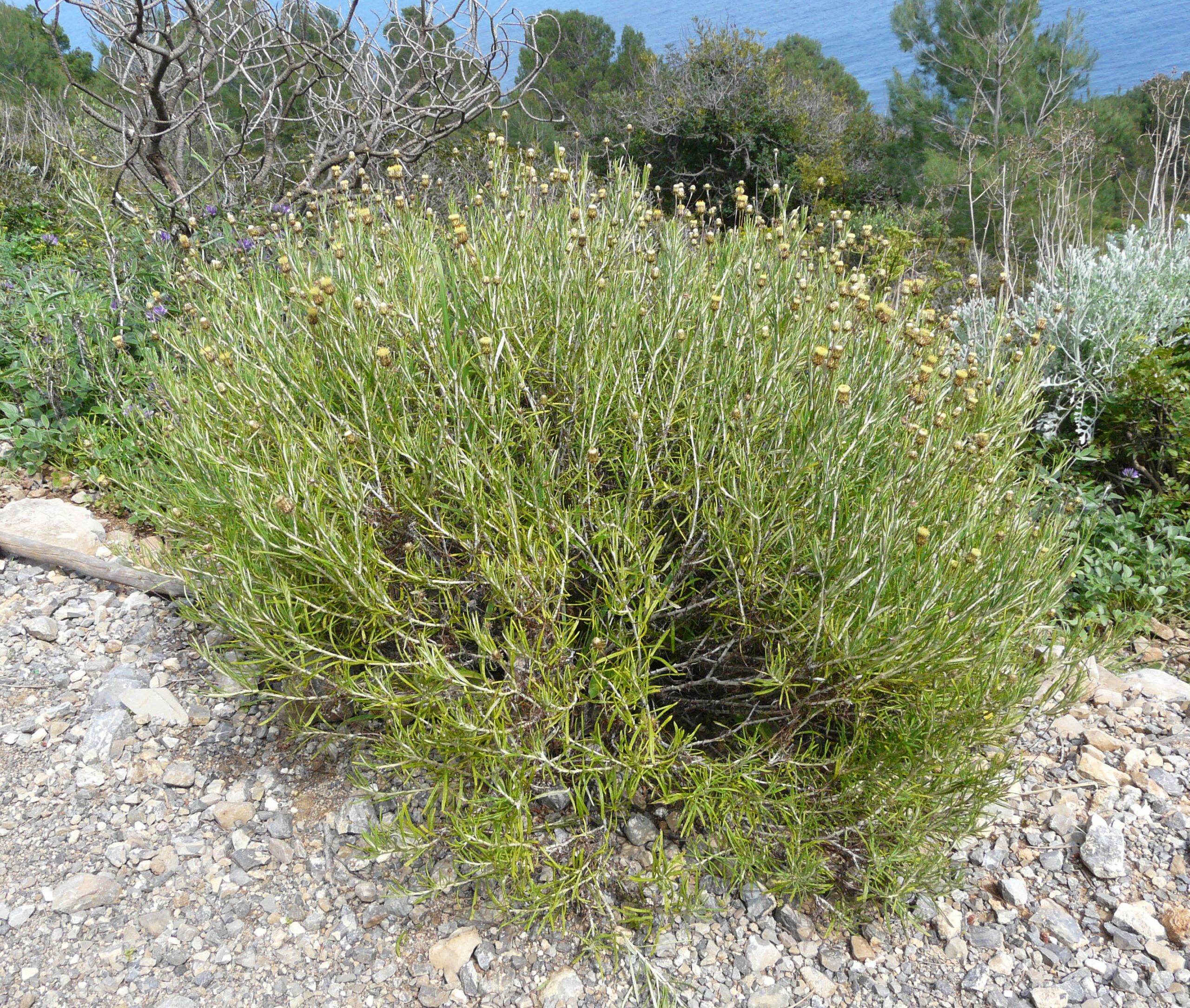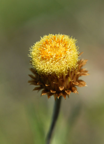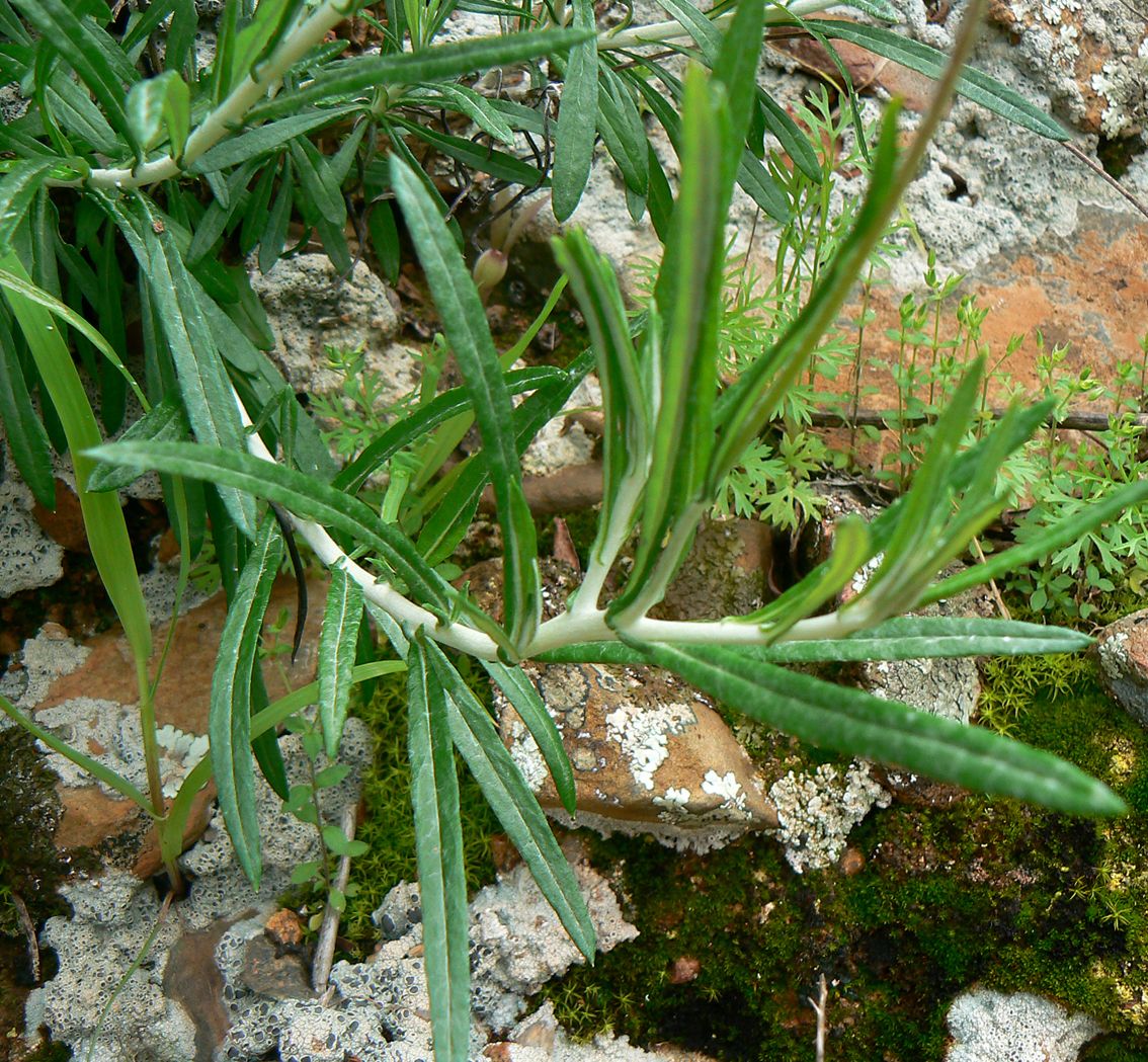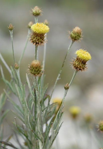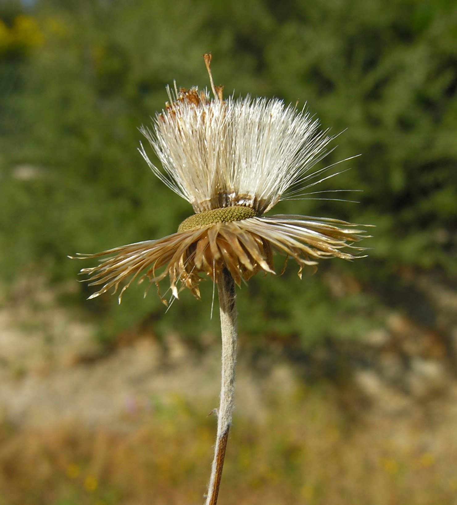Phagnalon saxatile (L.) Cass., it is a subshrub, Suffrutiscent, up to 20-60 cm tall. Stems asccnding or erect, very leafy, whitish tomentose. Leaves acute, greenish and sparsely woolly hairy above, whitish and densely tomentose below; margins ± revolute, erose or sparsely minute toothed. Lower cauline leaves 25-35 (-40) x 2.5-4 mm. linear to narrowly oblanceolate. The upper cauline leaves narrowly linear. Peduncles (40-) 60-80 (-100) mm. slender, terminal or axillary, whitish tomentose to glabrescent. Involucral bracts 7-8 rowed. Involucral bract of 1st row (on the peduncles) 2.75 x 0.5.0.75 mm. ovate, flat, sharply drawn into a long, soft, brown acumen, margin broadly scarious, irregularly toothed, dorsal side densely woolly hairy. Involucral bract of 2nd row 3.5 x 1 mm. linear-ovate, flat, sharped acute, dorsal face sparsely woolly hairy, margin broadly scarious, saw toothed. Involucral bract of 3rd row 4-5 1I. 1-1.25 mm. linear-ovate to linear lanceolate, weakly curved in, sharply acute, dorsal face sparsely hairy to glabrescent, margins scarious, undulate, erose. Involucral bracts of 4th. and 5th. row 6-7 x 1.25 mm. similar to 3rd. row. Involucral bracts of 6th. row 8 x .75 mm. linear-oblong, smooth, acute, margins scarious, weakly undulate near the apex. Involucral bracts of 7th. & 8th. Row 8.5-9 x 0.75-0.5 mm. narrowly linear, acute-acuminate, smooth, margins flat, scarious, erose near the apex. Marginal florets female, corolla 5.75-6.5 mm. tubular-filiform, 5-lobed, lobes 0.25 mm; pappus setae 7, 6.5 mm long. scabrid. Central florets hermaphrodite; corolla 7·7.5 mm, tubular-campanulate, 5-lobed; lobes .75 mm. acute; pappus setae 7,6.5-7 mm, scabrid. Cypselas 1 mm. pubescent.