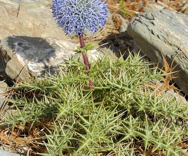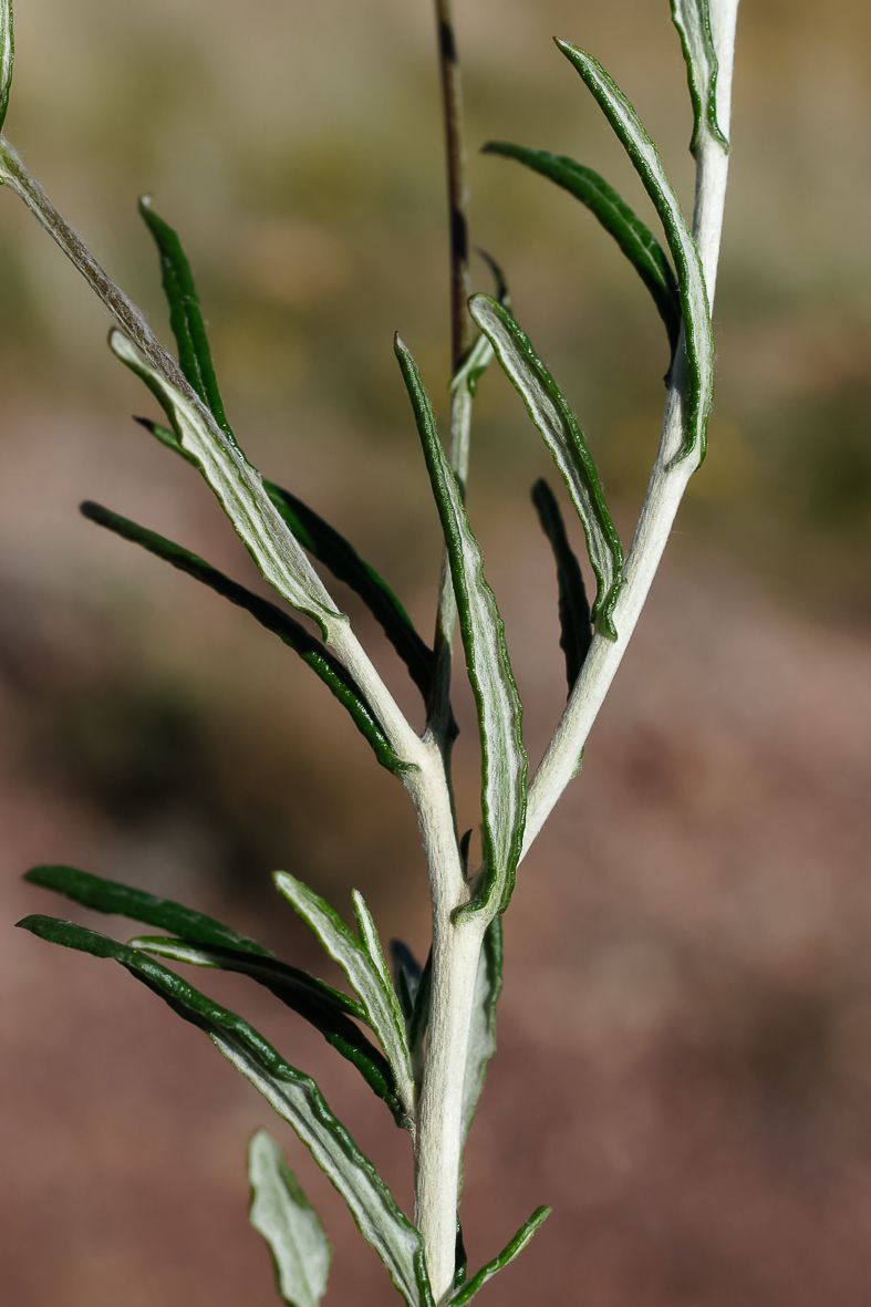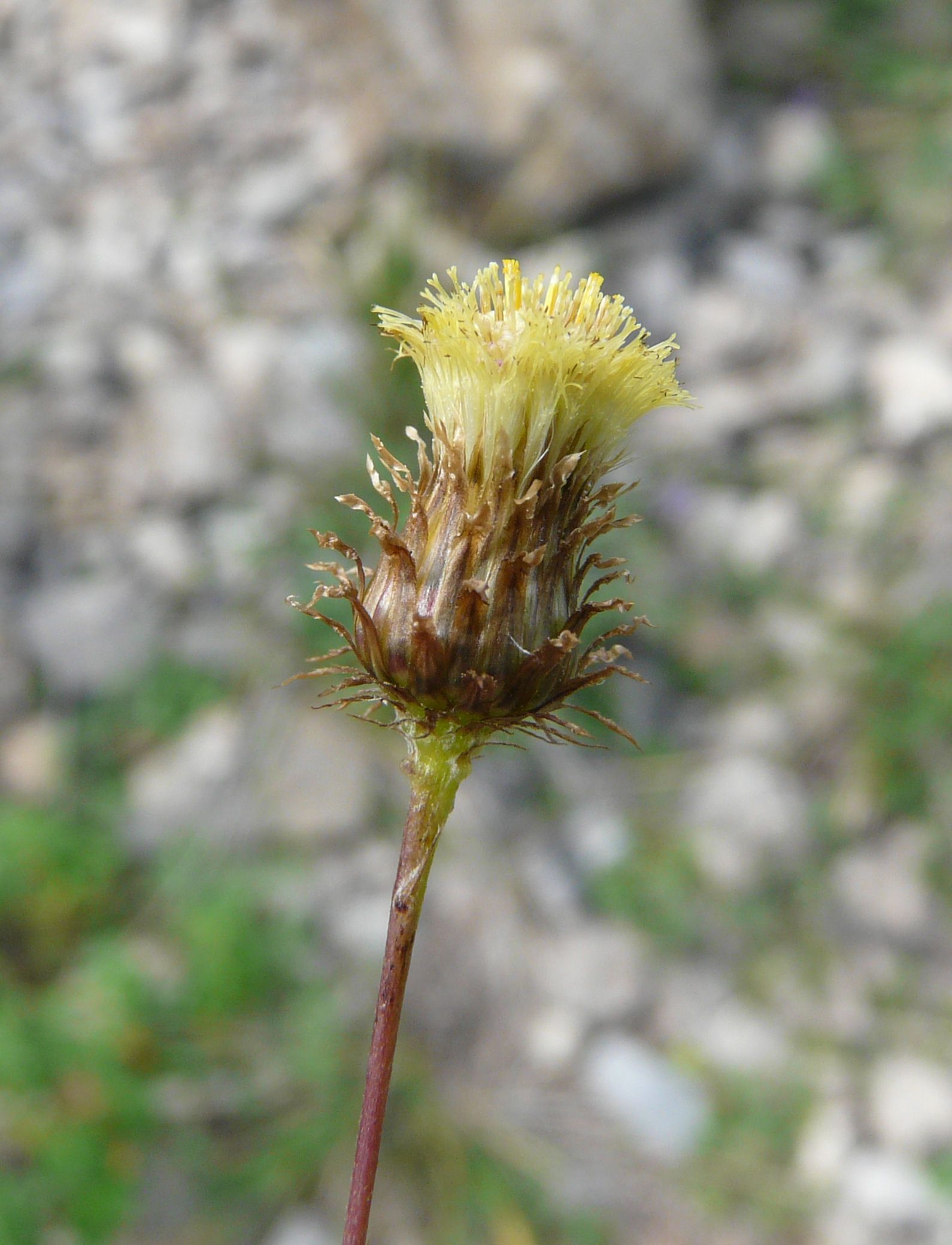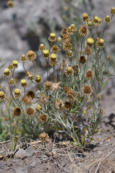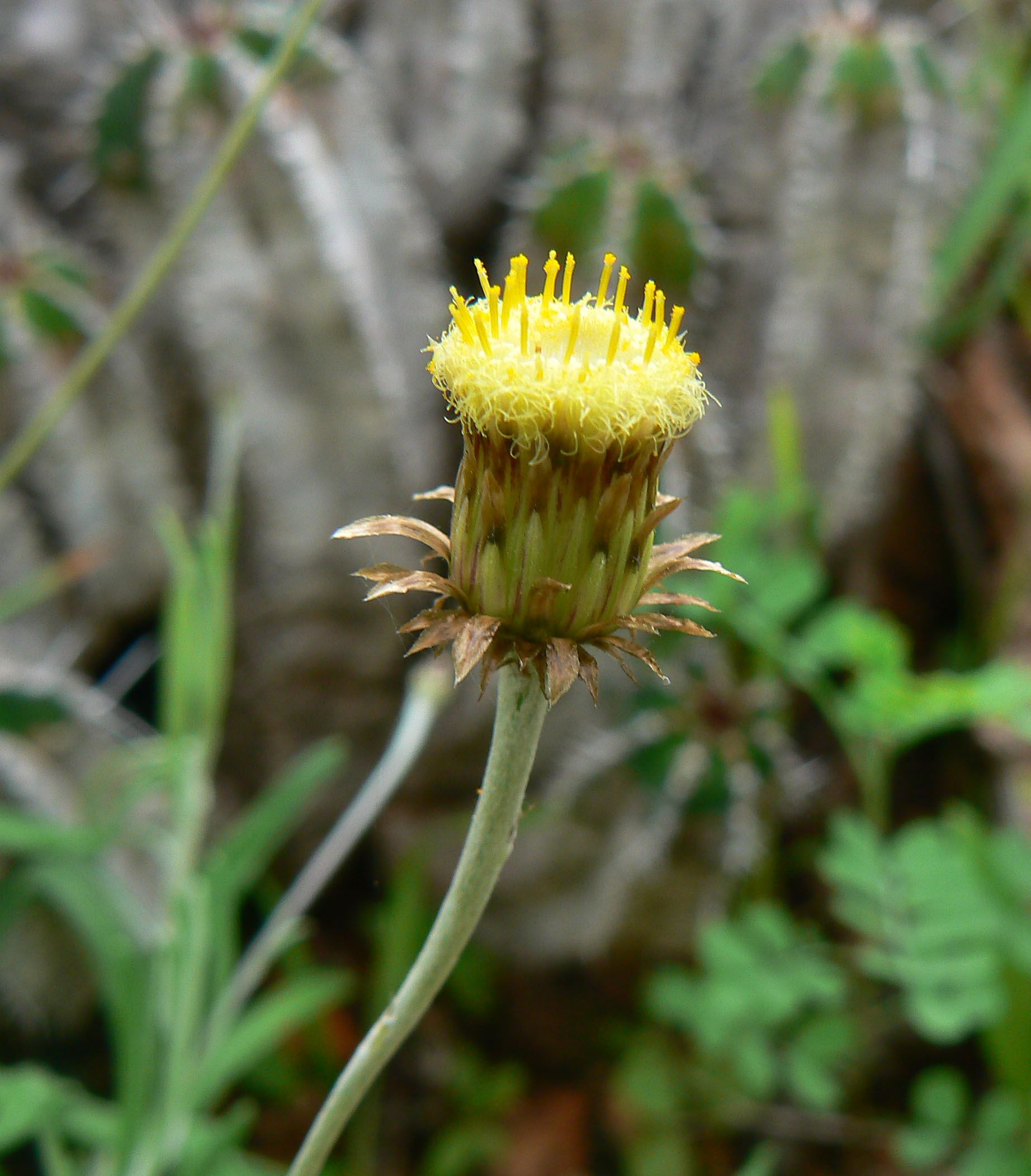 Phagnalon saxatile (L.) Cass., it is a subshrub, Suffrutiscent, up to 20-60 cm tall. Stems asccnding or erect, very leafy, whitish tomentose. Leaves acute, greenish and sparsely woolly hairy above, whitish and densely tomentose below; margins ± revolute, erose or sparsely minute toothed. Lower cauline leaves 25-35 (-40) x 2.5-4 mm. linear to narrowly oblanceolate. The upper cauline leaves narrowly linear. Peduncles (40-) 60-80 (-100) mm. slender, terminal or axillary, whitish tomentose to glabrescent. Involucral bracts 7-8 rowed. Involucral bract of 1st row (on the peduncles) 2.75 x 0.5.0.75 mm. ovate, flat, sharply drawn into a long, soft, brown acumen, margin broadly scarious, irregularly toothed, dorsal side densely woolly hairy. Involucral bract of 2nd row 3.5 x 1 mm. linear-ovate, flat, sharped acute, dorsal face sparsely woolly hairy, margin broadly scarious, saw toothed. Involucral bract of 3rd row 4-5 1I. 1-1.25 mm. linear-ovate to linear lanceolate, weakly curved in, sharply acute, dorsal face sparsely hairy to glabrescent, margins scarious, undulate, erose. Involucral bracts of 4th. and 5th. row 6-7 x 1.25 mm. similar to 3rd. row. Involucral bracts of 6th. row 8 x .75 mm. linear-oblong, smooth, acute, margins scarious, weakly undulate near the apex. Involucral bracts of 7th. & 8th. Row 8.5-9 x 0.75-0.5 mm. narrowly linear, acute-acuminate, smooth, margins flat, scarious, erose near the apex. Marginal florets female, corolla 5.75-6.5 mm. tubular-filiform, 5-lobed, lobes 0.25 mm; pappus setae 7, 6.5 mm long. scabrid. Central florets hermaphrodite; corolla 7·7.5 mm, tubular-campanulate, 5-lobed; lobes .75 mm. acute; pappus setae 7,6.5-7 mm, scabrid. Cypselas 1 mm. pubescent.