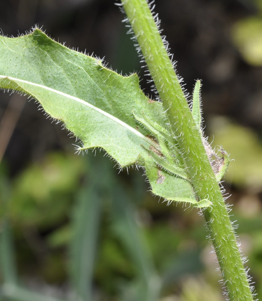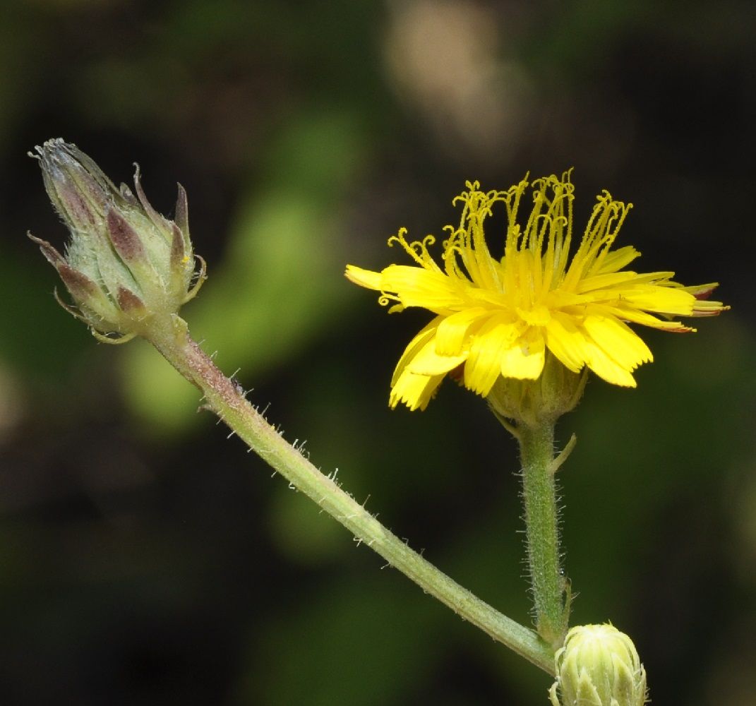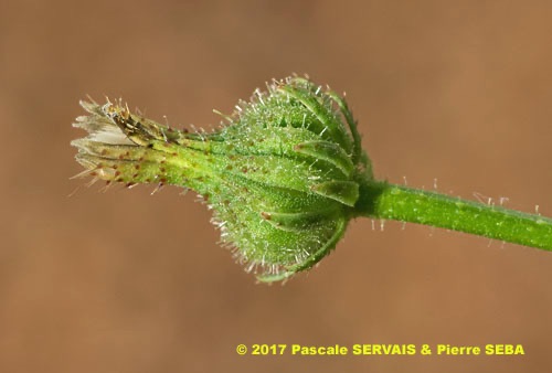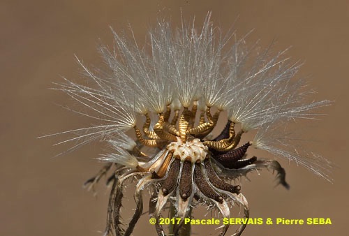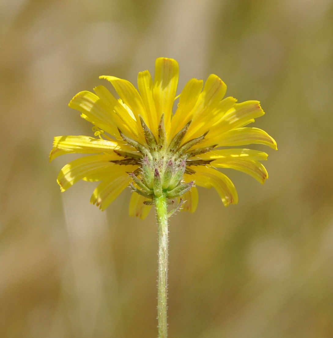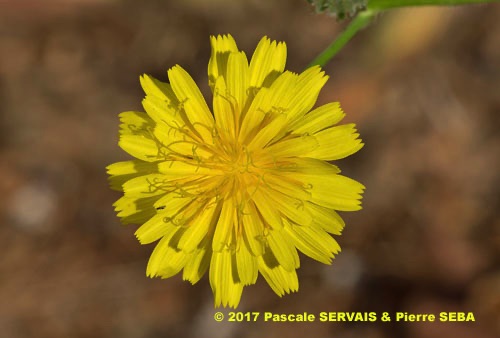 Picris rhagadioloides (L.) Desf. / Heterotypic Synonyms: Crepis sprengeriana (L.) All., Picris altissima Delile, it is a herbaceous plant, hermaphrodite. Stems cylindrical, branched, with hooked hairs, from 4 to 5 mm in diameter. Leaves at the base and alternate, with stiff and hooked hairs, those of the base simple, oblong to obovate, from 12 to 15 cm long, from 33 to 43 mm across, lengthily spatulate, lobed, with undulated edges, stem-leaves simple, linear, entire, 5 cm long, 9 mm across, with 2 small clasping basal lobes. Flowers joined together in numerous capitula, from 18 to 30 mm in diameter, with peduncles very long, spread out, divaricated, nonswollen at the top, with only ray-florets, bright yellow, self-coloured, with reddish brown veins in the lower part. Involucre with 2 rows of linear to lanceolate bracts, with hooked hairs, the external ones shorter than the internal ones, widened out in nacelle at fructification. Ovary inferior. Fruits, achenes with pappus, brown, glabrous, curved, crescent-shaped, from 2.5 to 3 mm long, less than 1 mm across, with 12 to 18 very protruding transversal awns, with beak tiny or null. External achenes with short pappus of rough hairs, interior achenes with a long pappus of feathery hairs.