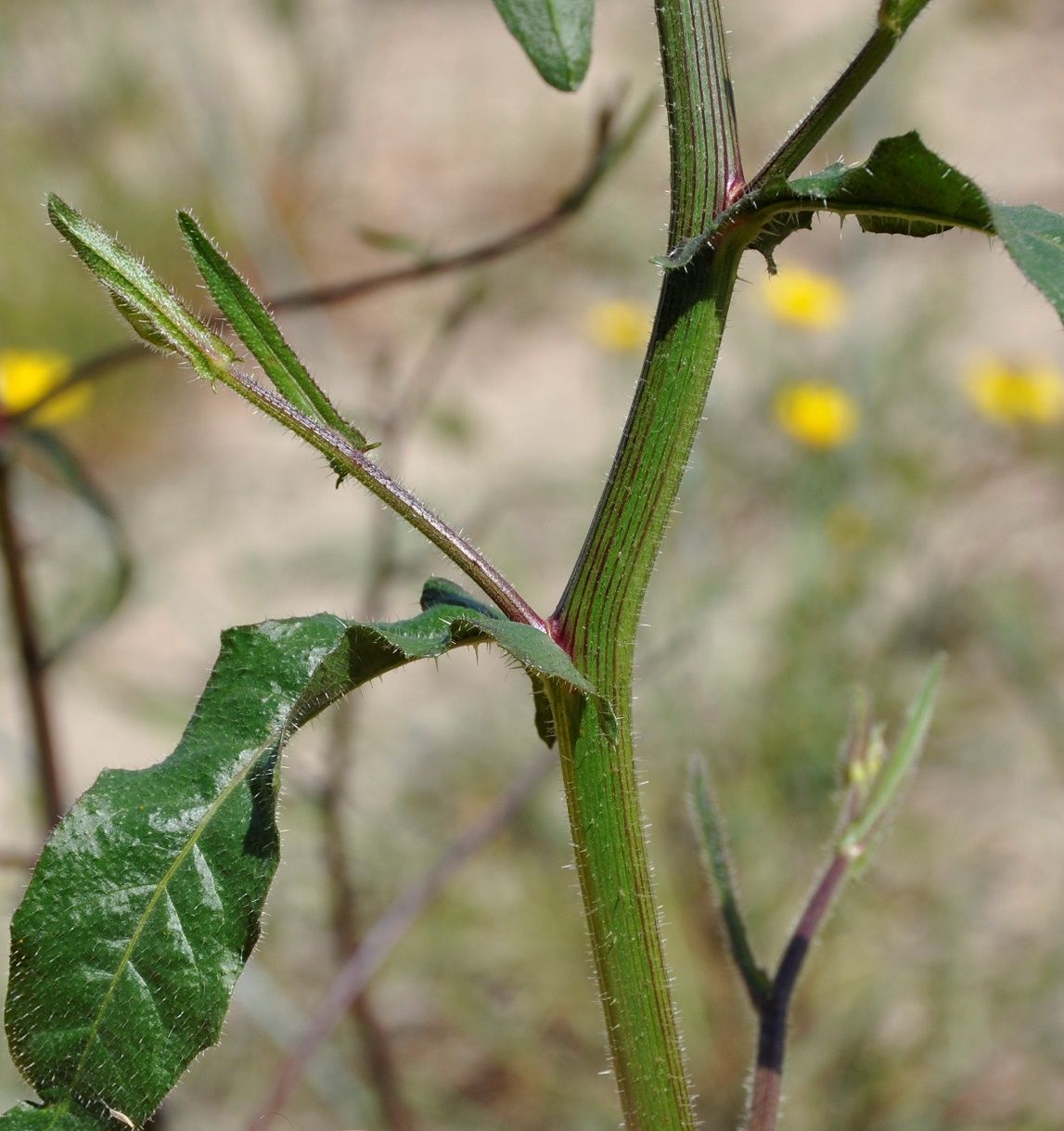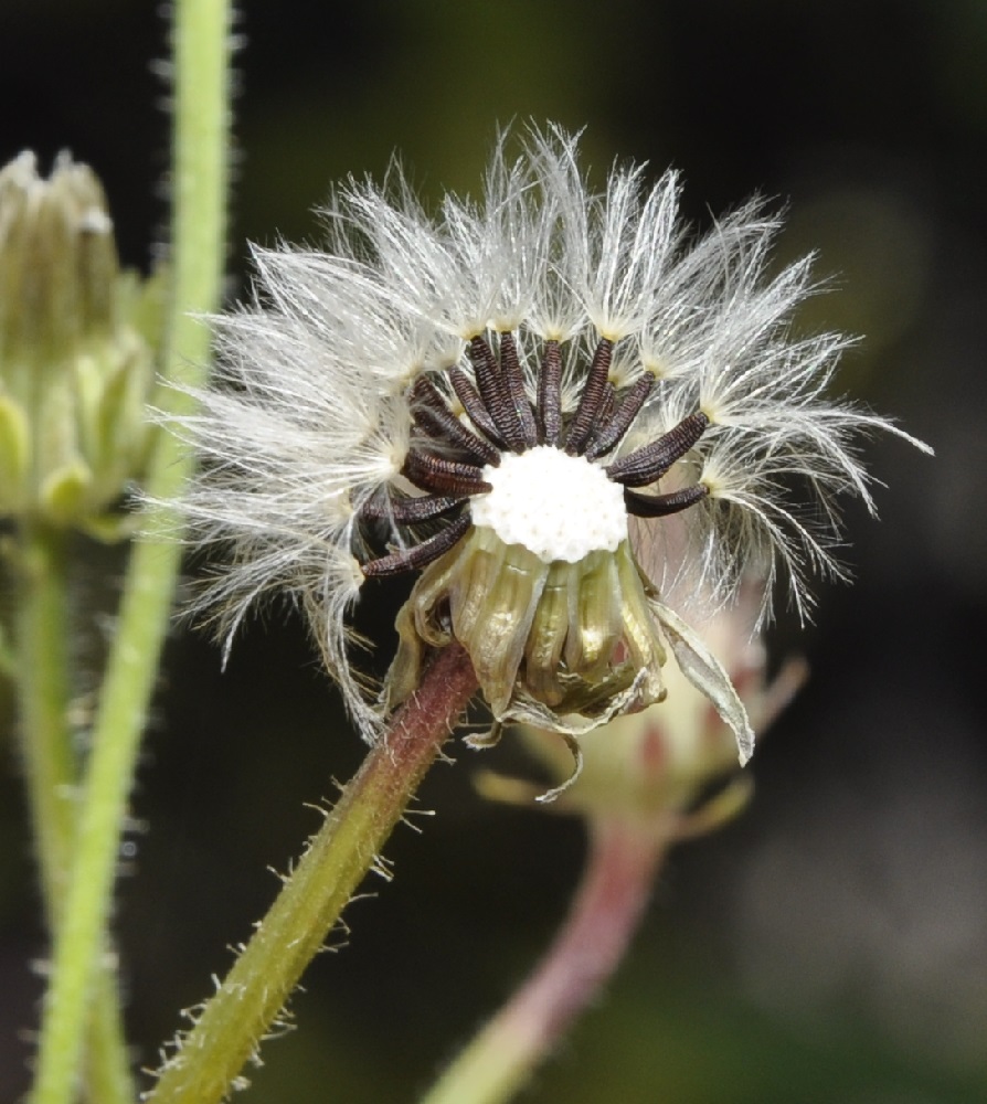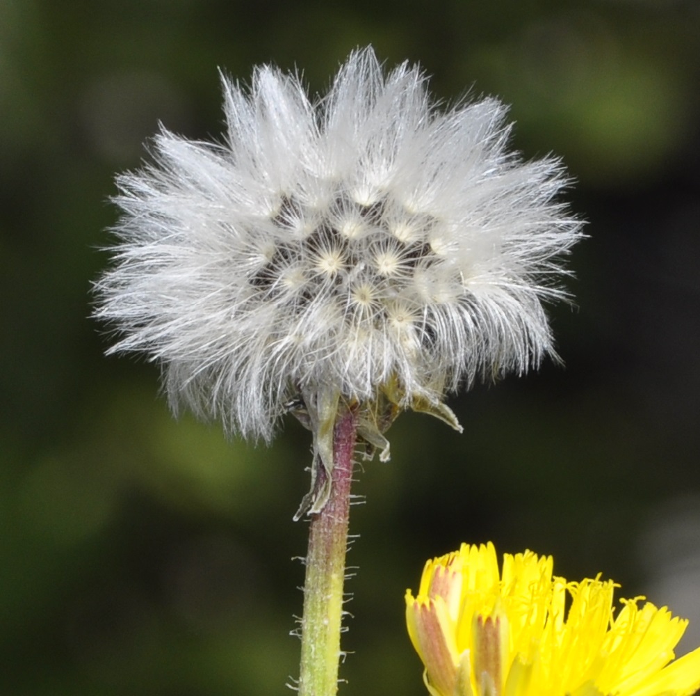 Picris rhagadioloides (L.) Desf. / Heterotypic Synonyms: Crepis sprengeriana (L.) All., Picris altissima Delile, it is a herbaceous plant, hermaphrodite. Stems cylindrical, branched, with hooked hairs, from 4 to 5 mm in diameter. Leaves at the base and alternate, with stiff and hooked hairs, those of the base simple, oblong to obovate, from 12 to 15 cm long, from 33 to 43 mm across, lengthily spatulate, lobed, with undulated edges, stem-leaves simple, linear, entire, 5 cm long, 9 mm across, with 2 small clasping basal lobes. Flowers joined together in numerous capitula, from 18 to 30 mm in diameter, with peduncles very long, spread out, divaricated, nonswollen at the top, with only ray-florets, bright yellow, self-coloured, with reddish brown veins in the lower part. Involucre with 2 rows of linear to lanceolate bracts, with hooked hairs, the external ones shorter than the internal ones, widened out in nacelle at fructification. Ovary inferior. Fruits, achenes with pappus, brown, glabrous, curved, crescent-shaped, from 2.5 to 3 mm long, less than 1 mm across, with 12 to 18 very protruding transversal awns, with beak tiny or null. External achenes with short pappus of rough hairs, interior achenes with a long pappus of feathery hairs.