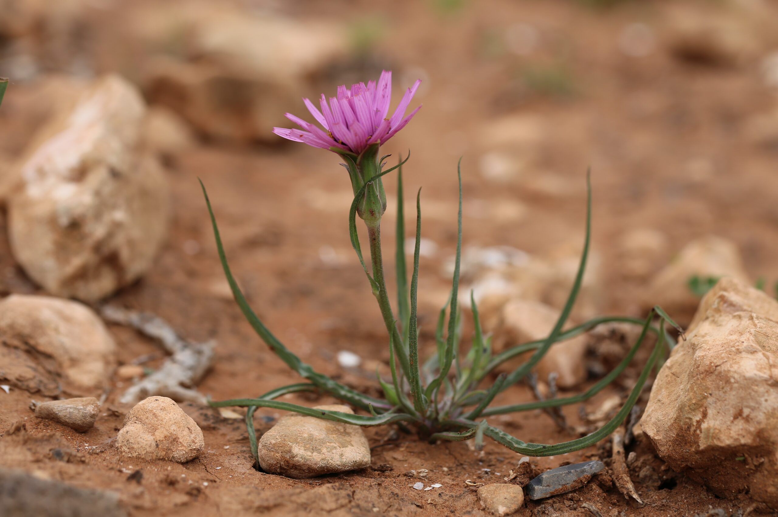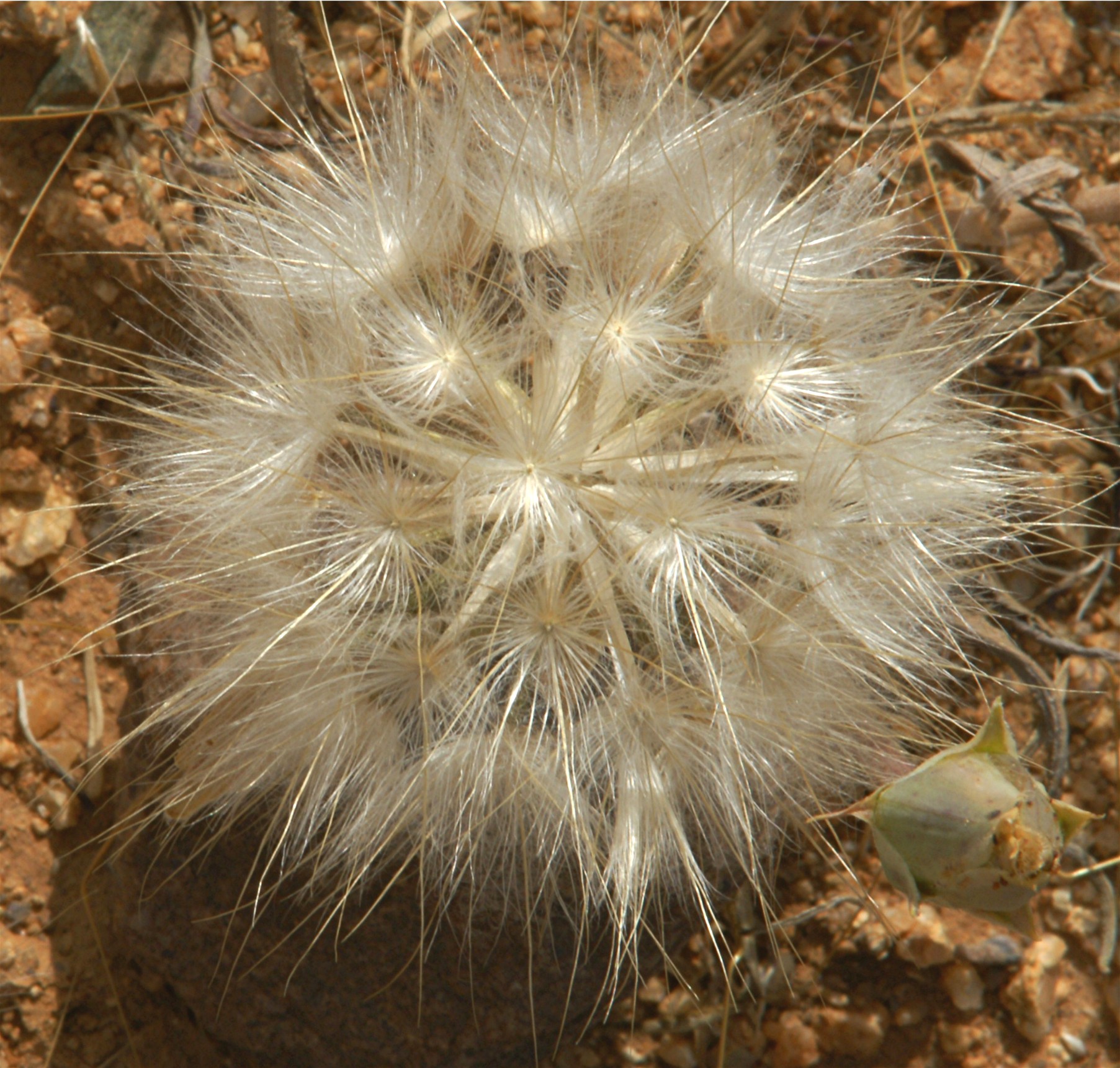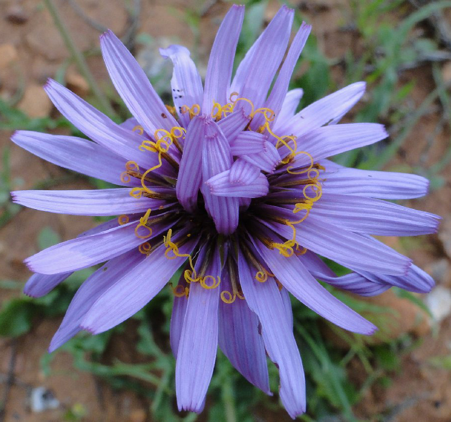Pseudopodospermum undulatum (Vahl) Zaika, Sukhor. & N.Kilian /  Homotypic SynonymsScorzonera undulata Vahl, it is a perennial, up to (5-) 7-25 cm tall, sub scapigerous. glabrous or tomentose, hairs when present usually restricted in the lower part of the stem. leaves and below the capitulum on the peduncles, simple, straight or wooly, white to dirty brown. Root-stock vertical, 0.7·1.5 (-2) cm in thickness, tuberous-incrassate, oblong-cylindrical, dark-brown, not fibrous above; sub-terranean part of the plant usually covered with the remains of previous year leaf bases; leaf bases whitish-yellow to straw-yellow, becoming fiber like. Stems solitary, simple or branched near the base, branches monocephalic. Basal leaves 30-150 x 2-7 mm. linear to linear-Ianceolate, entire, flat or margins sinnuate. Cauline leaves similar but smaller. amplexicaule. Involucre 15-25 mm long. cylindrical-campanulate. Involucral bracts 3-4 rowed. broadly ovate, acute, slightly hairy to glabrous. Ligules 11̸2-2 times as long as the involucre, purplish or violet (rarely white). Cypselas homomorphic. (marginal ones slightly curved. inner ± straight), 9-11 (-12) x 0.75-1 mm. cylindrical-ellipsoid, with ribs scabrid or rugose to squamate, otherwise glabrous, rarely hairy, pale brownish to brown; basal part soft, sponge. paler in colour, c. 1/5 as long as the rest of the cypsela; pappus sessile with a distinct, brown ring at its base, dirty white, setae of two types; some plumose throughout, persistent, as long as the cypsela; others plumose in the lower parts and scabrid above, brittle. usually exceed the length of the cypsela.