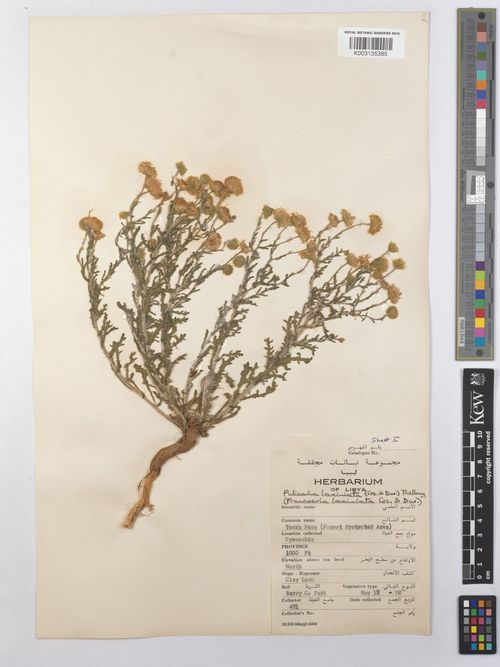 Pulicaria laciniata Thell. / Homotypic Synonyms:  Francoeuria laciniata Coss. & Durieu, it is a perennial, up to 20-40 cm tall, whitish, wooly, hairy. Leaves not undulate, pinnately laciniate, up to 20 mm, hairy or almost glabrous. Capitula 20-25 mm in diameter, radiate, in terminal corymbs. Ray florets spreading, exceeding the involucre, Cypsela with pappus setae hairy throughout the length.