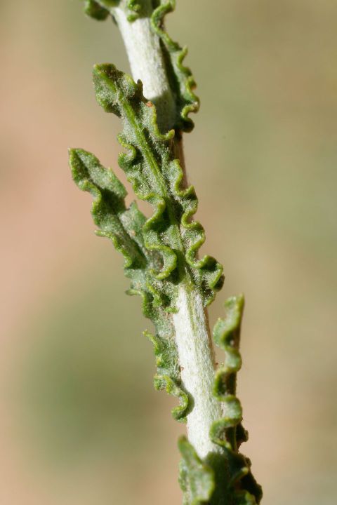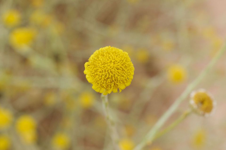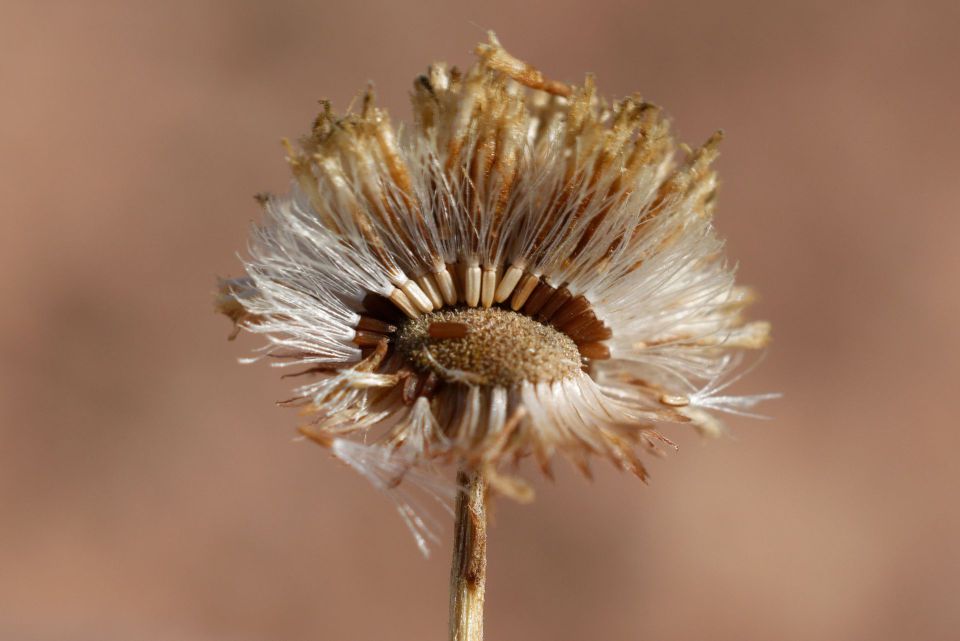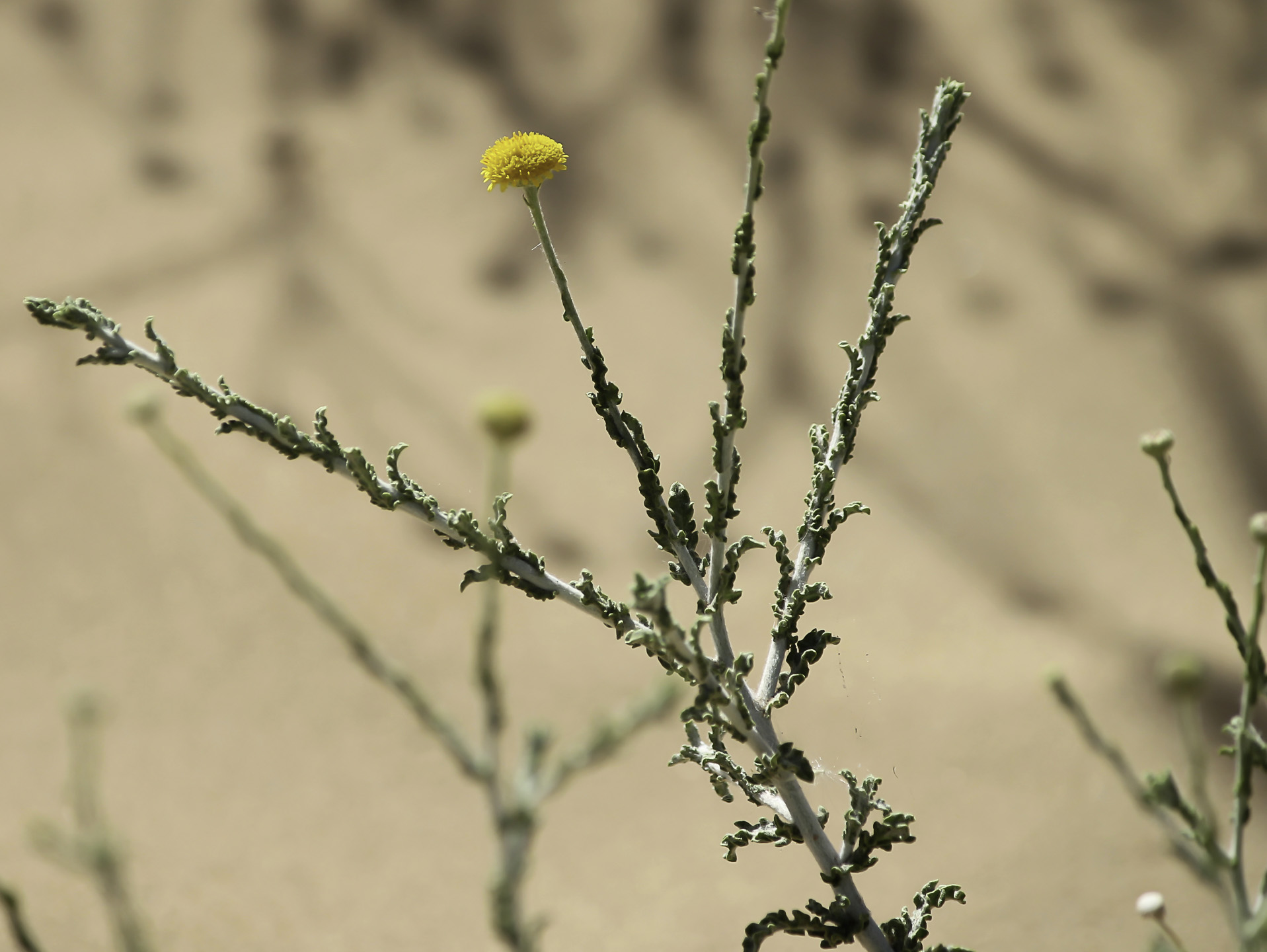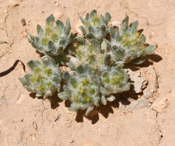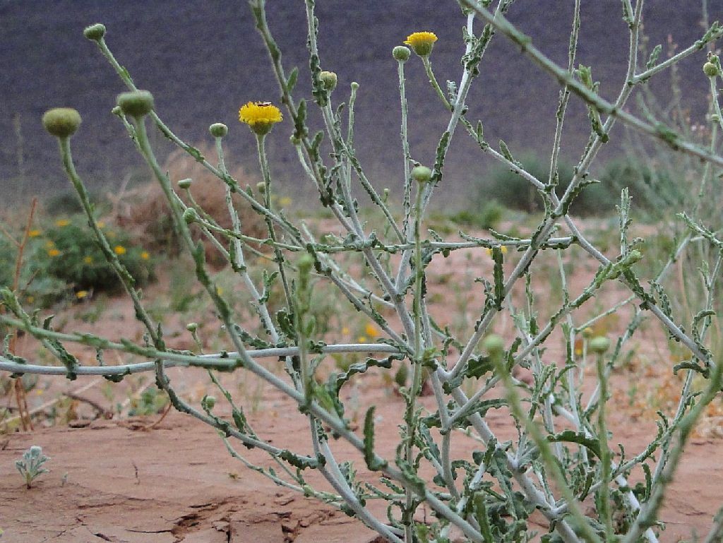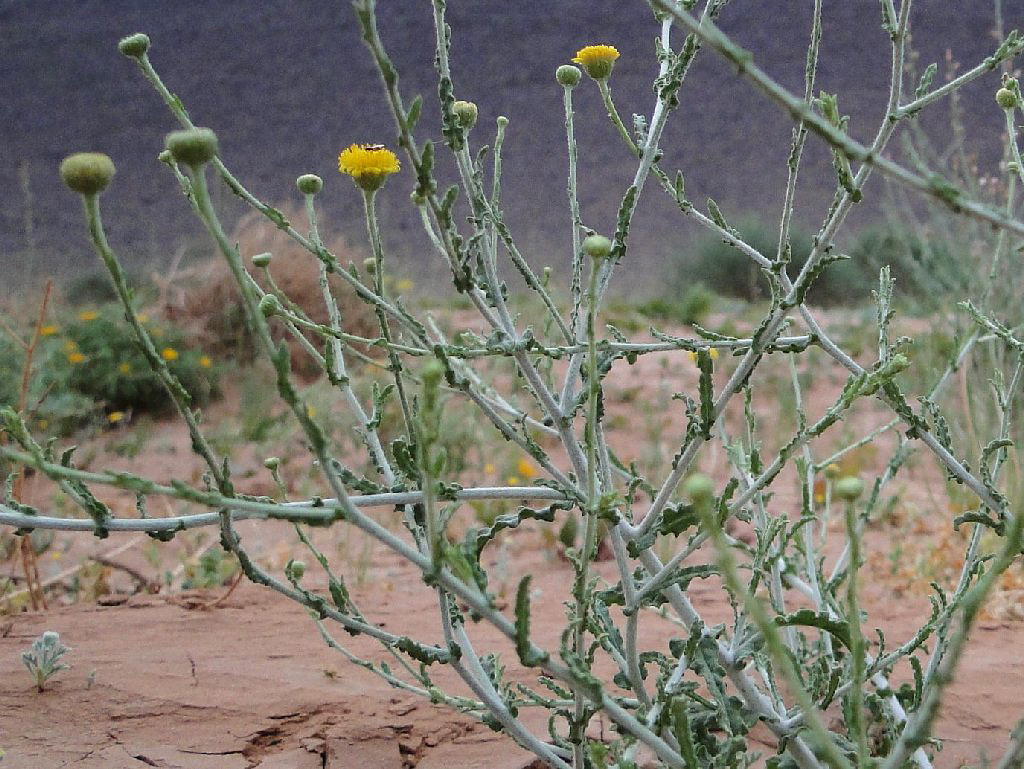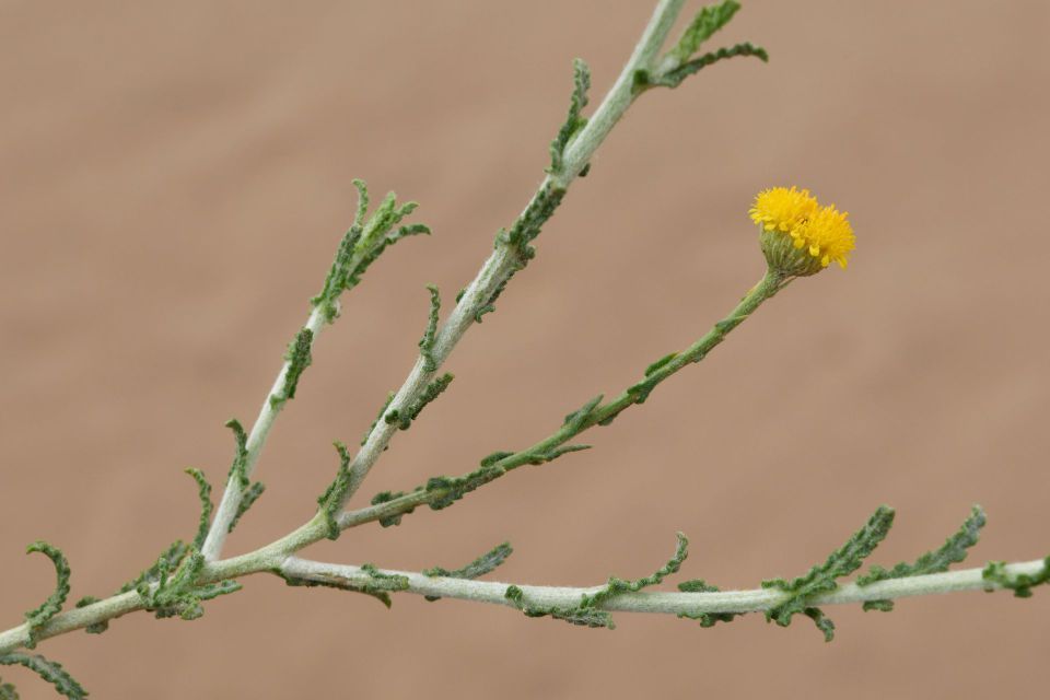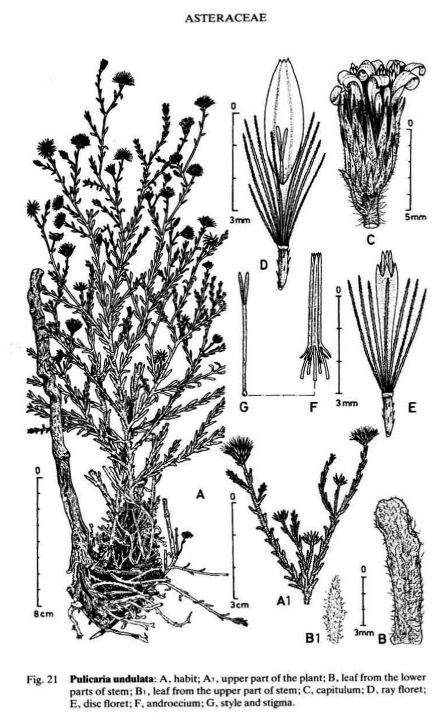 Pulicaria undulata (L.) C.A.Mey. / Homotypic Synonyms: Francoeuria crispa (Forsk.) Cuss., / Infraspecifics: Pulicaria undulata ssp. undulata, it is a perennial plant, up to 25-30 cm tall, aromatic, suffrutescent, very showy, densely glandular, pubescent. Leaves 20-35 (-50) x (5-) 8-12 mm. broadly oblanceolate to ± spathulate, acute undulate-toothed, densely villous and glandular on both surfaces; hairs long, straight. greyish-white. Basal leaves attenuate into a small petiole. auriculate. Upper leaves sessile, semi-amplexicaule. Capitula solitary on 20-40 mm long, slender, somewhat flexuous peduncles, 10-15 (-20) mm in diameter, distinctly radiate, orange yellow. Involucral bracts 3-rowed, narrowly oblanceolate or linear-oblong, acuminate, densely villous. Outer ones up to7mm long, herbaceous.  Inner ones up to 12 mm long, scarious. Ray florets many, ligule distinctly exceeding the involucre, patent; basal tube 4-5 mm long, filiform, base inflated, hairy all over; limb 8-10 x 0.5-0.75 (-1) mm, linear-oblong, 3-toothed, under surface and margins hairy. Disc florets corolla 5-6 mm long, tubular, narrowly obconical 5-lobed; lobes narrow, sharply acute, margins somewhat thickened. Cypsela 1.5-2 mm, cylindrical, finely ribbed, sparsely hairy; basal callus oblique, not very distinct; pappus 2-rowed; outer row coronate, toothed at the apex; inner row of c. 15 setae; setae unequal, up to 4.25 mm, scabrid.