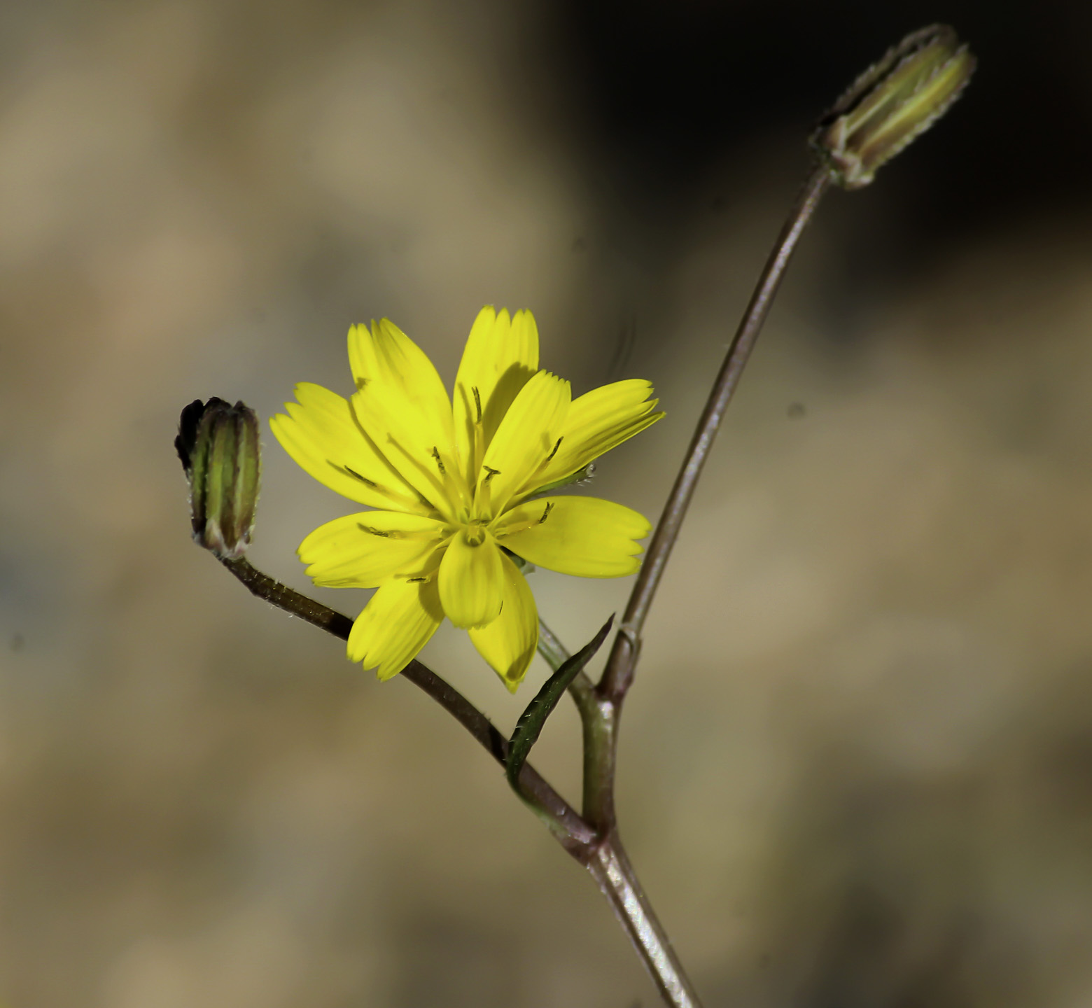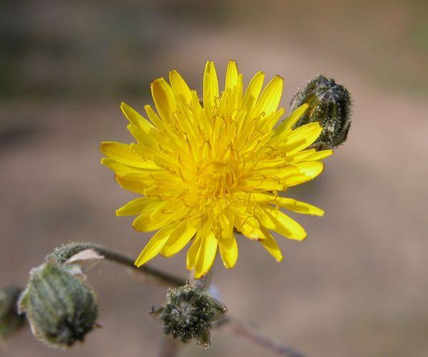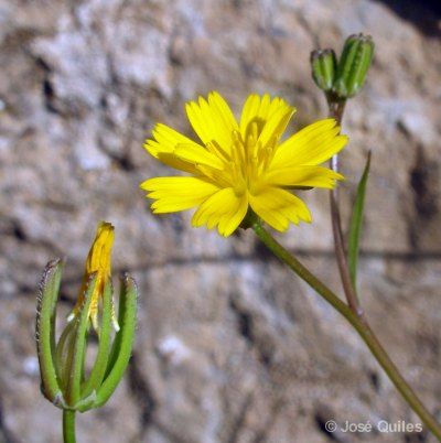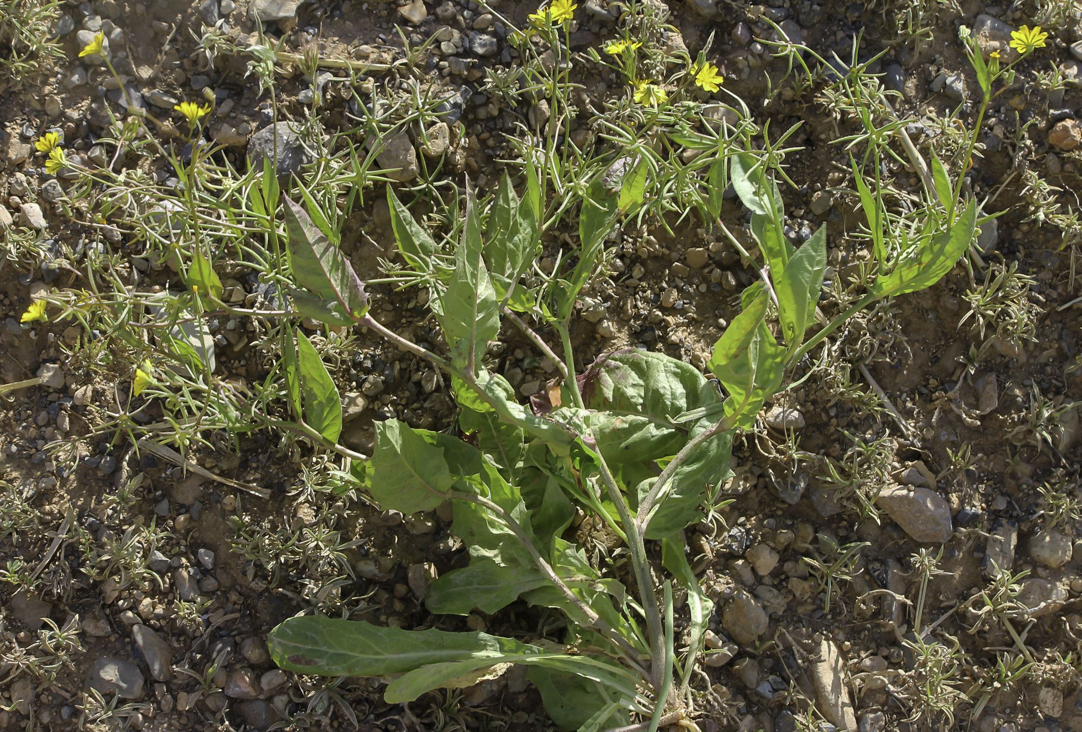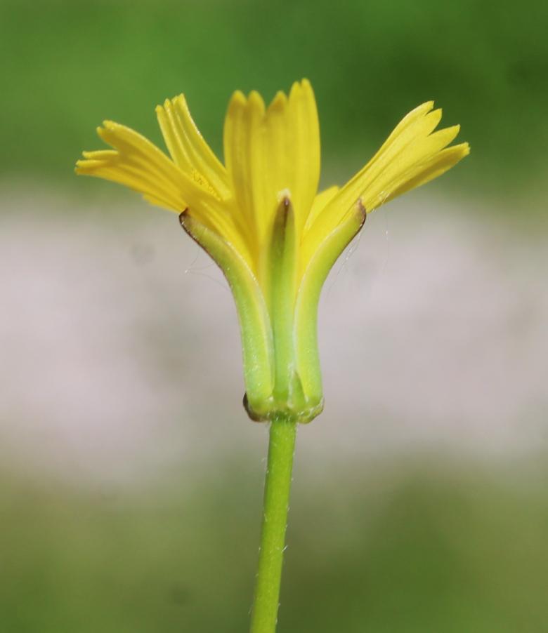 Rhagadiolus stellatus (L.) Gaertn., it is an annual herb, up to (5-) 7-35 (-50) cm, ascending, branched, pubescent to sparsely hairy or glabrescent, herbaceous or somewhat woody annual. Basal and lower cauline leaves 25-140 x 10-70 mm, oblong-ovate, coarsely dentate, lyrate or pinnatilobed. Upper cauline leaves much smaller, sub entire, narrowly lanceolate. Involucre 5-8 x 2.5-3.5 mm at anthesis, enlarging in fruit. Outer involucral bracts 5, very small, ovate, scarious. Inner involucral bracts 5-8, narrowly linear-lanceolate, nearly herbaceous, glabrous often with a median row of small, setulose hairs or hispid-pubescent throughout. Outer cypselas 10-15 x 1-1.5 mm, weakly curved in, forming a characteristic radiating infructescence. Inner cypselas strongly incurved, glabrous or pubescent. Pappus absent.