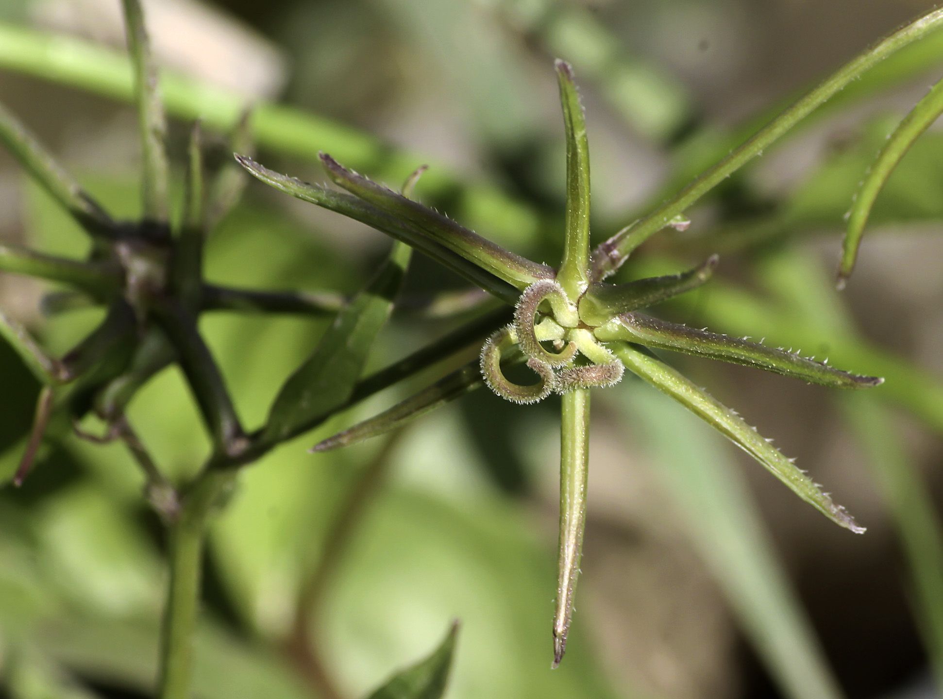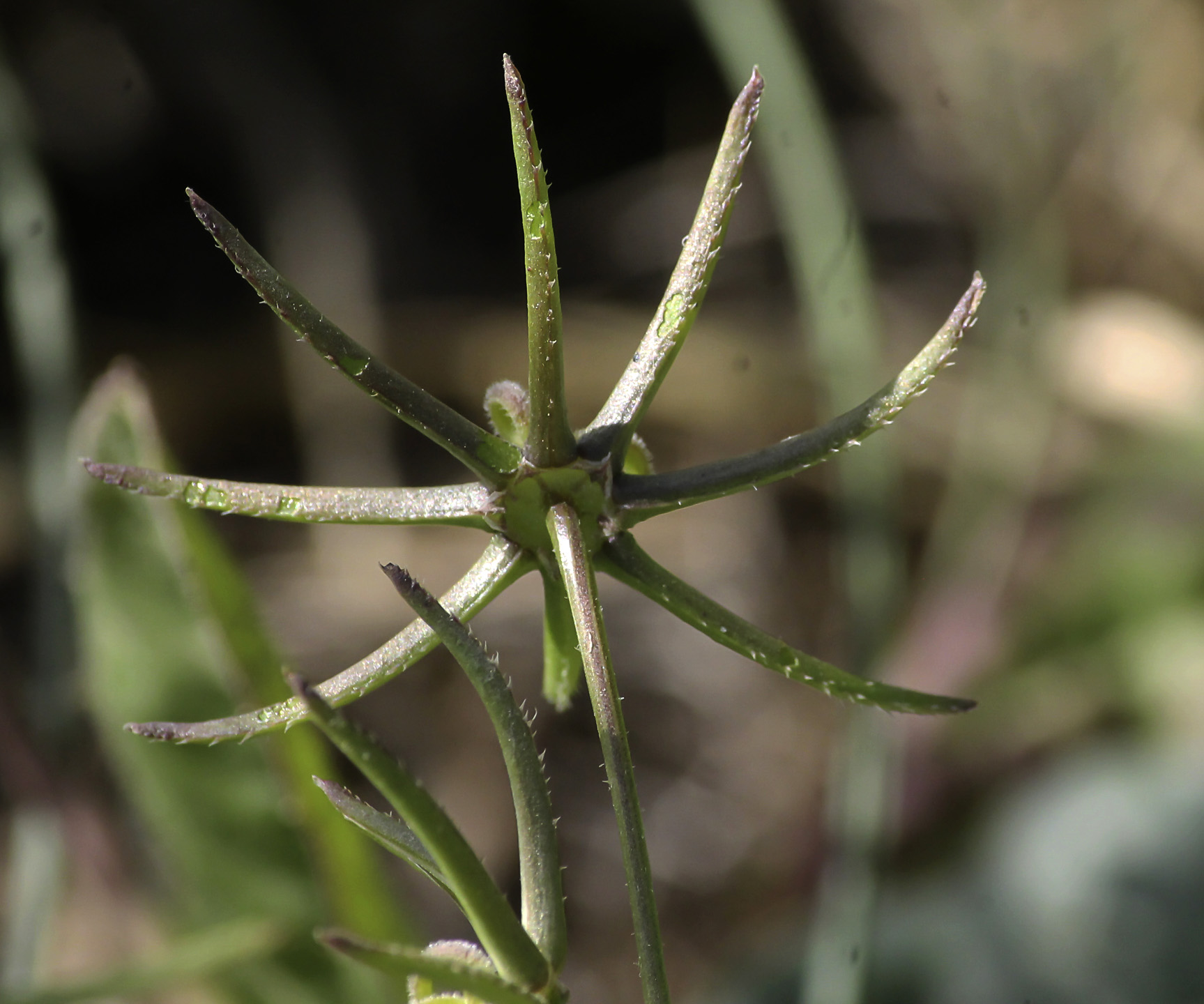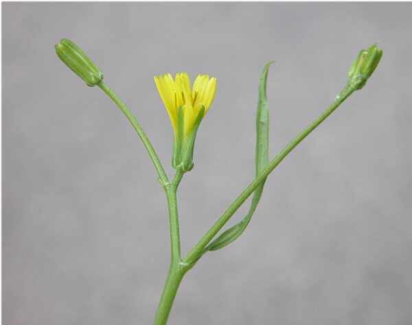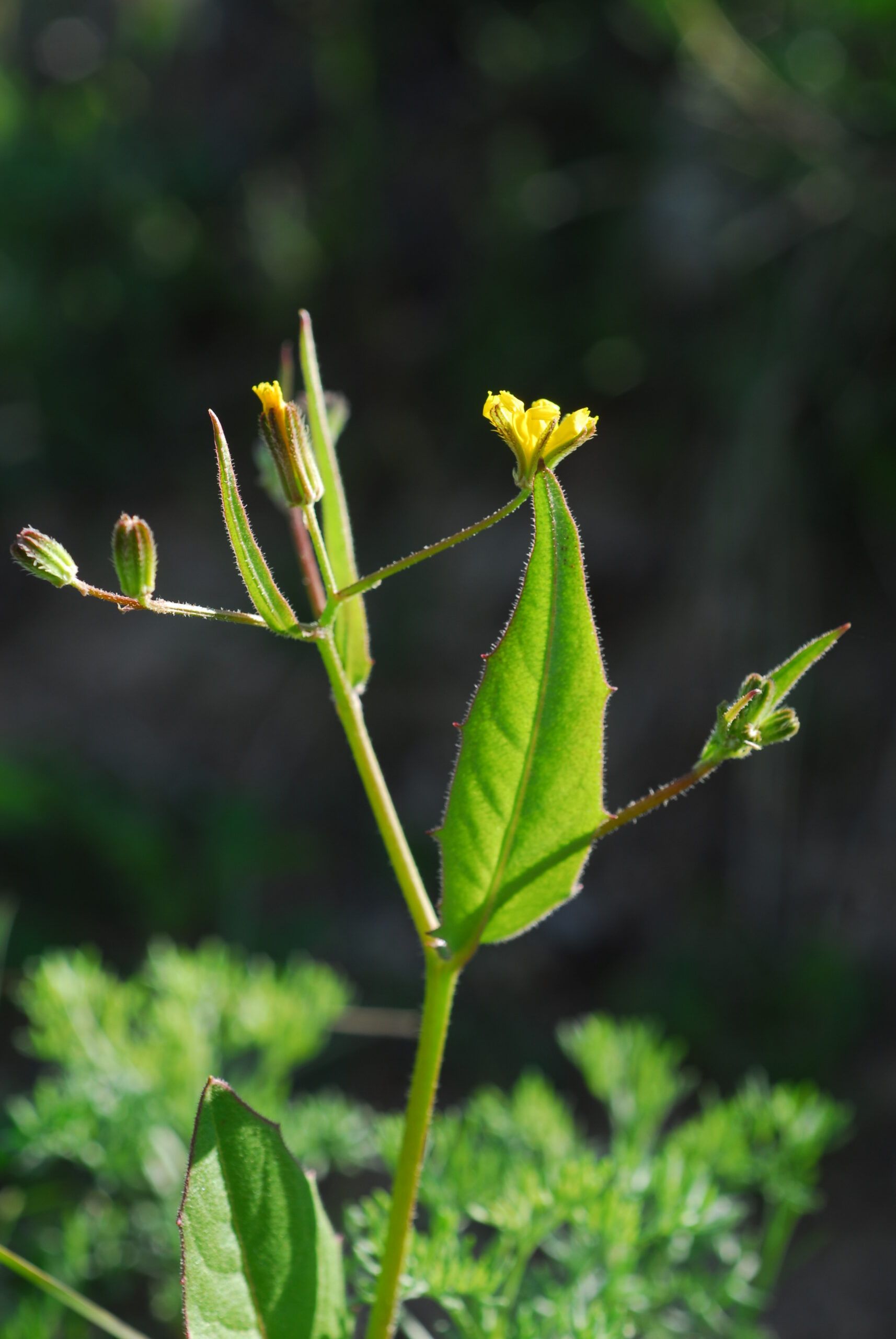 Rhagadiolus stellatus (L.) Gaertn., it is an annual herb, up to (5-) 7-35 (-50) cm, ascending, branched, pubescent to sparsely hairy or glabrescent, herbaceous or somewhat woody annual. Basal and lower cauline leaves 25-140 x 10-70 mm, oblong-ovate, coarsely dentate, lyrate or pinnatilobed. Upper cauline leaves much smaller, sub entire, narrowly lanceolate. Involucre 5-8 x 2.5-3.5 mm at anthesis, enlarging in fruit. Outer involucral bracts 5, very small, ovate, scarious. Inner involucral bracts 5-8, narrowly linear-lanceolate, nearly herbaceous, glabrous often with a median row of small, setulose hairs or hispid-pubescent throughout. Outer cypselas 10-15 x 1-1.5 mm, weakly curved in, forming a characteristic radiating infructescence. Inner cypselas strongly incurved, glabrous or pubescent. Pappus absent.