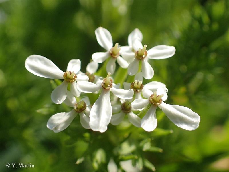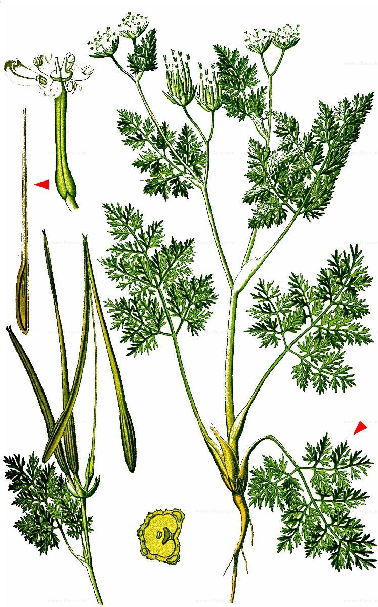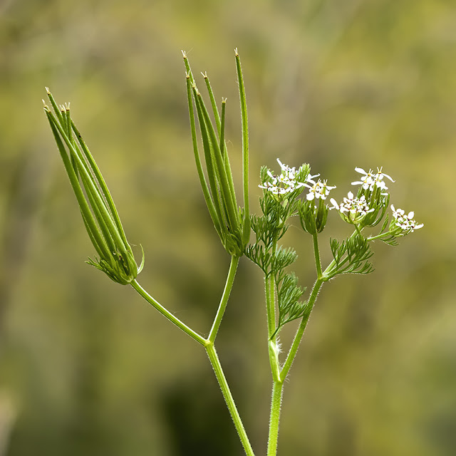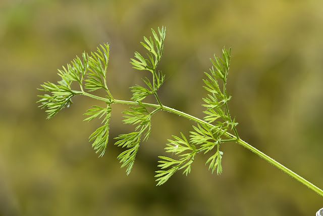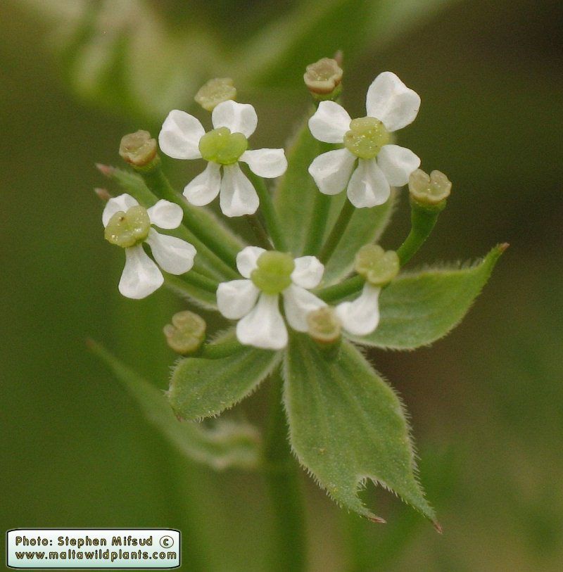 Scandix pecten-veneris L., it is an annual herb, sub erect to spreading, up to 35 (-50) cm tall, much branched from base, pilose or hispid-villose to sub glabrous, with furrowed stem. Leaves oblong to triangular-ovate, (1-) 5-20 x (0.5) 1-8 cm, 3-pinnatisect into linear-lanceolate, (0.75-) 2-5 (-8) x 0.5-2.5 mm. acute or obtusish, mucronulate, ± recovered, setulose margined ultimate segments; lower leaves with slender, up to c. 10 cm or more long, caoaliculate petiole; upper leaves short-petioled or sub sessile. Leaf sheath 0.3-2 cm long, villose on margins. Umbels 1-2 (-3)-rayed on terminal and lateral, glabrous, 1-3 cm long peduncles; rays sub equal, 1-3 (-4) cm long, acerescent and thickened in fruit. with villose margins. Umbellules 3-8 (-10)-flowered. Pedicels ± equal, 2-4 mm long, thickened in fruit. Bractlets 3-5, lanceolate, (2-) 4-8 (-10) x (1-) 1.5-4 mm, often 2-3 (-5)-fid or deeply emarginate, rarely entire and acuminate at the apex, ciliate on margins. Petals unequal, obovate, (0.75) 2-3 mm long, ± radiating, shortly notched, white. Anthers yellow. Styles erect, 2-3 times as long as stylopodium. Fruit linear subulate, 3-5 (-7.5) x0.2-0.35 cm (incld. beak), robust, strongly compressed dorsally, usually scabrid; beak 3-4 times as long as seed, bearing part of the mericarps, gradually narrowed upwards, ± striale; mericarps prominently ribbed.