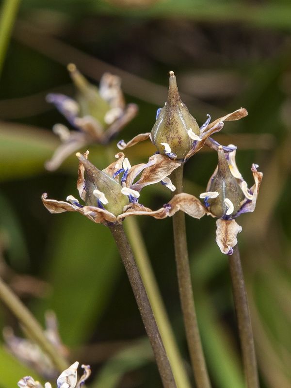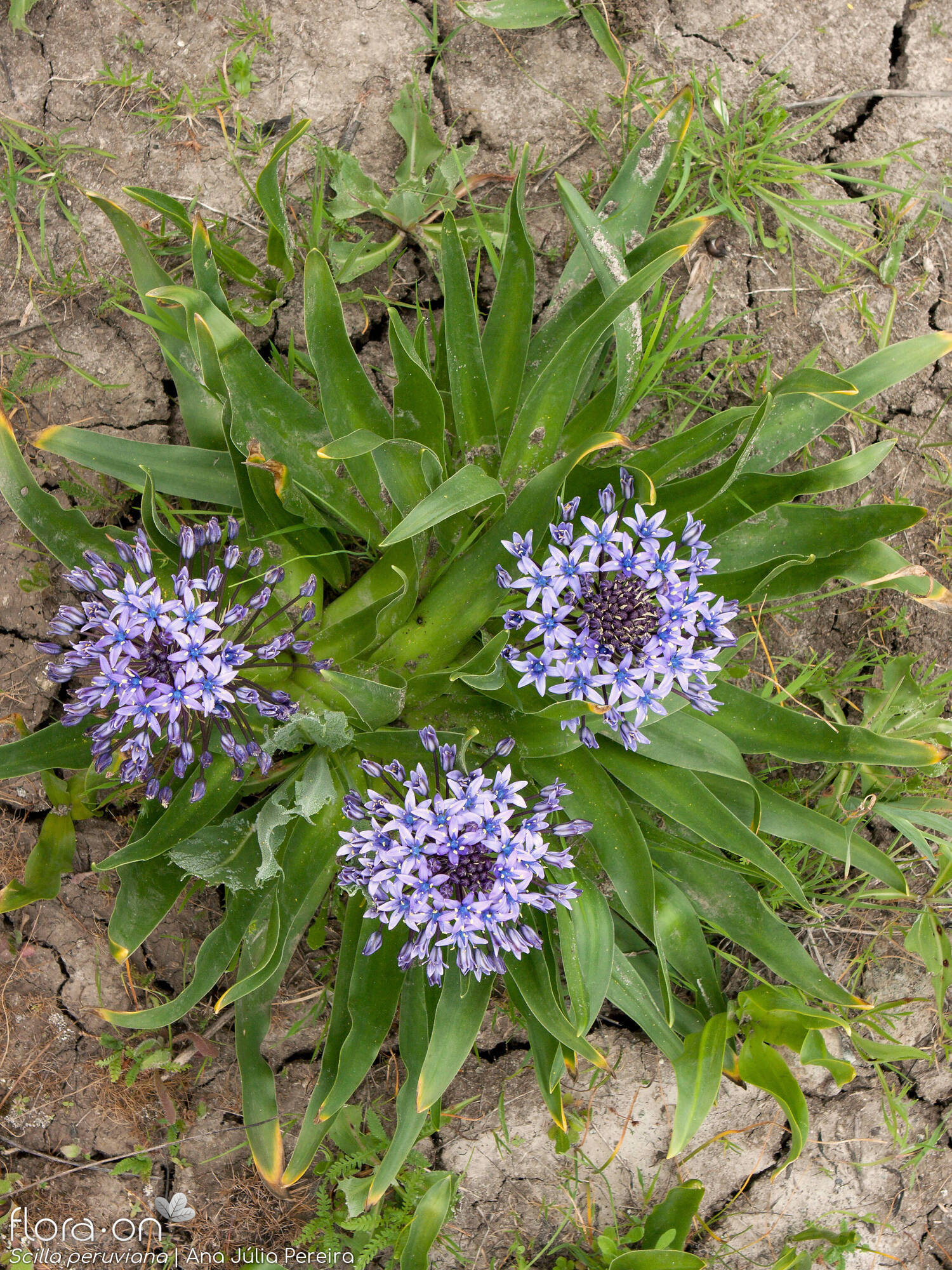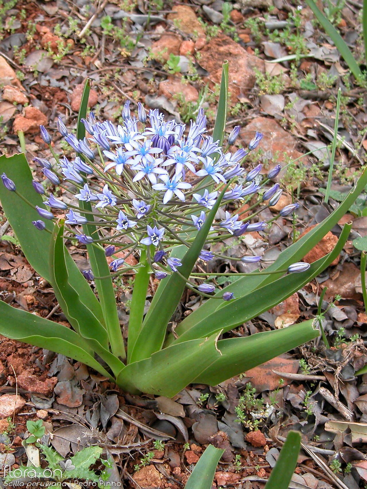 Scilla peruviana L., it is a bulbous geophyte, green herb with rhizomatous discoid stem and fibrous roots. Bulb ovoid. 2-7cm diam., covered with several layers of membranous brown to dark-brown, coriaceous tunics. Leaves basal usually on the ground surface, forming a rosette, linear. 8-24 x 1-2 cm, glabrous with smooth surface and ± pointed, slightly curving inside tip, margins dentate. Scape 6-20 cm long, smooth, cylindrical, many flowered. Pedicels 2-9 cm long. Bracts membranous, linear. uninerved, with dentated tip margins, 1.2-2 cm long. Perianth stellate to campanulate. Tepals free, ± equal, lanceolate with ± pointed tip incurved, 5-8 x 2-3 mm uninerved, blue to violet-bluish in colour. Stamens 6. shorter than tepals, 4-6 mm long; filaments filiform with broad base and attenuate tip. Anthers dorsifixed, oblong linear. Ovary and Style pear-shaped; stigma capitate. Capsule pear-shaped, containing 12-18 ovoid to sub globular. Black seeds, c. 2 mm long.