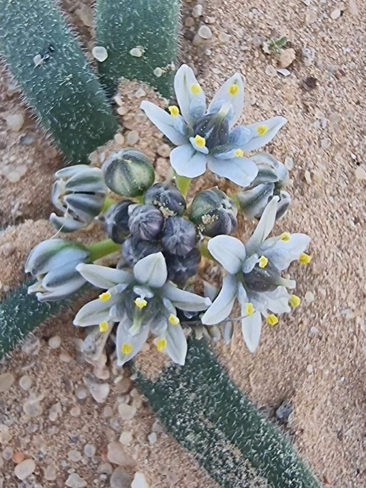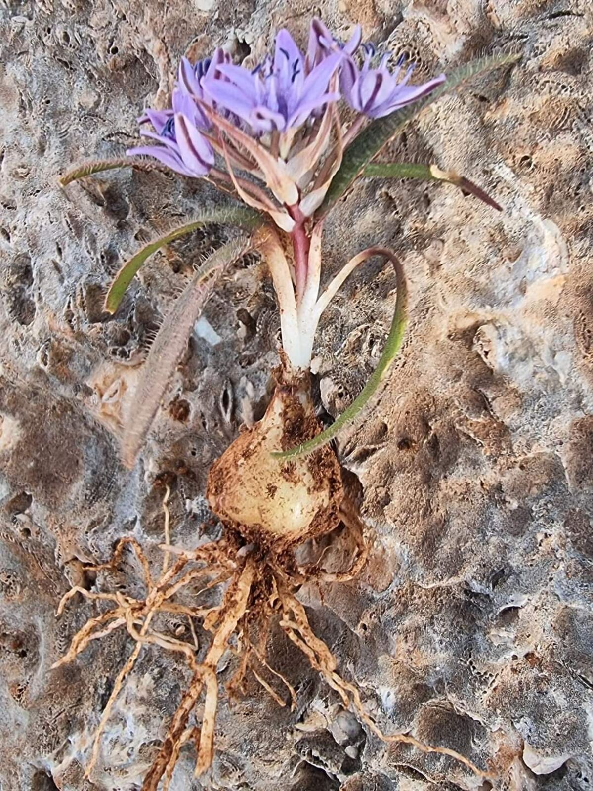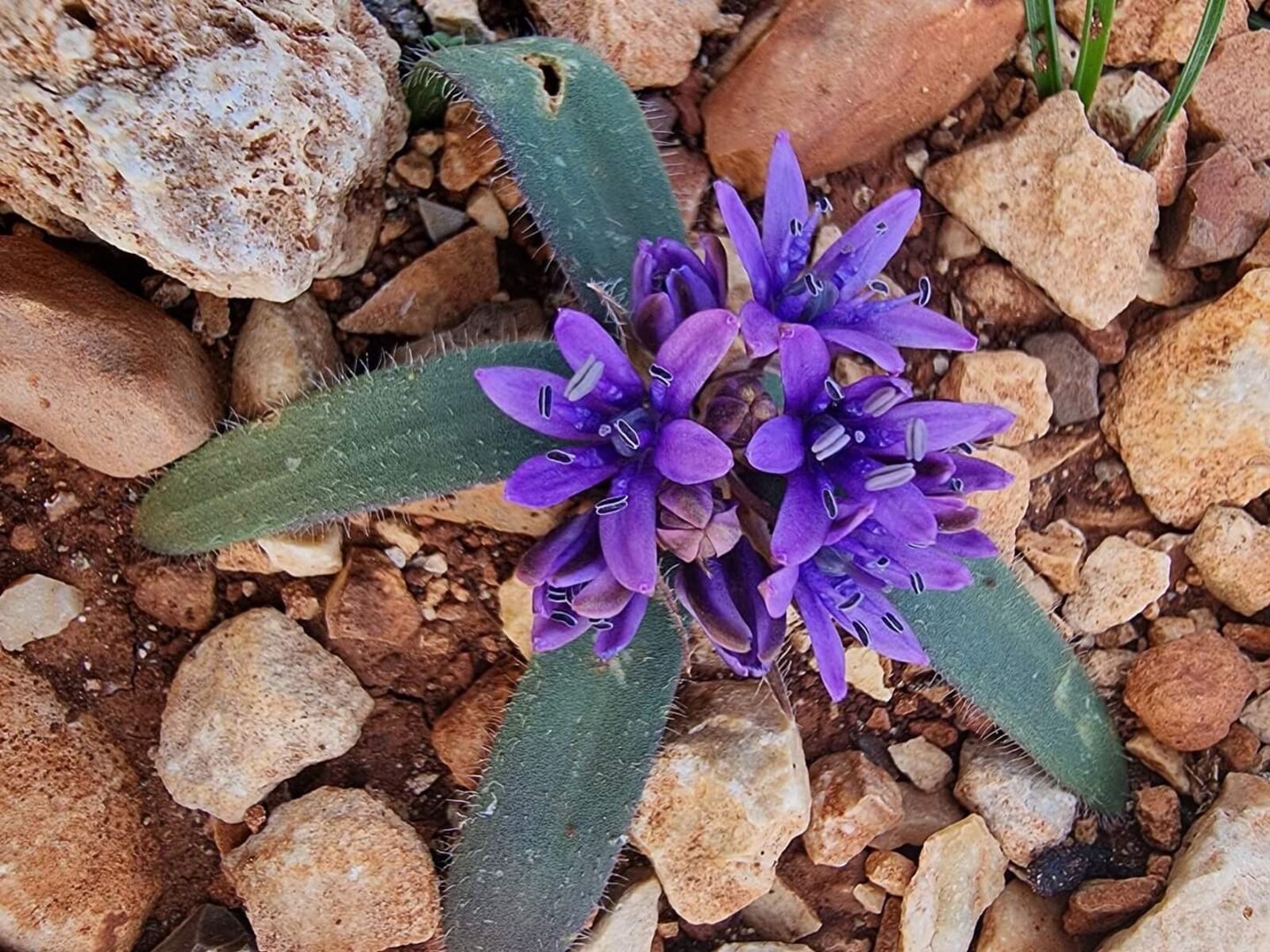 Scilla villosa Desf. / Homotypic Synonyms: Oncostema villosa (Desf.) Raf., it is a bulbous geophyte, similar to the Scilla peruviana L., but much smaller; roots fibrous, attached to discoid, rhizomatous stem. Bulb ovoid to spherical membranous with papery tunics, 1-3 cm diam.; outer tunics brownish. Leaves basal, usually spreading on ground, lanceolate, dark-green in colour, basal portion whitish to reddish, leaf margins ciliate, lower surface villose and the upper usually glabrous, 7-10 x 0.7-0.8 cm with ± attenuate tip. Scape cylindrical, 3-6 cm long, glabrous. 3-12-flowered. Flowers pedicellate; pedicels 0.7-1 cm long; bracts linear to oval lanceolate, membranous, uninerved and margin ciliate. Perianth ± stellate. Tepals 6, free, oblong-lanceolate uninerved, with papiliose tips, violet-rosaceous to dark violet, 5·6 x 1.5-2 mm. Stamens 6, shorter than tepals; filaments filiform, broad at base and attenuating towards the tip. Anthers ± oblong, midifixed, yellowish in colour. Ovary and style pear-shaped with capitate stigma. Capsule ovoid acuminate, 3-angled. Seeds ovoid black, c. 3 mm long.