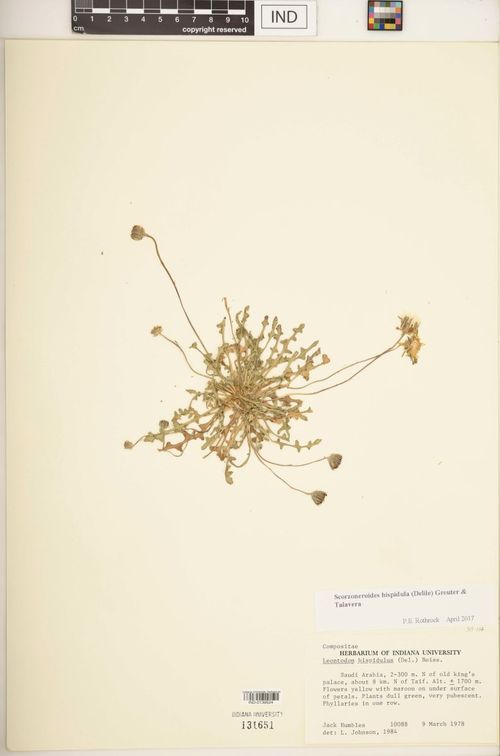 JEFFREY, C. (1979). Compositae in L. BOULOS (ed.) – A check-list of the Libyan flora. 3. Compositae. – Candollea 34: 313 – under: Leontodon hispidulus (Delile) Boiss. https://www.e-periodica.ch/digbib/volumes?UID=can-002