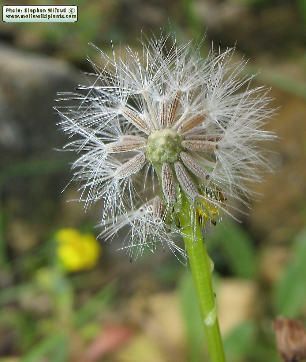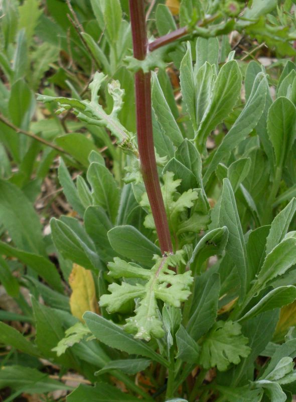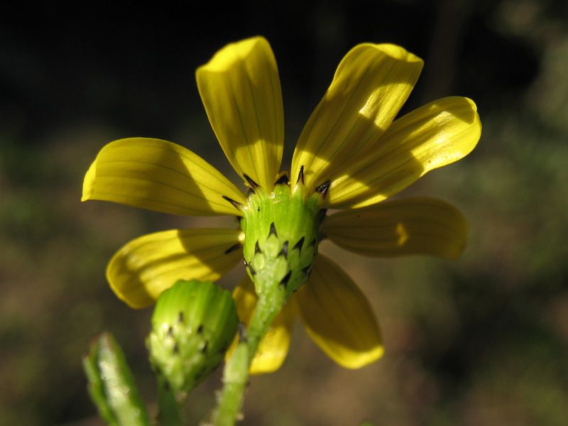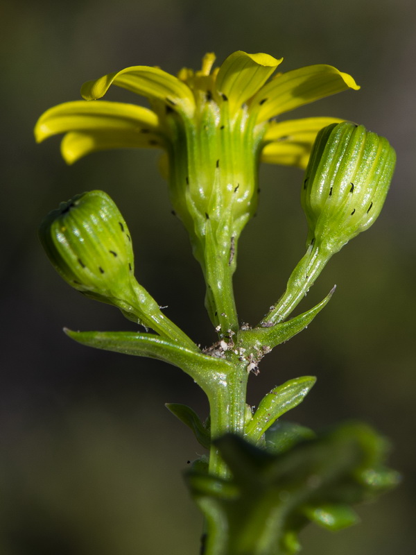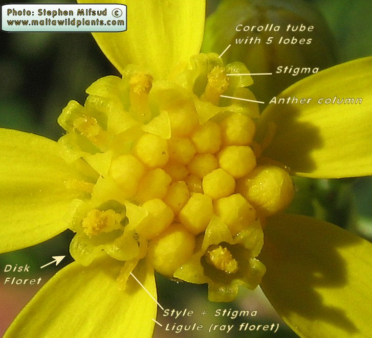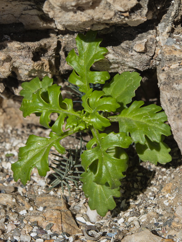 Senecio leucanthemifolius Poir., it is a sub glabrous annual, up to 40 cm. Leaves fleshy, pinnatisect. Basal leaves usually obovate, dentate. Cauline leaves variously dissected, often coarsely pinnatifid, with entire to shallowly dentate auricles. Inflorescence subcorymbose with few capitula. Capitulum 15-22 mm in diameter. Involucral bracts 5-7 mm, linear-lanceolate, glabrous, black tipped; supplementary bracts several, up to 2 mm, usually blackish. Ligules c. 13, c. 8 mm, yellow. Achenes 2-2.5 mm, usually shortly sub appressed-hairy on ridges.