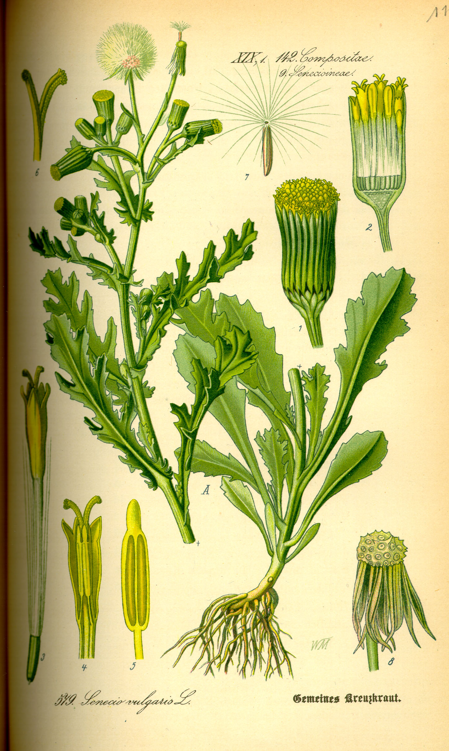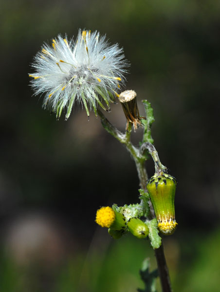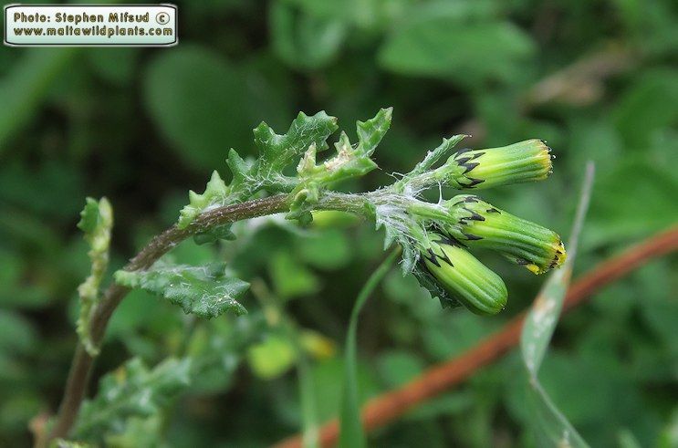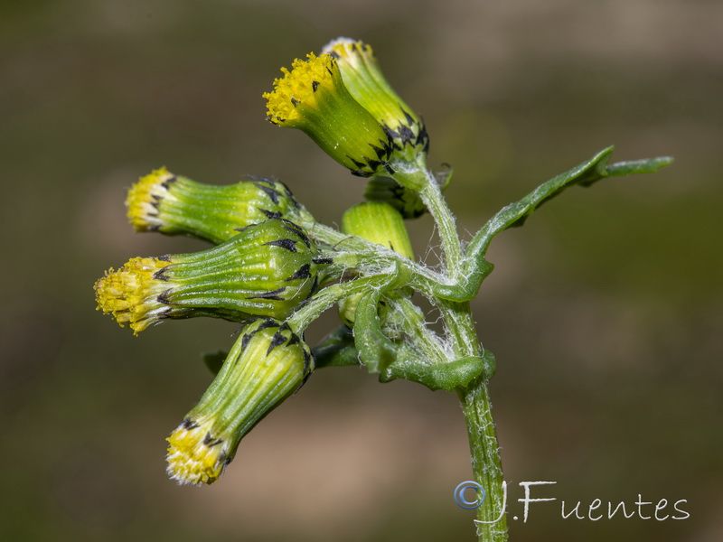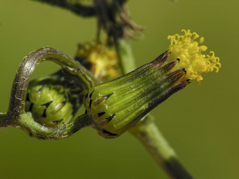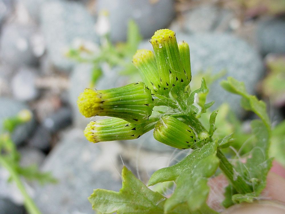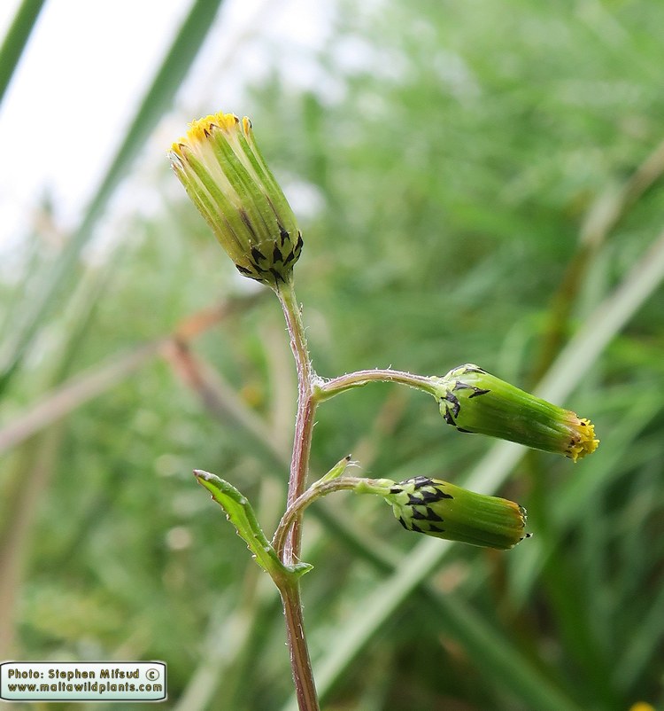 Senecio vulgaris L., it is a sub glabrous or somewhat floccose, rather succulent annual, up to 40 cm, with weak, irregularly-branched stems. Leaves coarsely pinnatifid with distant, obtuse, toothed lobes. Basal and lower cauline leaves oblanceolate in outline, shortly petiolate. Middle and upper cauline leaves oblong in outline, auriculate-amplexicaul. Capitula numerous, 4-5 mm in diameter (in common discoid variant), sub sessile in dense, subcorymbose clusters at anthesis. Peduncles elongating in fruit. Involucre cylindrical. Involucral bracts 5-8 mm, usually glabrous and often black-tipped; supplementary bracts 8-10, 1-2 mm, usually black-tipped, sometimes blackish throughout. Ligules usually absent, sometimes 6-12, yellow, short, revolute immediately after anthesis. Achenes 1.5-2(-2.5) mm, appressed-hairy between the ribs.