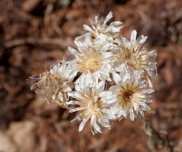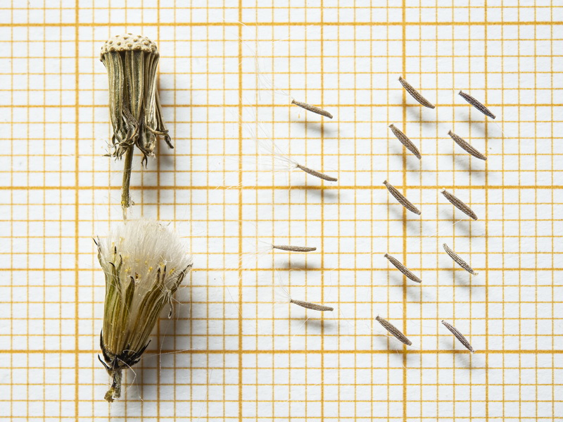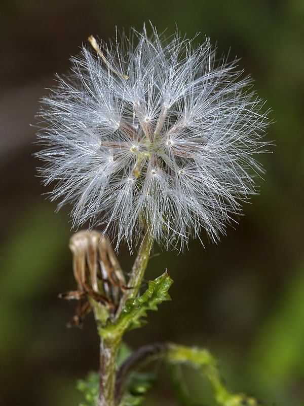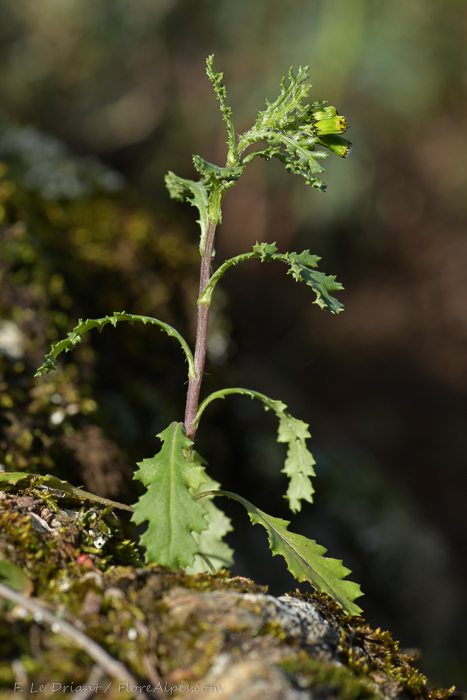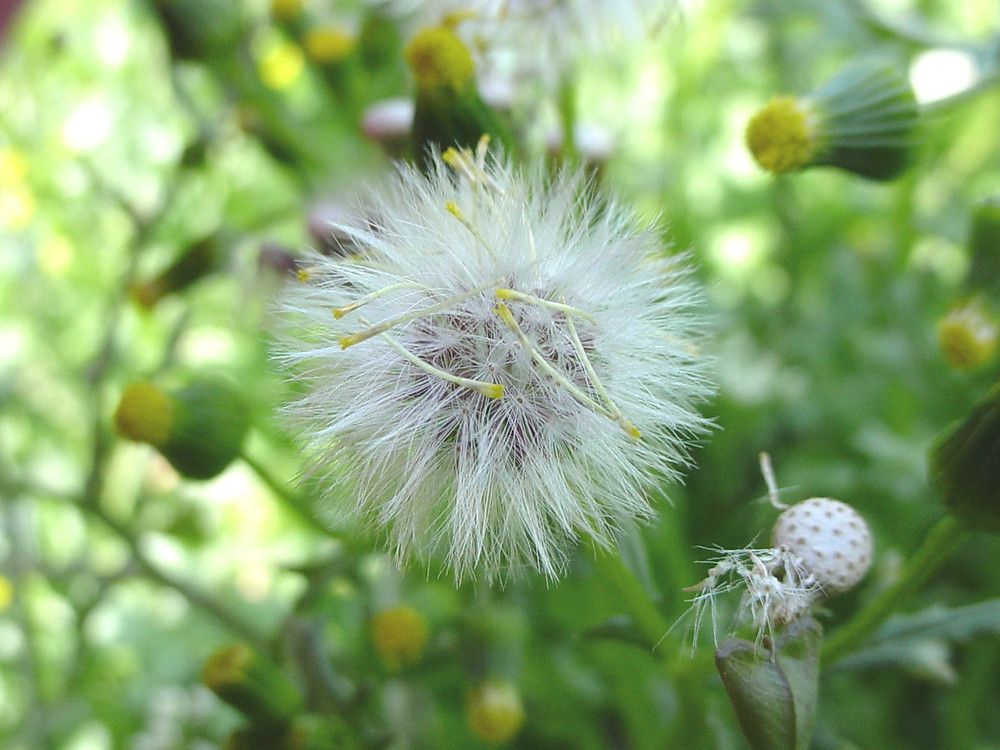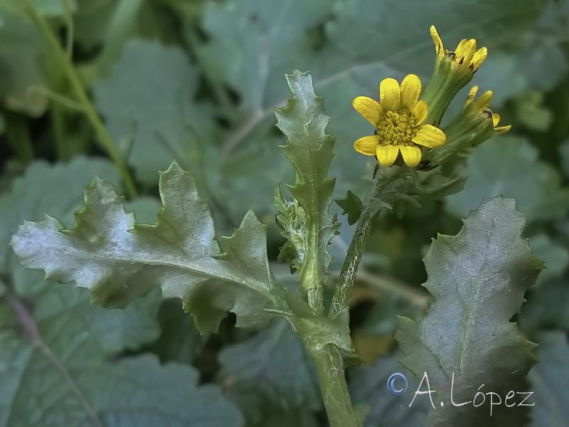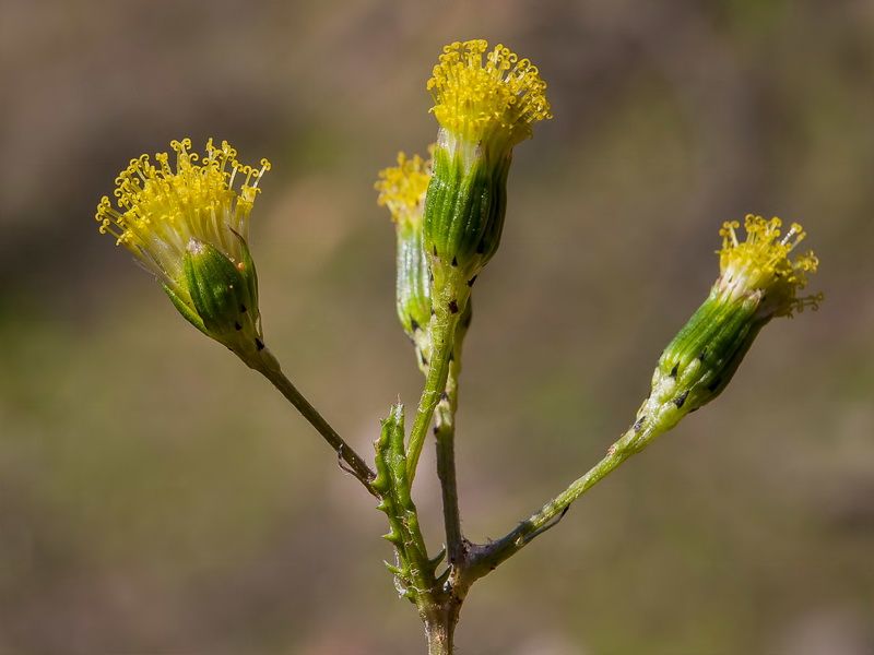 Senecio vulgaris L., it is a sub glabrous or somewhat floccose, rather succulent annual, up to 40 cm, with weak, irregularly-branched stems. Leaves coarsely pinnatifid with distant, obtuse, toothed lobes. Basal and lower cauline leaves oblanceolate in outline, shortly petiolate. Middle and upper cauline leaves oblong in outline, auriculate-amplexicaul. Capitula numerous, 4-5 mm in diameter (in common discoid variant), sub sessile in dense, subcorymbose clusters at anthesis. Peduncles elongating in fruit. Involucre cylindrical. Involucral bracts 5-8 mm, usually glabrous and often black-tipped; supplementary bracts 8-10, 1-2 mm, usually black-tipped, sometimes blackish throughout. Ligules usually absent, sometimes 6-12, yellow, short, revolute immediately after anthesis. Achenes 1.5-2(-2.5) mm, appressed-hairy between the ribs.