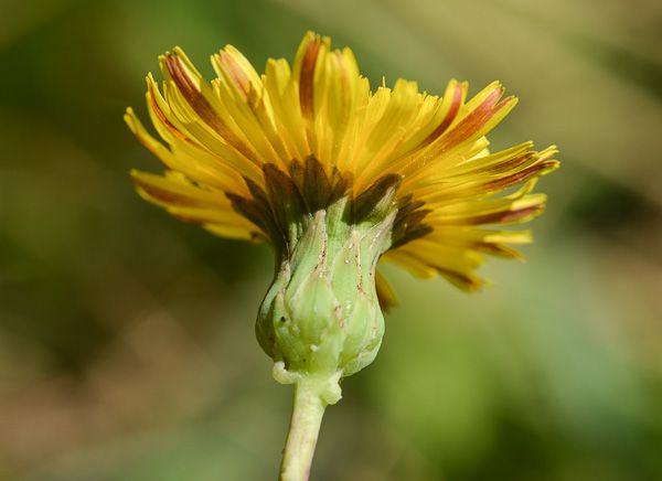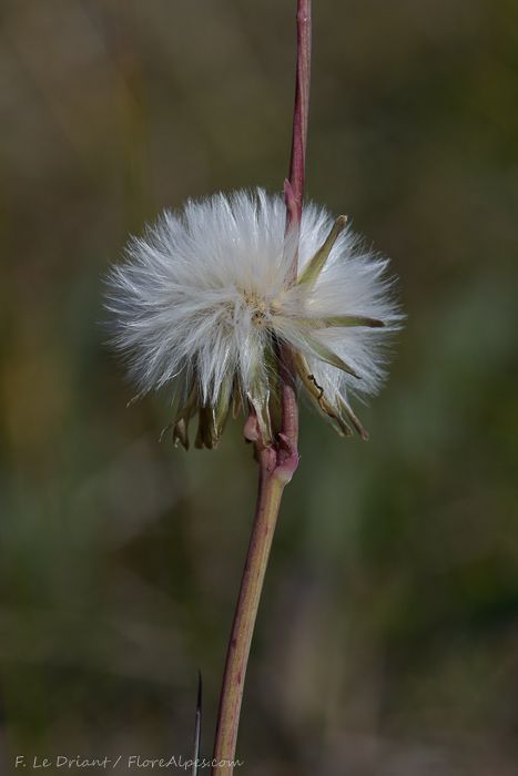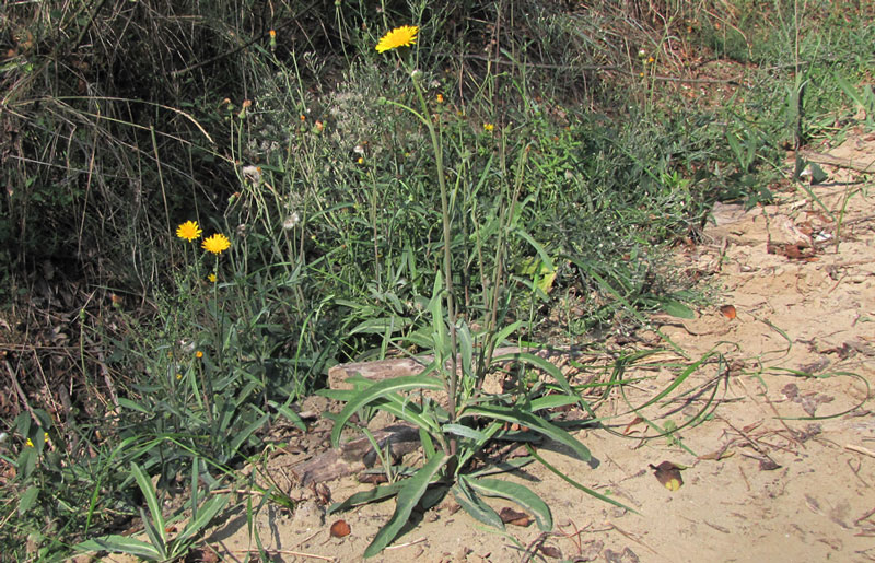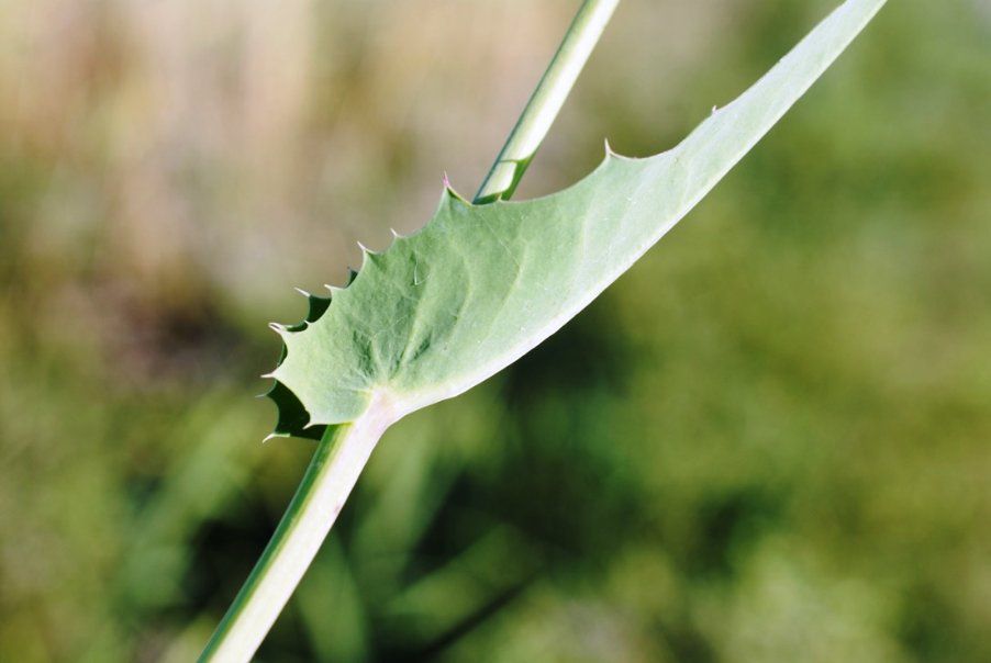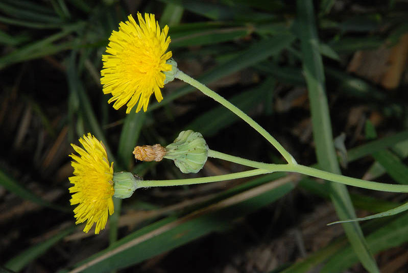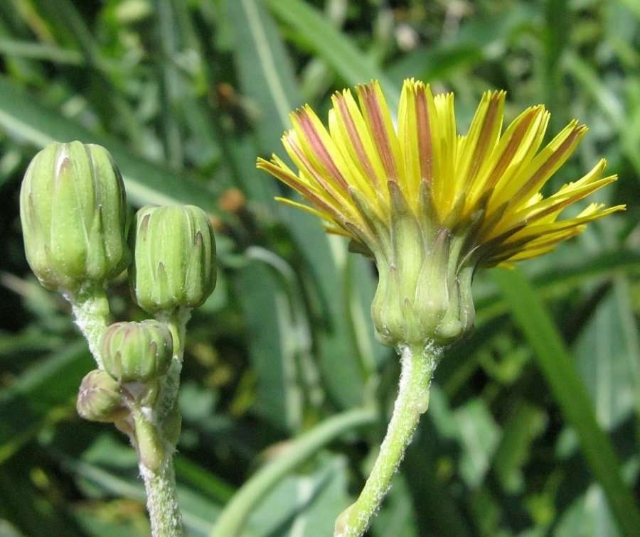 Sonchus maritimus L., it is a perennial or rhizomatous geophyte, 15-60 cm tall, simple or sparingly branched, glabrous plants of marshy habitat, stems usually hallow. Lower leaves glabrous, sub coriaceous, linear or linear-lanceolate, entire or sinuate toothed, petiolate. Middle and upper cauline leaves linear to oblong, sessile, auriculate, entire or weakly sinuate-toothed rarely pinnatisect, tomentose beneath when young; auricles rounded, often dentate. Capitula c. 20-30 mm in diam., in a lax corymb on elongated peduncles; base of the capilulum and upper part of the peduncle often white tomentose, eglandular hairy. Involucre 10-15 mm. Outer Involucre bracts 3-7 x 1-2 mm broadly ovate to ovate-lanceolate, acute; Inner Involucre bracts 10-12 x 2-2.5 mm., linear-lanceolate, obtuse. Ligule limb much longer than the basal tube. Cypsela 2.2-3 x 1-1.6 mm, oblong to elliptic, slightly compressed, with 4-5-longitudinal ribs, the median and the two lateral well marked, usually with broad, thick and ± obtuse margin, weakly rugose between the ribs of smooth; pappus 5.5-9 mm, deciduous.