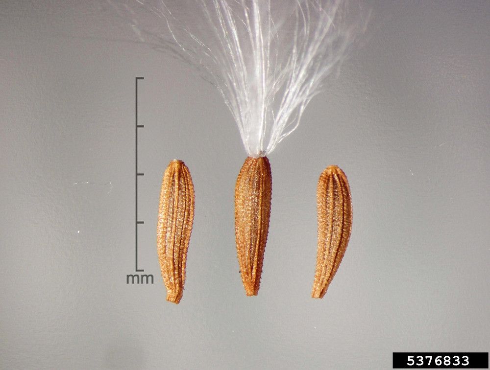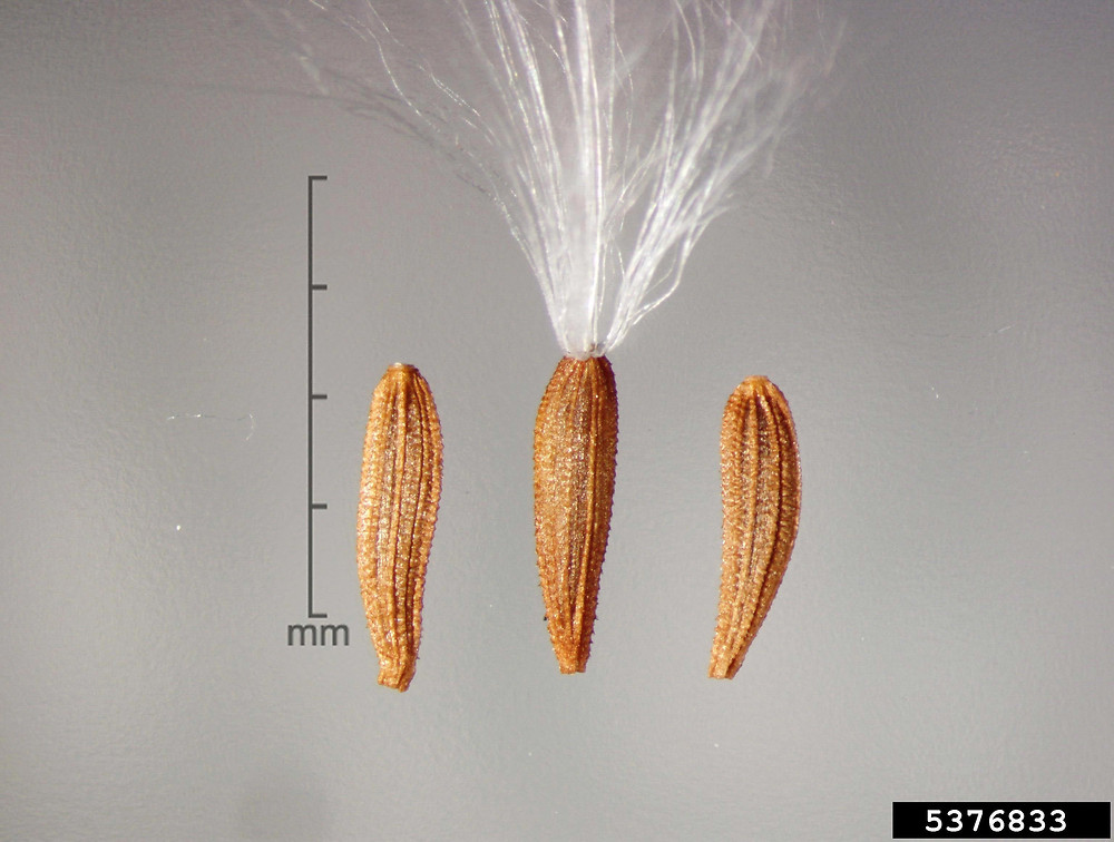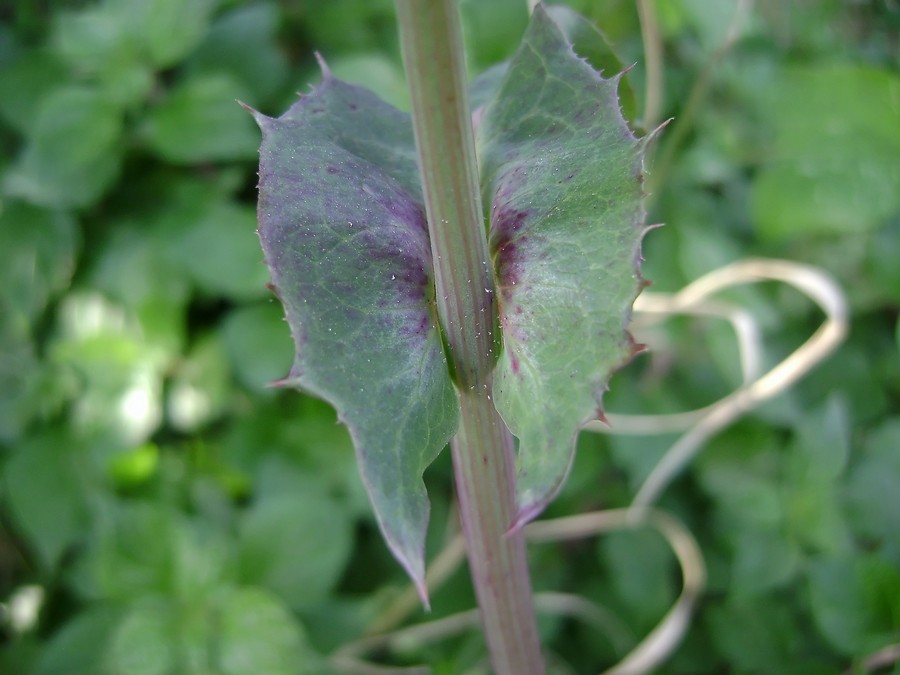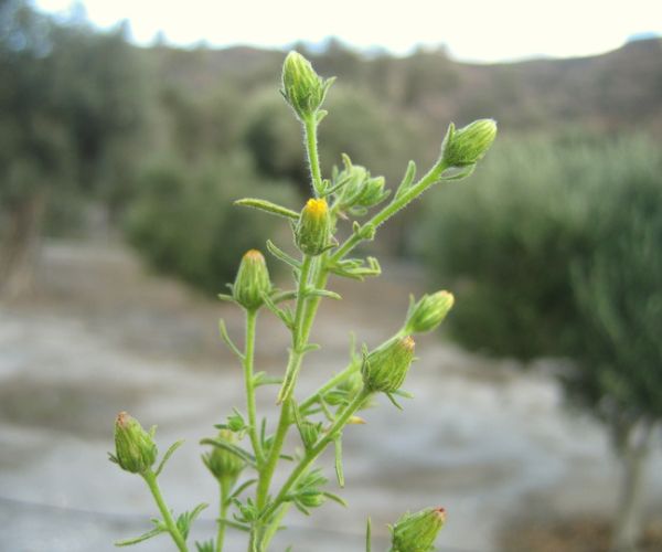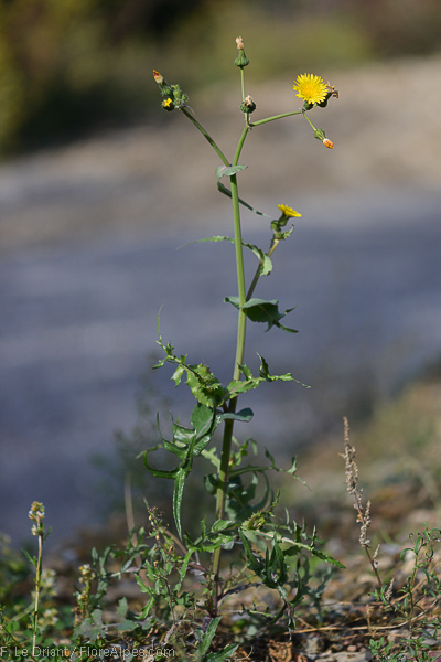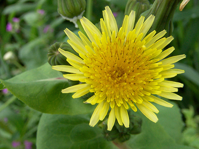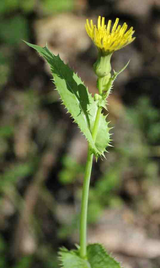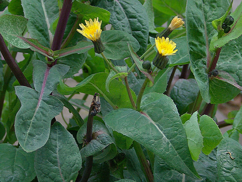Sonchus oleraceus L., it is an annual or biennial herb, up to (10-) 30-100 (-140) cm, with stems simple or branched, often glandular-hairy above and often white, dense tomentose below the young capitula; branches few, cymose-sub umbellate in the inflorescence region. Basal leaves thin, obovate to ± spathulate in outline, entire to runcinate-pinnatifid, with broad, ± ordate or triangular apical lobe, irregularly toothed, tapered into a long, winged petiole, usually smaller than the mid-cauline leaves. Lower & mid-cauline leaves (40) 80-200 (-350) x (10-) 40-100 (-150) mm, variable in outline, pinnatifid to pinnatisect, lyrate or sometime runcinate lobed, sessile, auriculate; margins toothed; auricles acute, ± triangular or somewhat ovate and obtuse; leaf lobes triangular ovate, not or weakly constricted at the base. Upper most cauline leaves sessile, auriculate, entire to rarely pinnatifid, smaller than the mid-cauline leaves. Capitula 2-2.5 (-3) cm, in diam., several in cymose, sub umbellate panicles. Involucres cylindric-campanulate and with dense, white tomentum and often with glandular hairs at base when young, often become ± corky, glabrescent. urceolate-campanulate in late fruiting. Outer involucre bracts 2.5-7.5 x 1-2.5 mm, narrowly ovate, obtuse, often glandular hairy on the midrib. Middle involucral bracts 8-12 x2-3 mm, similar to the innermost ones. Innermost involucral bracts 8-12 x 1-2 mm. ± linear-lanceolate, obtuse-acute, with scarious margins. Ligule pale yellow to yellow, often the outer ones crimson at the back; limb ± equal to the basal tube. Cypsela (2-) 2.5-3 (-3.75) x 0.75-1 mm, obovate-oblong to oblanceolate, weakly compressed, not winged, with 3 ribs on each face, minutely tuberculate or finely rugose between the ribs; pappus (5-) 6-8 (-10) mm, ± persistent.