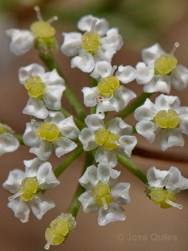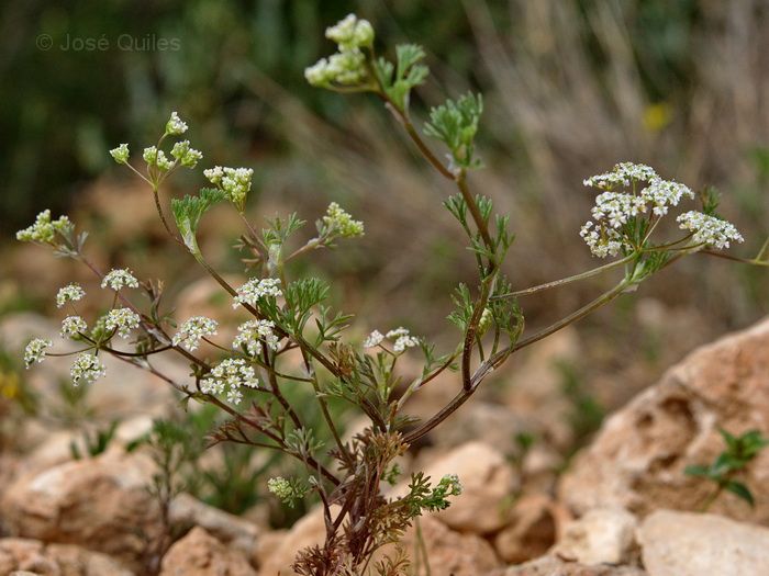 Stoibrax dichotomum (L.) Raf /Homotypic Synonyms: Brachyapium dichotomum (L.) Maire, it is an annual herb, up to 15 cm tall, slender, with or without odour of celery, ± dichitomously branched. Lower leaves 2-3-pinnatisccl, with 3-10 mm long, linear lanceolate to linear, acute lobes; petioles of upper leaves with wide membranous margins. Rays 4-8, filiform, minutely scabrid to glabrous. Bracts and bractcoles absent. Flowers white to pinkish. Fruit c. 1 mm, broadly cordate or reniform, densely papillose-scabrid to almost glabrous.