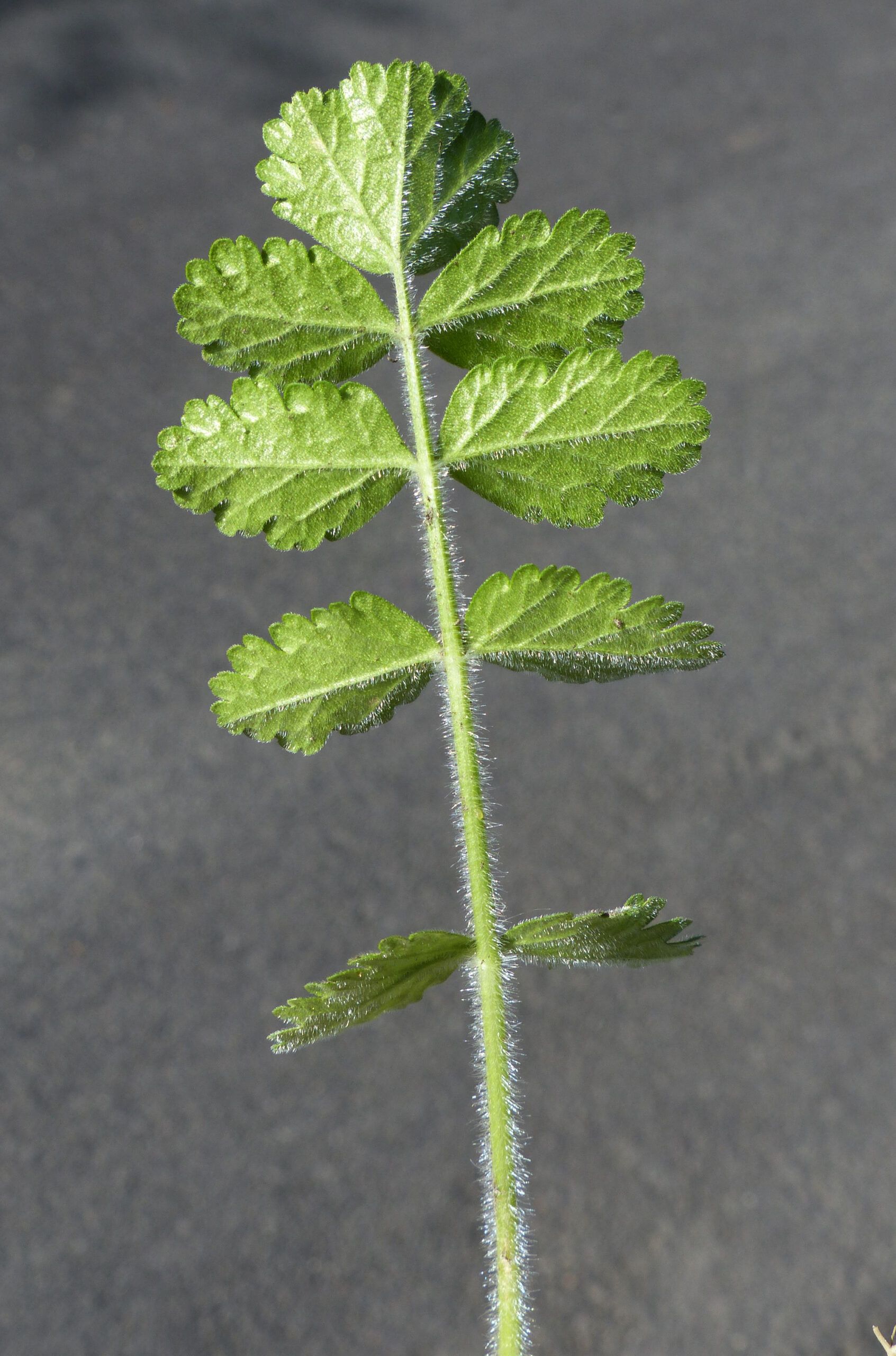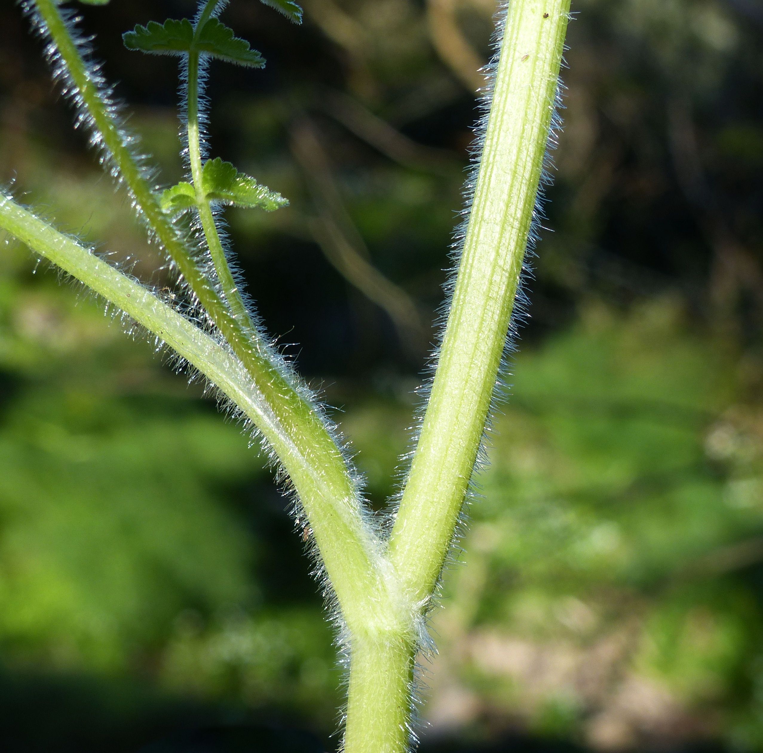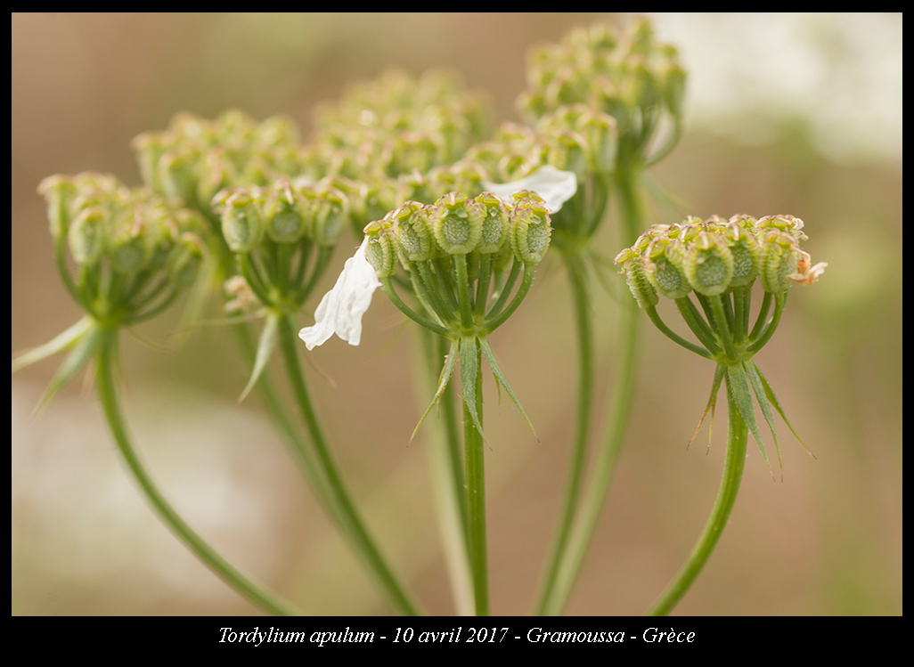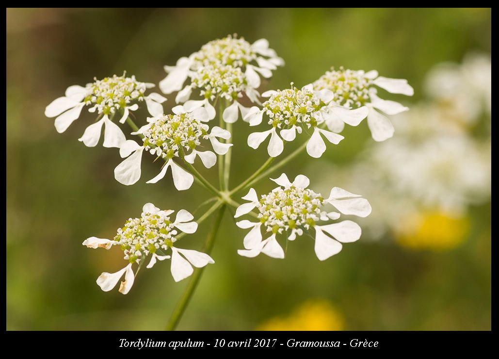 Tordylium apulum L., it is an annual herb, erect or ascending, up to 10-60 cm tall, softly and sparsely pubescent, stout much branched with striate or sub angular, densely hairy at the base, solid stem. Basal and lower cauline leaves unipinnate into broadly ovate or suborbicular, 1-2.5 x 0.8-1.5 cm, truncate or widely cuneate obtuse, deeply crenate or obtusely lobuled ultimate segments; upper cauline leaves divided into oblanceolate or linear obcuneate, sparsely pilose segments. Umbels (2-) 5-8 (-20)-rayed, on scabrous, terminal, 3-12cm long peduncles; rays ± equal, 1-4cm long, sub scabrous, patent-sub erect, bracts 4-6, subulate, 2-10 x 0.5-0.8 mm, patent, sparsely hispid, persistent. Umhellules 10-15-flowered. Pedicels thin, 3-4 (-5) mm long, hispidulous. Bracteoles akin to bracts but smaller in size. Petals white, obovate, one petal of outer flowers radiant, much enlarged, deeply and equally bilobed, 5-9 x 4-7 mm, appearing like 2 large petals, the other petals broadly oblong-obovate, as wide as long, entire or shallowly emarginate and incurved at lips. Anthers greenish. Stylopodium absent. Fruit broadly elliptic or suborbicular, 5-10 x 5-8 mm, pale brown, narrowly notched at tips; mericarps with vesicular hairs on dorsal sides, strongly thickened and moniliform on pallid margins; ribs obscure; commissural oil ducts 8-10.