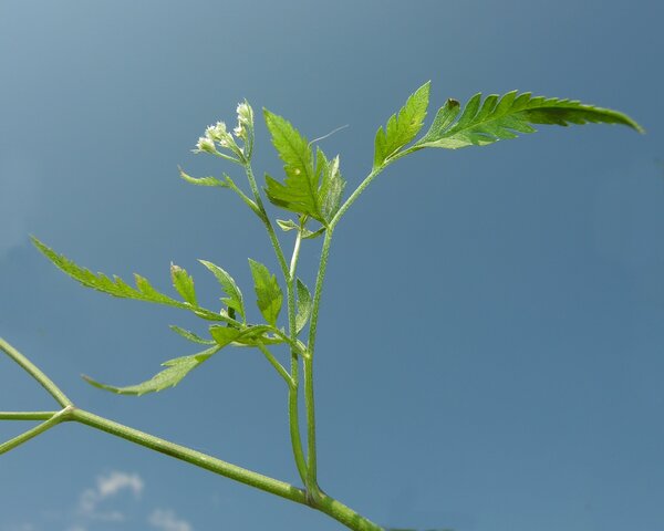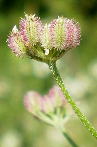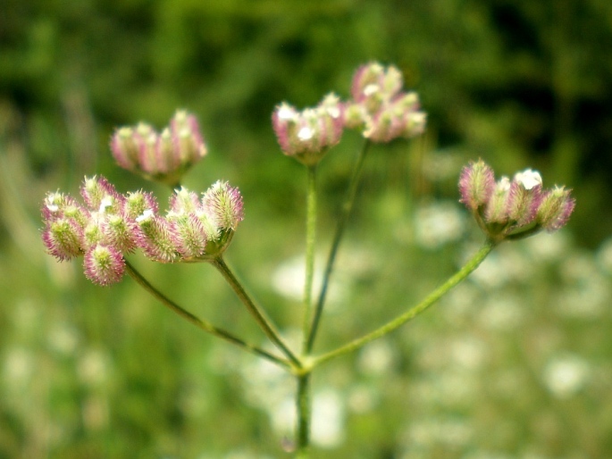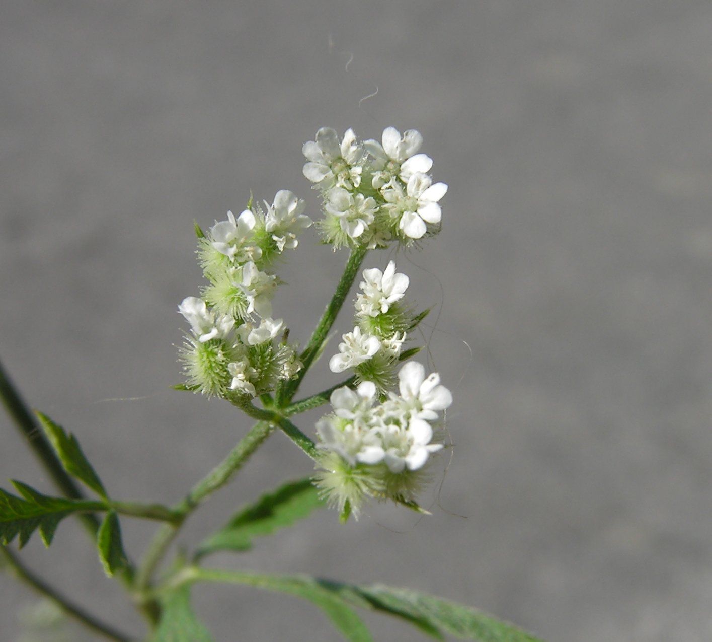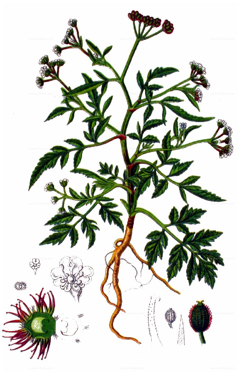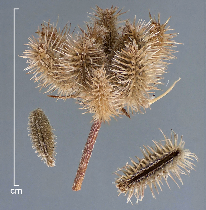 Torilis arvensis (Huds.) Link, it is an annual herb, up to 40-80 (-100) cm tall, erect, sparingly branched, usually sparingly hispid with appressed, simple, short hairs; stems furrowed, glabrous to sparingly hairy, especially above with short, retrorse, setaceous hairs. Leaves sparsely appressed-hairy with forward pointing hairs, 2-3-pinnatisect, ± homomorphic, gradually decreasing in size above; the lower ones with 2-3 pairs of pinnatisect or partite or-fid segments; the upper leaves ternatisect (to simple); segments broadly lanceolate, 1-4 cm long. broadly lanceolate or linear-subulate, serrate, incised or lobed. Umbels long-peduncled, (3-) 4-12-rayed; rays 1-3 (-3.5) cm long. Bracts 0 (-1); bracteoles 3-several, nearly as long as the pedicels. hispid. Flowers 2 mm; petals pink or white, radiant; styles longer than stylopodium. Fruit 3-5 mm long, ovoid to ellipsoid, prickly with prickles white, usually unequal in size on the 2 mericarps, and directed somewhat upwards.