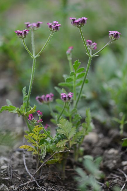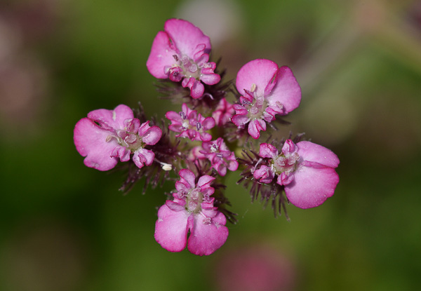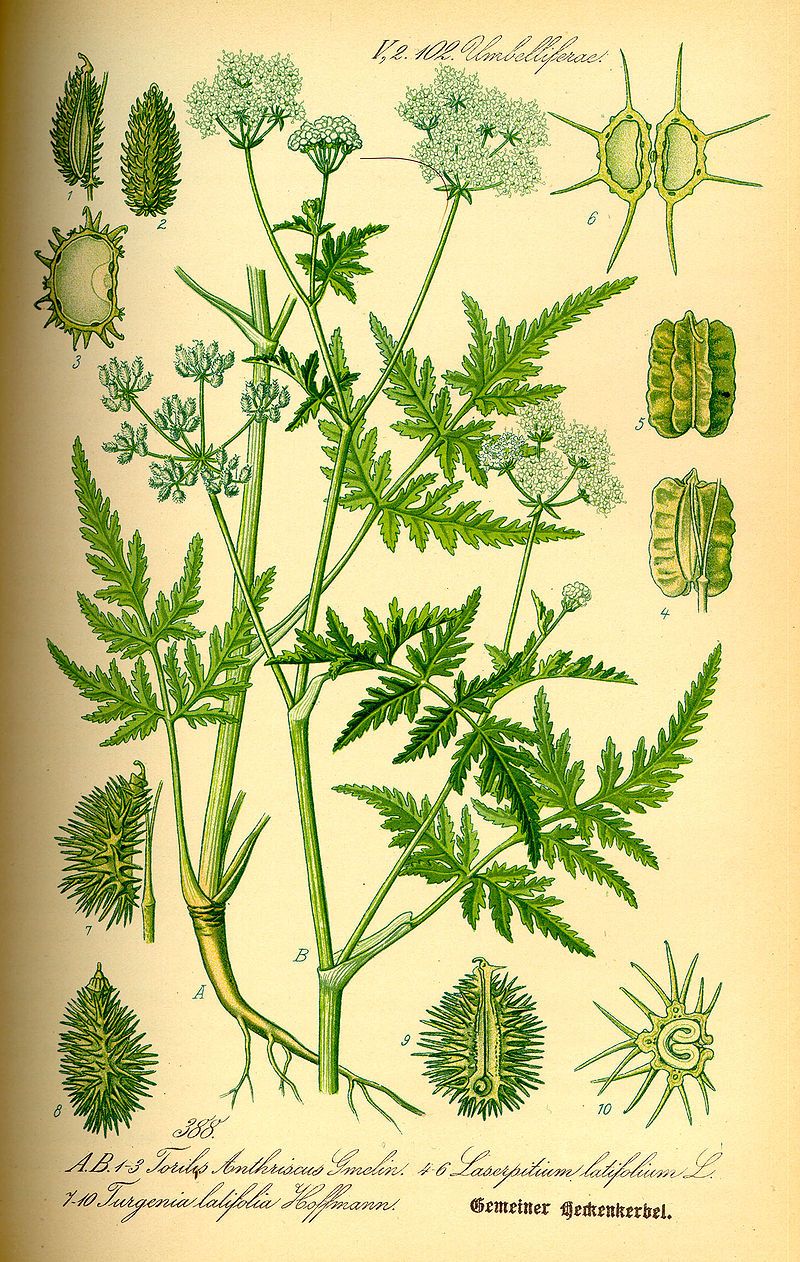 Turgenia latifolia (L.) Hoffm., it is an annual herb, hispid or setose-scabrous, up to 15-30 (-50) cm tall, erect to procumbent. dichotomously branched. Leaves 1-pinnate, setose on both surfaces, 5-10 cm long, sheathing at a base, lower withering early; segments (1-) 2-5 (-6) cm, oblong lanceolate, serrate to incised-lobed. Bracts and bracteoles usually 3-5, ovate lanceolate or-oblong, obtuse, scarious-margined, white, pubescent. Flowers c. 5 mm, across, pedieclled. Calyx-teeth evident. Petals white to rose-colored or purplish; Fruit 8-15 x 5-8 mm (including spines), papillose, usually ovoid, with scabrous spines 1.5-2 mm long, broadened at base and glochidiatc at apices.