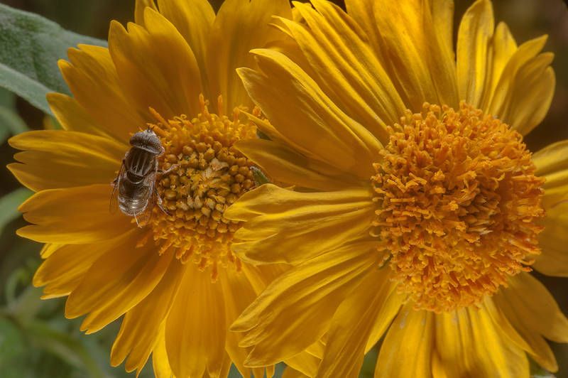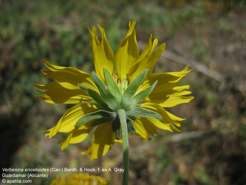 Verbesina encelioides (Cav.) Benth. & Hook.f. ex A.Gray , it is an annual herbs are growing up to 150 cm high. Stems are densely short-hairy. Petioles winged, wings dilated at the base to form a pair of stipule-like auricles. Leaf blades lanceolate to triangular-ovate, up to 10×7 cm, 3-veined, with a coarsely dentate margin, covered with appressed fine hairs especially on the lower surface, bases broadly cuneate to truncate, lower leaves are opposite and triangular, while the upper leaves are alternate and lanceolate. Peduncle subtended by leaf-like bracts. Heads are 2.5-5 cm in diameter, solitary at ends of long peduncles or in clusters of 2-3, paleaceous and involucres bracts 1-2 series, 7-15 mm long, linear-lanceolate to linear, appressed greyish hairy. Palea is 6-8 mm, linear, abruptly acuminate. Ray flowers 10-15/head, yellow, pistillate, rays elliptic-ovate, 1-2 cm long, 3-toothed at apex, disk flowers numerous, 8 mm long, yellow-orange, tubular, 5 toothed, hermaphrodite. Achenes flattened, grayish brown, pubescent, with 2 apical long fine appendages 1-2 mm long, achenes of 2 types, marginal achenes sterile, oblong, not winged, 5-6.5 mm long, central achenes obovate, broadly winged, 7-10 mm long including wings.