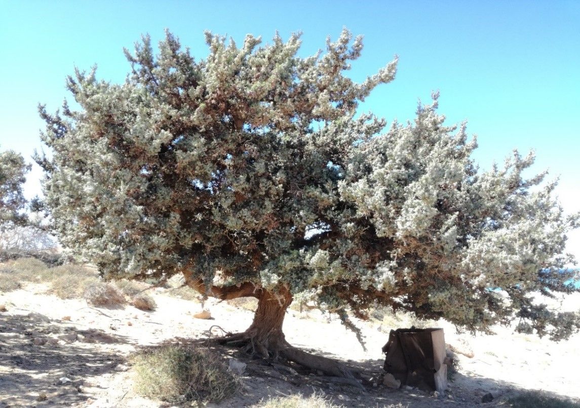 شجرة العرعر الشوكي شجرة محلية صغيرة دائمة الخضرة ثنائية المسكن يصل متوسط ارتفاعها حوالي 2.6 م، ومتوسط القطر عند مستوى الصدر حوالي 57.2 سم. التاج بشكل هرمي القلف لونه رمادي يتقشر الى اشرطة طويلة ،من الأنواع الخشبية النادرة الموجودة في الجبل الأخضر، ليبيا في شمال غرب مدينة درنة مسافة 8 كم . حيث تنتشر أفراد هذا النوع على المنحدر المواجه للشمال قريبة من شاطئ البحر، ولكن ظهرت أشجار نامية حديثاً على امتداد الطريق الجبلي وعلى امتداد المنعطفات الجبلية للطريق غرب درنه ، كم سجلت بعض أفراد هذا النوع نامية بمنطقة رأس الهلال وتحديداً بوادي مرقص في مجاميع متفرقة، مما يدل على ان هذا النوع له متطلبات بيئية مرنة، ويوجد أيضاً هذا النوع نامياً شرق مدينة طرابلس بحوالي 35 كم على ساحل البحر بمنطقة سيدي بالنور